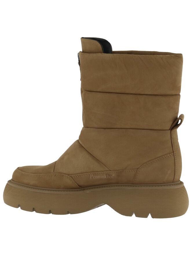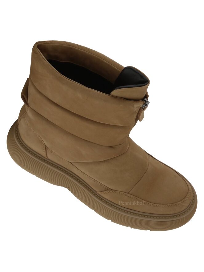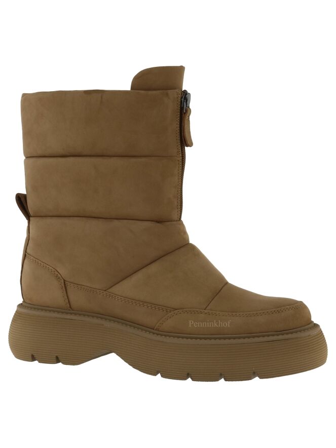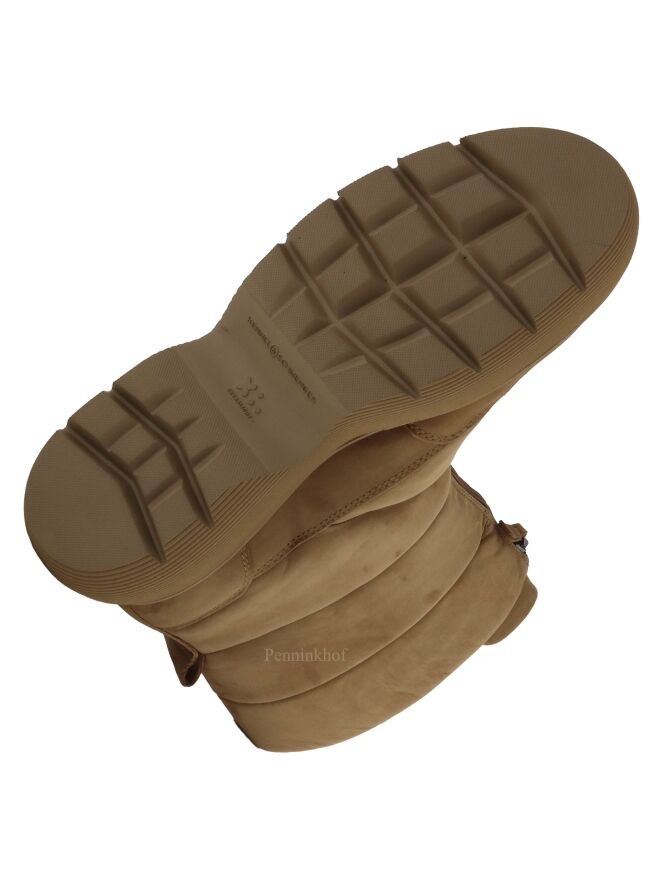 Snowboots à mi-mollet de la marque Kennel & Schmenger, de couleur chamois, doté d'une semelle sportive couleur chamois. L'ouverture se fait à l'aide d'un zip situé à l'avant. La snowboots est ornée de quatre surpiqûres décoratives. Intérieur doublé cuir.