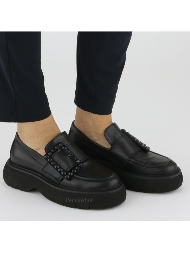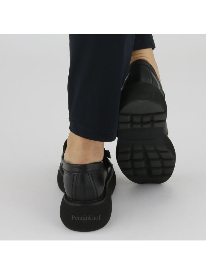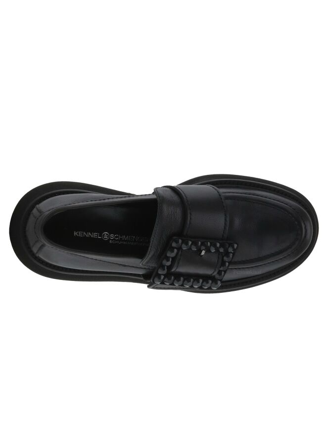 Chaussure de la marque Kennel & schmenger, en cuir de couleur noire. Une grande boucle rectangulaire à clous noirs brillants orne l'avant pied. La semelle est doucement crantée. Intérieur doublé cuir.