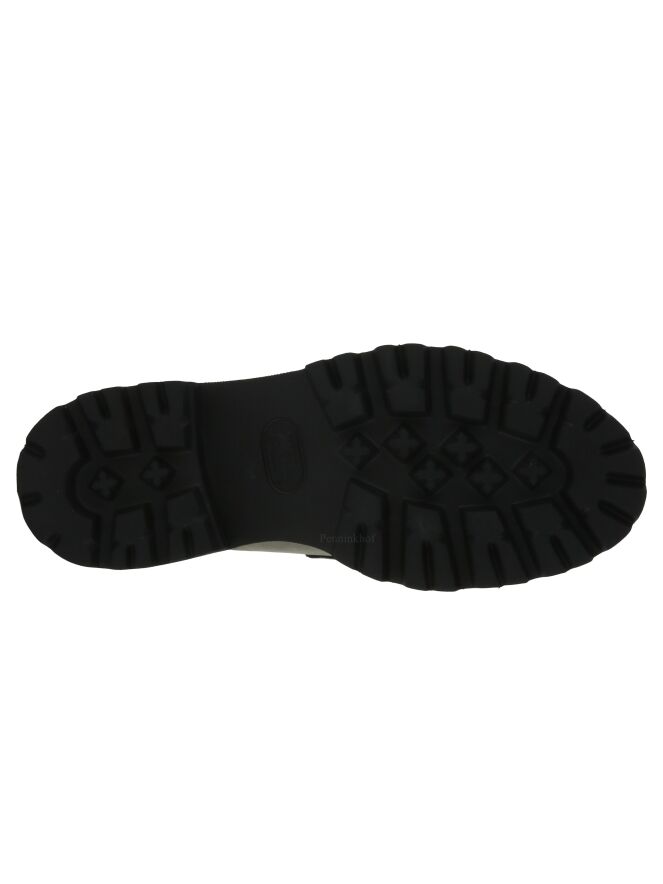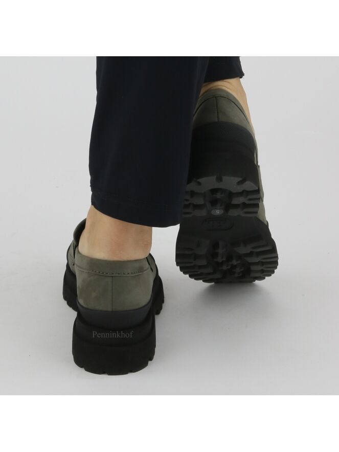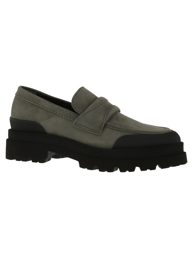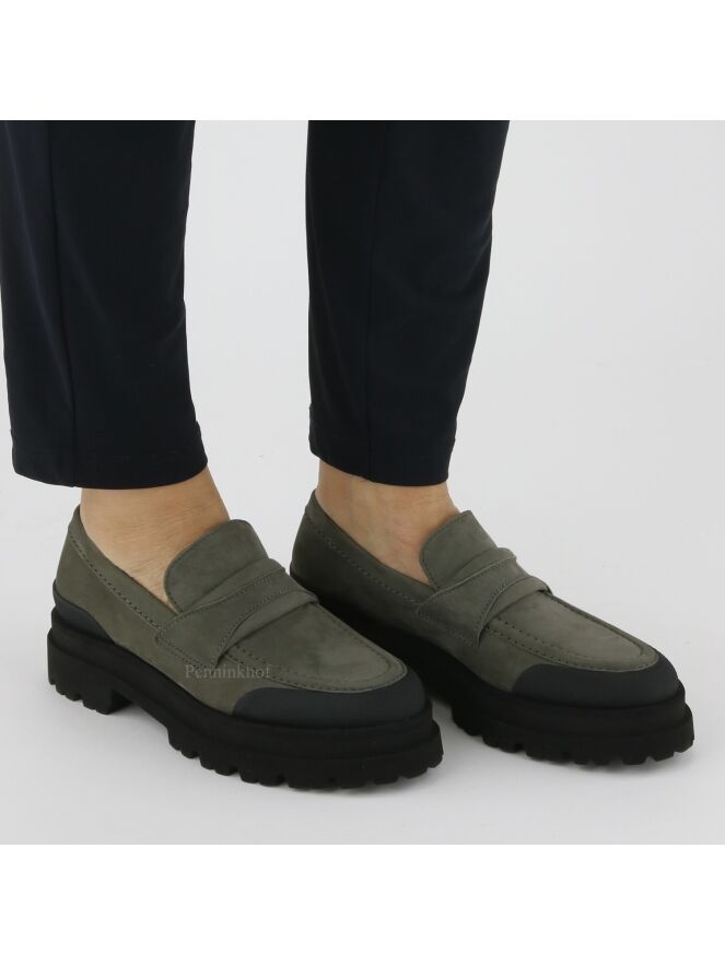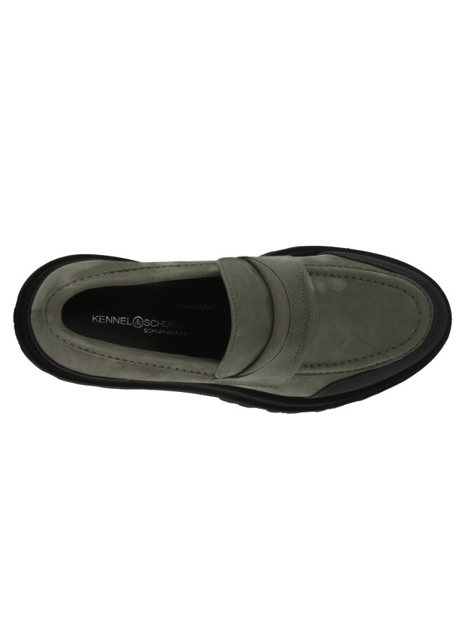 Mocassin de la marque Kennel & schmenger, en nubuck de couleur grise. Un empiècement noir nervuré orne le bord du nez et le talon arrière. La semelle est fortement crantée. Intérieur doublé cuir.