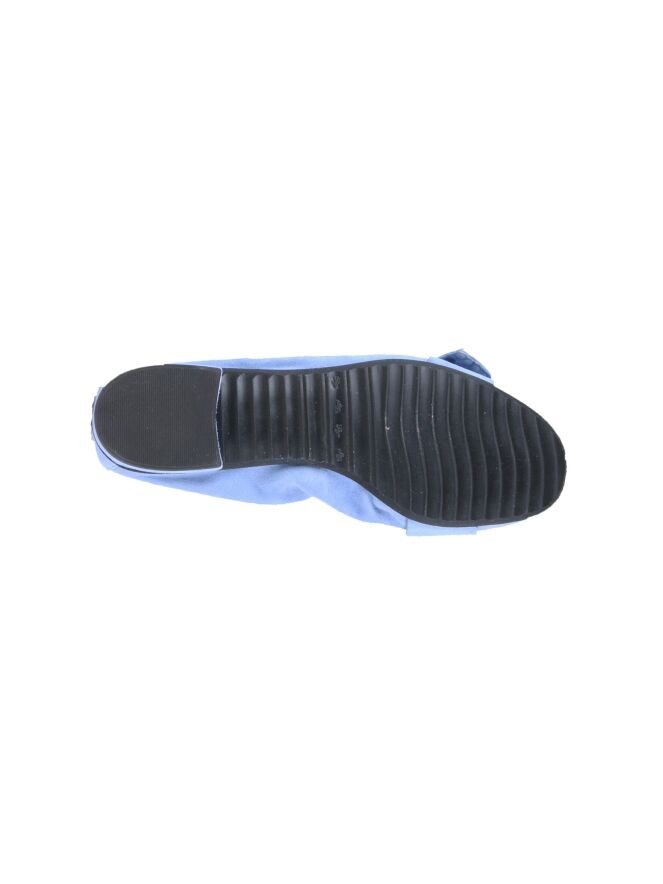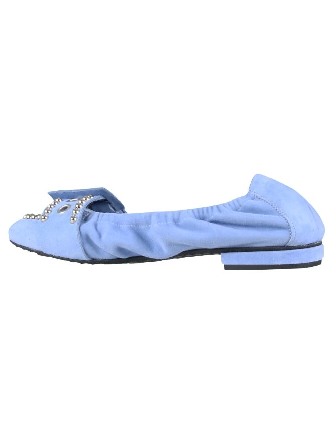 Ballerine de Kennel & Schmenger, en daim camoscio de couleur bleu lavande. L'avant-pied est orné d'une large boucle ressemblant à une ceinture, bordée de petites boules sphériques argentées, qui décorent également le nez de la chaussure. Un élastique est incorporé aux bords de la ballerine. Intérieur non doublé.