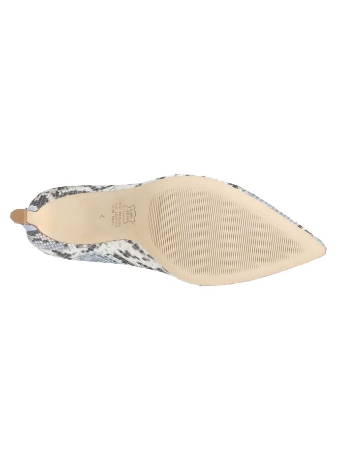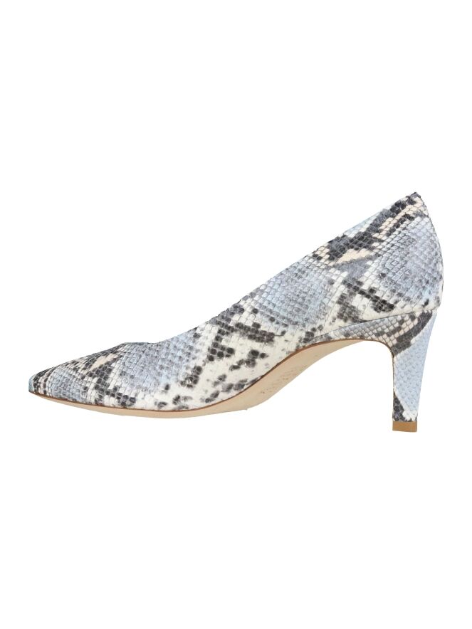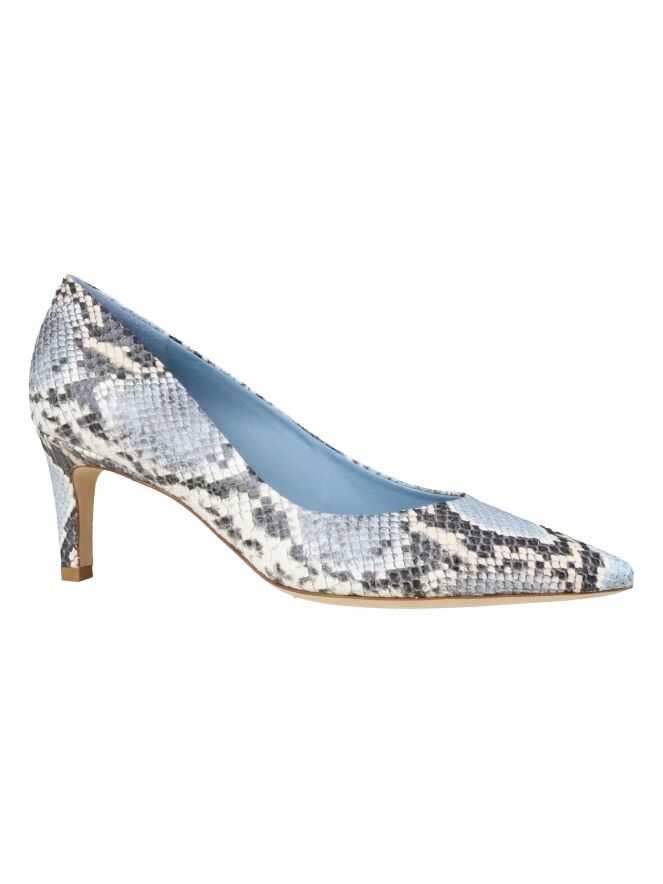 Escarpin de la marque Kennel & Schmenger, imprimé d'un motif de peau de python de couleur bleu pâle, blanc crème et gris, qui recouvre également le talon de 6 cm. Le nez pointu apporte élégance à la chaussure. Intérieur doublé cuir.