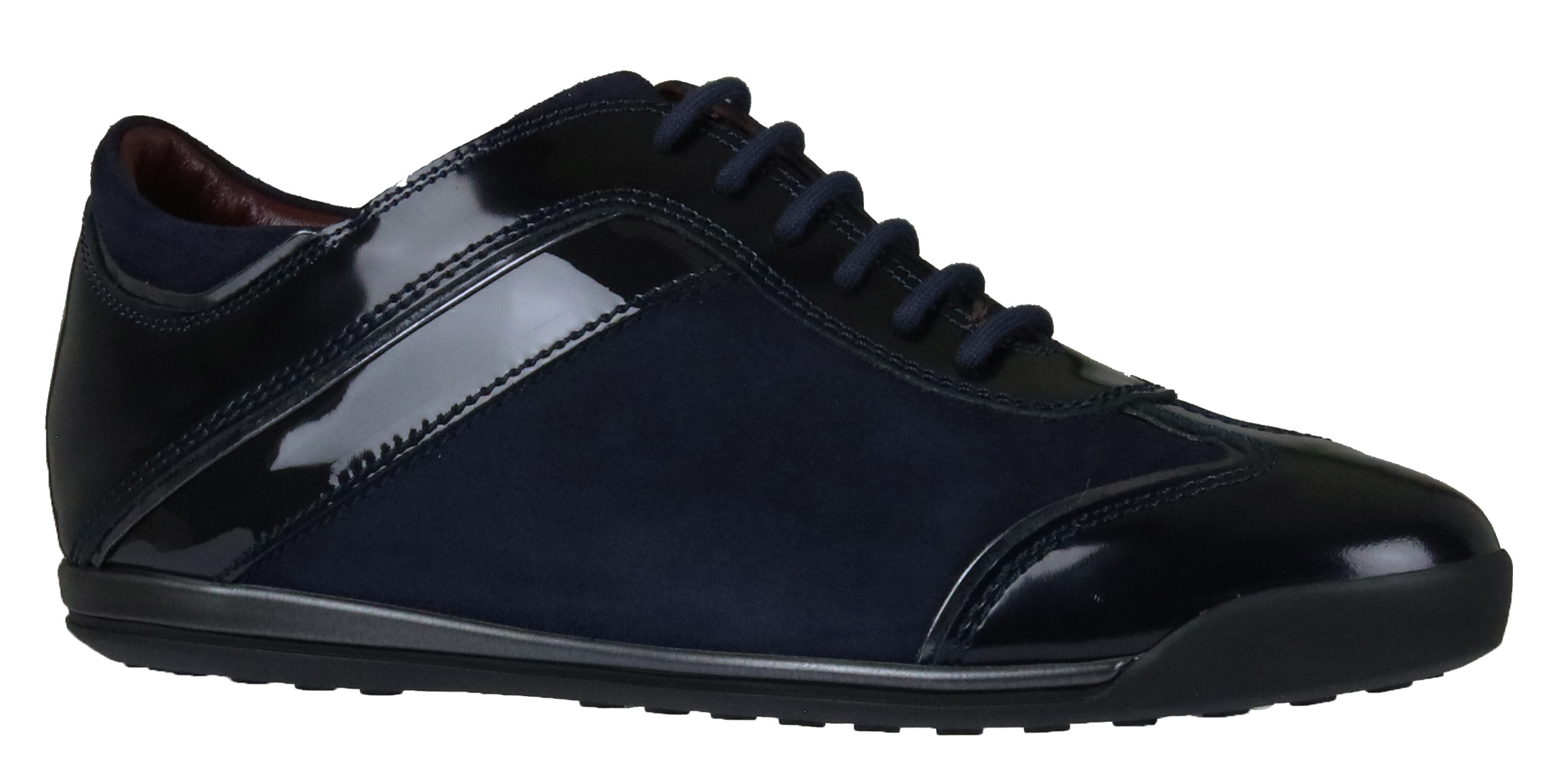 Sneaker basse de la marque La Cabala, de couleur bleu marine, avec une alternance de cuir verni bleu marine sur les côtés et de daim camascio sur le reste de la chaussure. La semelle intérieure est amovible. L'intérieur est doublé de cuir.