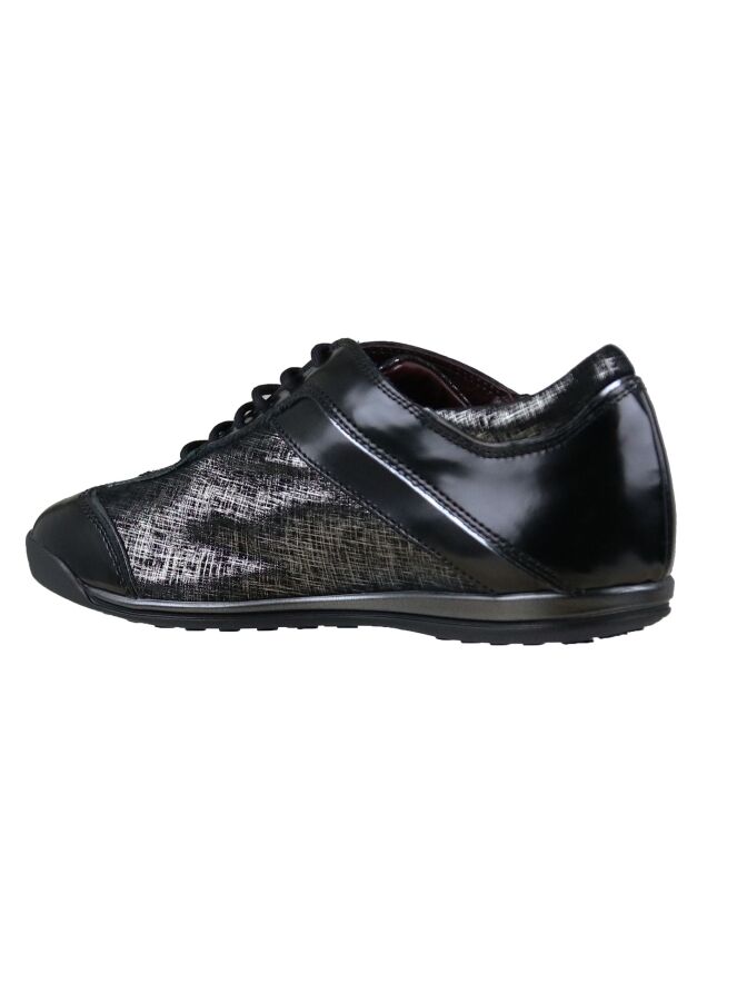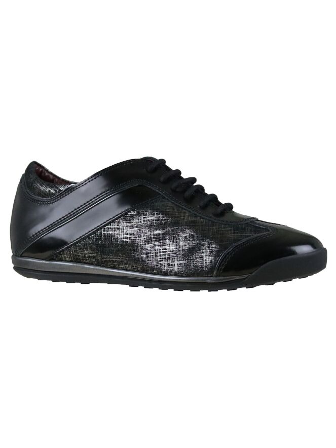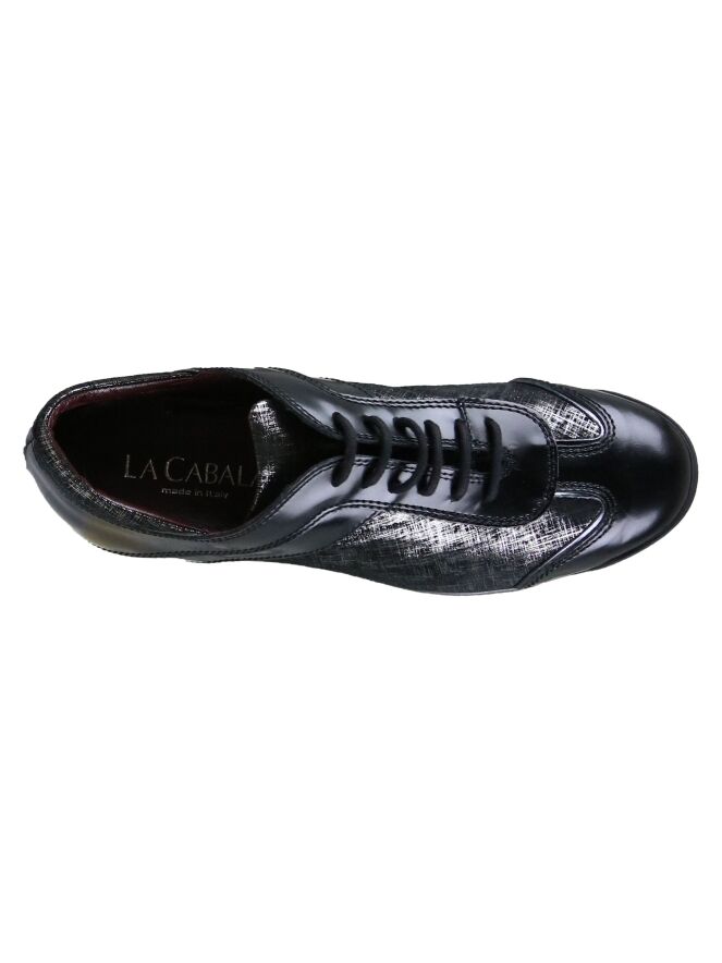 Sneaker basse de la marque La Cabala, de couleur noire avec une alternance de cuir noir spazzolato satiné sur les côtés et de cuir imprimé de griffures argentées sur le reste de la chaussure. La semelle intérieure est amovible. L'intérieur est doublé de cuir.
