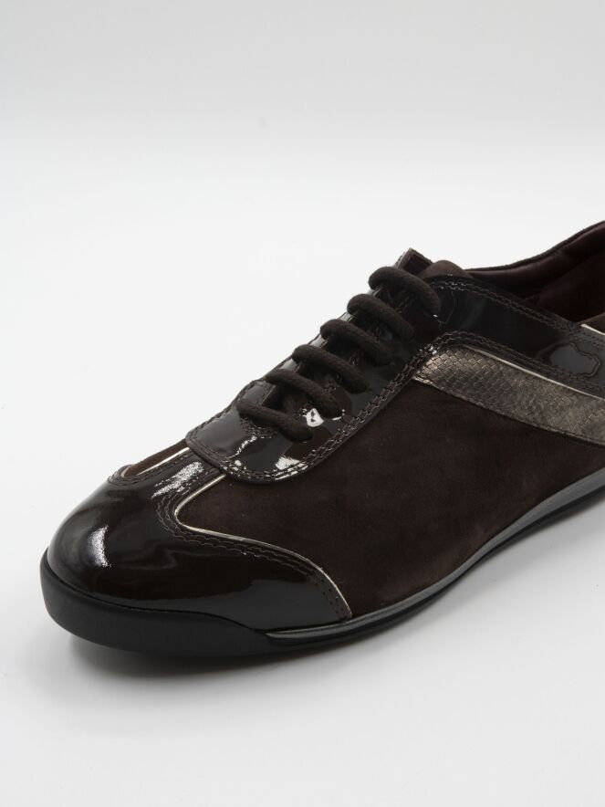 Sneaker basse de la marque La Cabala, en daim camoscio de couleur Marron moka. Le tour de la tige, le talon et la pointe de la chaussure sont en cuir verni Marron moka. Sur les côtés, elle est ornée d'une bande en biais imprimée d'un motif peau de serpent couleur bronze. La semelle intérieure est amovible. L'intérieur est doublé de cuir.