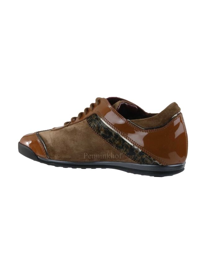 Sneaker basse de la marque La Cabala, en daim camoscio de couleur cognac. Le tour de la tige, le talon et la pointe de la chaussure sont en cuir noir. Sur les côtés, elle est ornée d'une bande en biais imprimée d'un motif peau de léopard aux multiples nuances de marron et de noir. La semelle intérieure est amovible. L'intérieur est doublé de cuir.