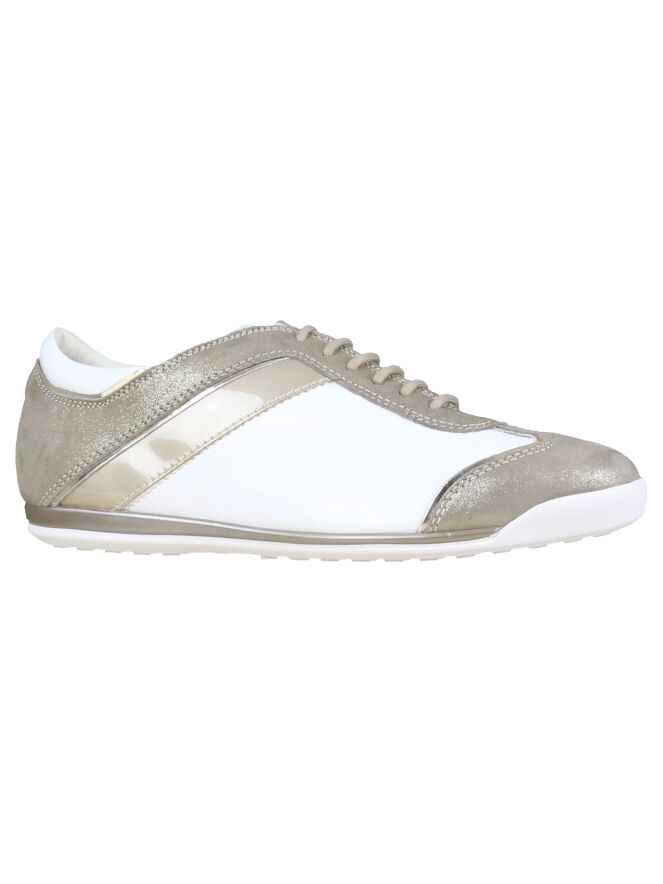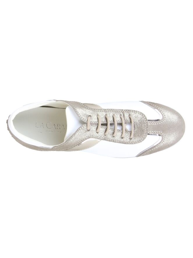 Sneaker de la marque La Cabala en cuir blanc et cuir métallisé couleur taupe. Une bande taupe brillante décore le côté de la chaussure. La semelle intérieure est amovible. Intérieur doublé cuir.