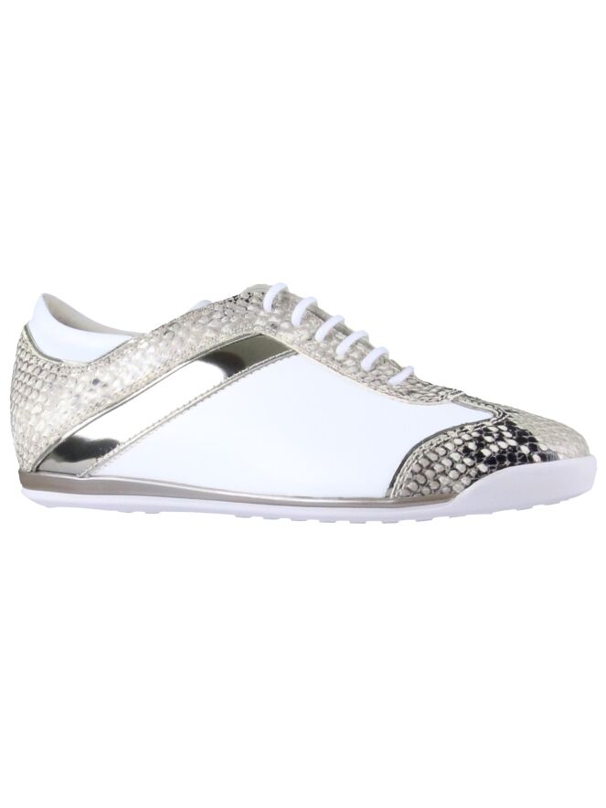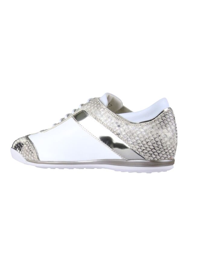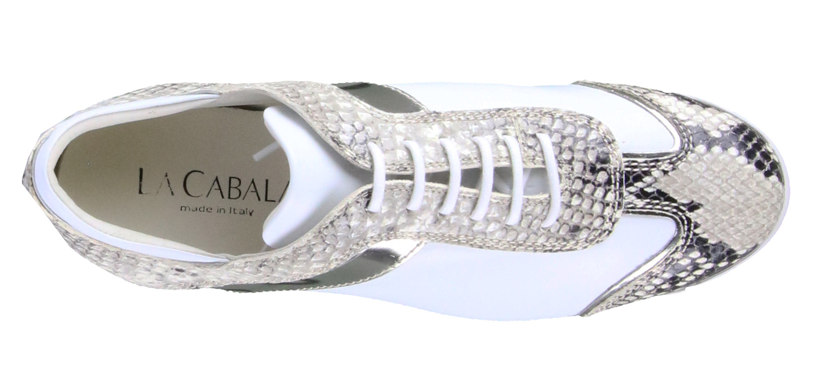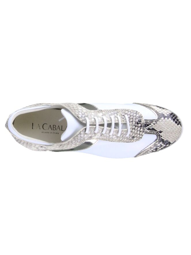 Sneaker de la marque La Cabala en cuir blanc. Un imprimé peau de python de couleur taupe orne la tige, le talon et le nez. Une bande argentée décore le côté de la chaussure. La semelle intérieure est amovible. Intérieur doublé cuir.