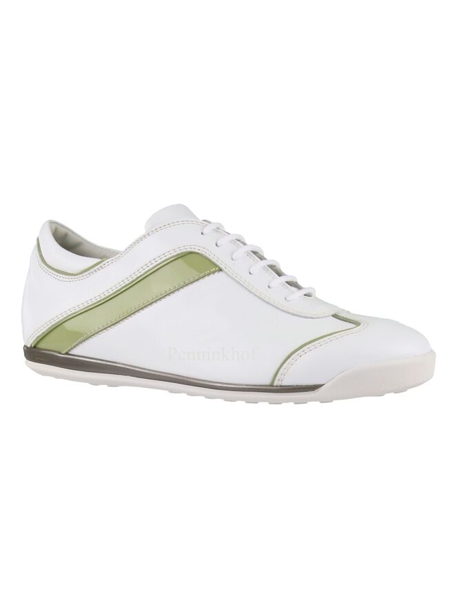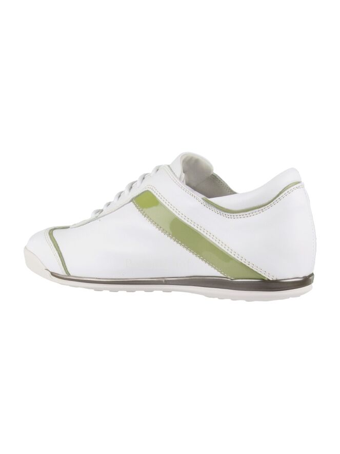 Sneaker de la marque La Cabala, en cuir blanc. Les côtés présentent un passepoil vert pistache en biais et cuir verni au talon et le long du pied. La semelle intérieure est amovible. L'intérieur est doublé de cuir.