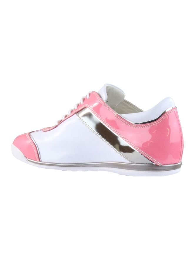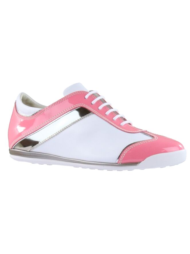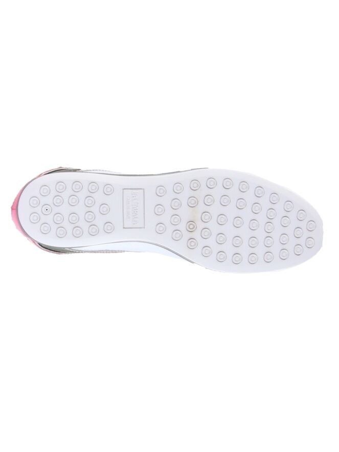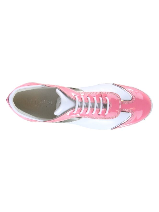Sneaker de la marque La Cabala en cuir blanc et verni rose. Une bande argentée décore le côté de la chaussure. La semelle intérieure est amovible. Intérieur doublé cuir.