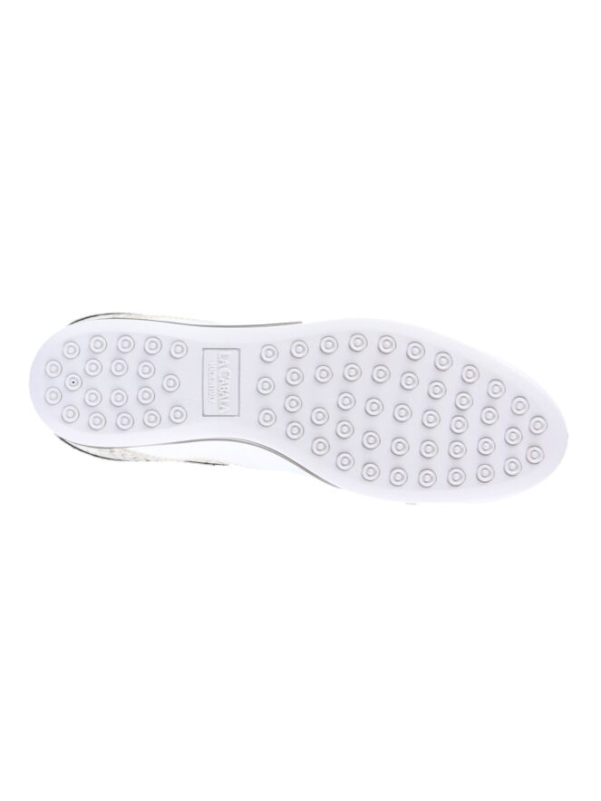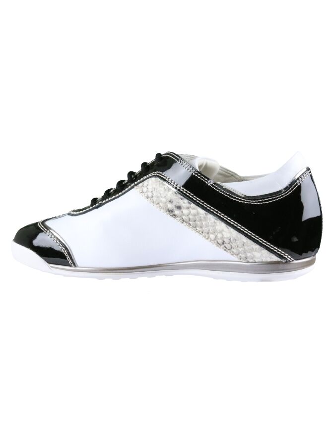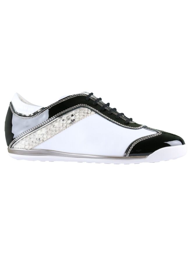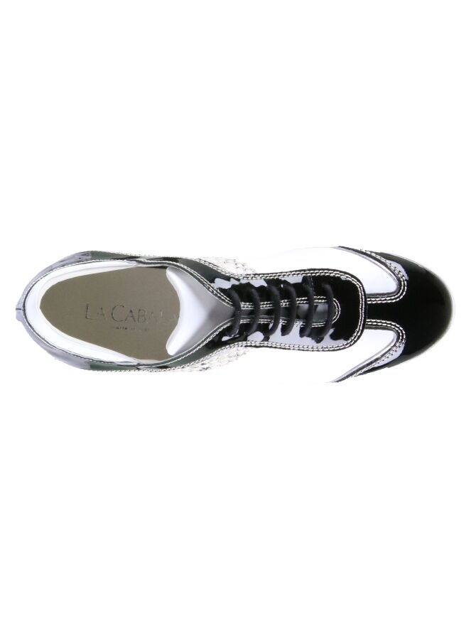 Sneaker de la marque La Cabala en cuir blanc. Du cuir vernis de couleur noire orne la tige, le talon et le nez. Une bande imprimée peau de python de couleur taupe décore le côté de la chaussure. La semelle intérieure est amovible. Intérieur doublé cuir.