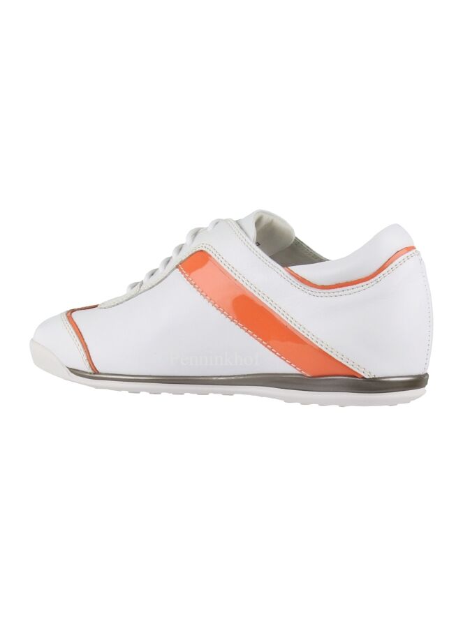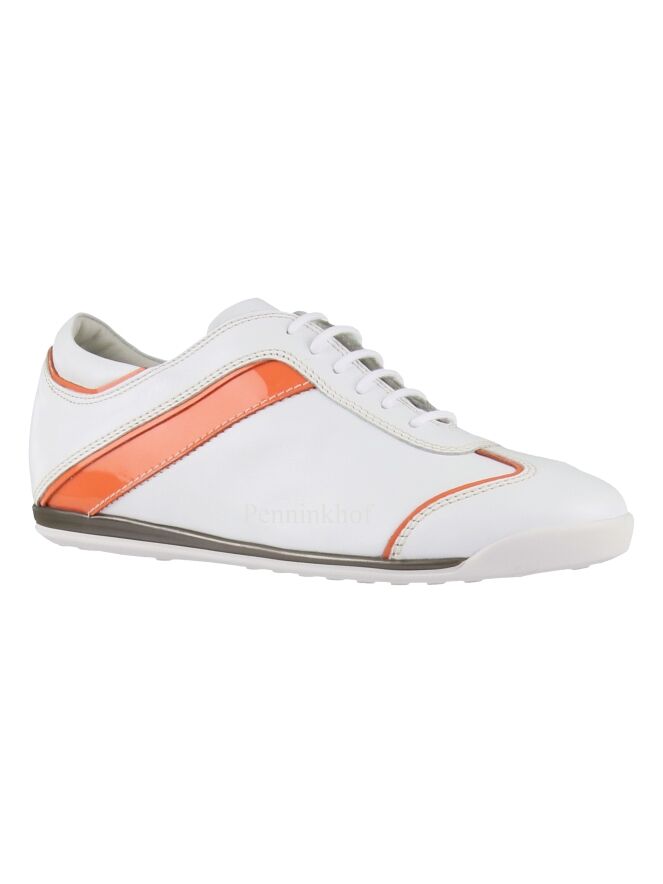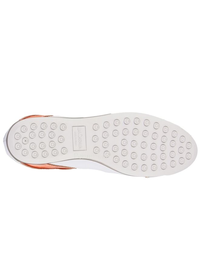 Sneaker de la marque La Cabala, en cuir blanc. Les côtés, le talon et le long du pied avant présentent un passepoil orange en cuir verni. La semelle intérieure est amovible. L'intérieur est doublé de cuir.