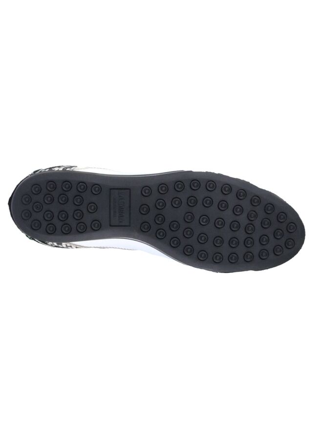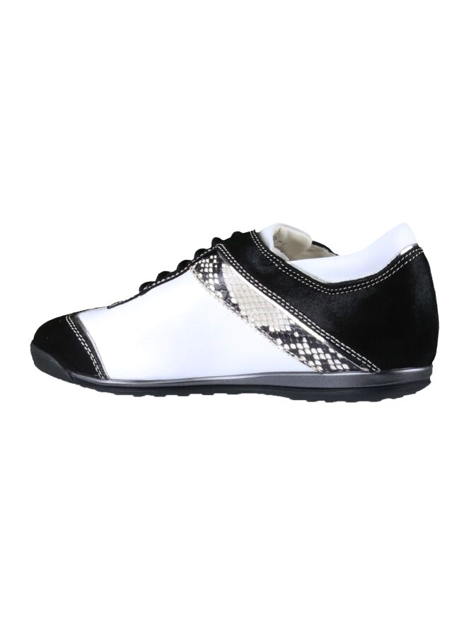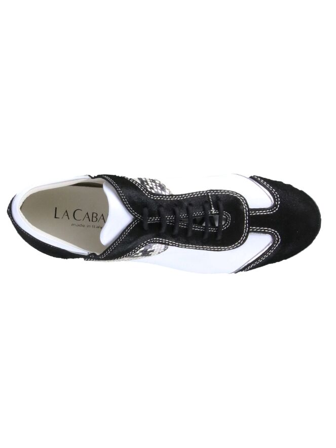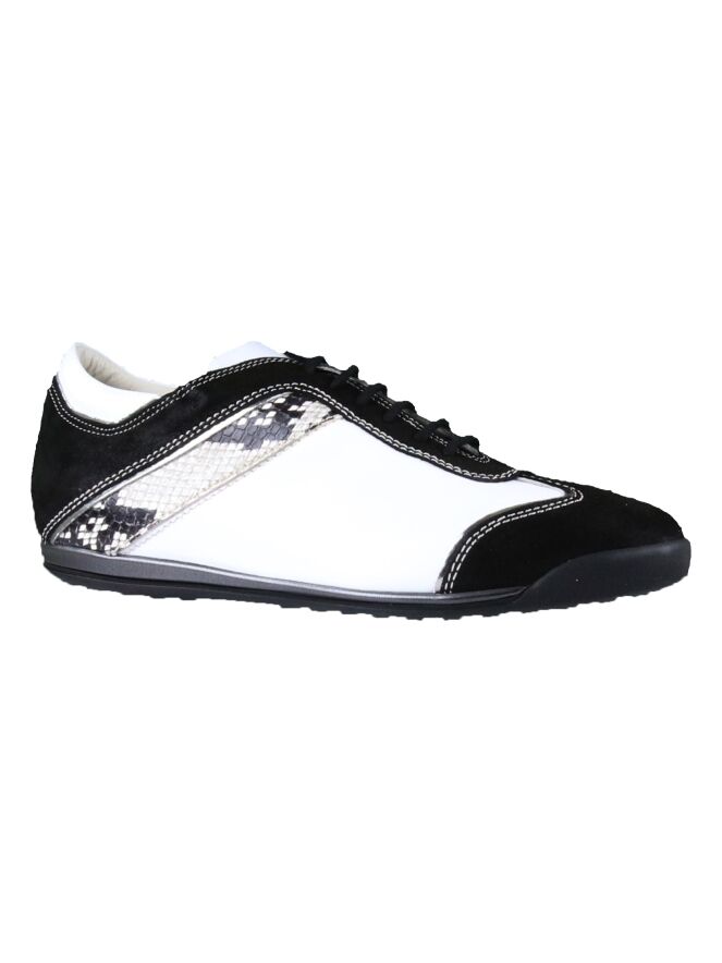 Sneaker de la marque La Cabala en cuir blanc et nubuck couleur noire. Une bande imprimée peau de python de couleur taupe décore le côté de la chaussure. La semelle intérieure est amovible. Intérieur doublé cuir.
