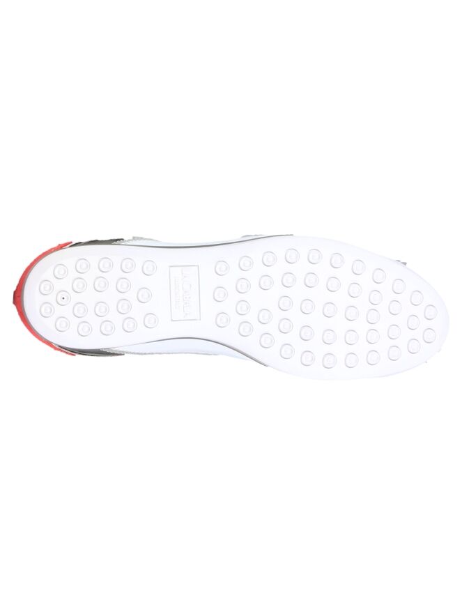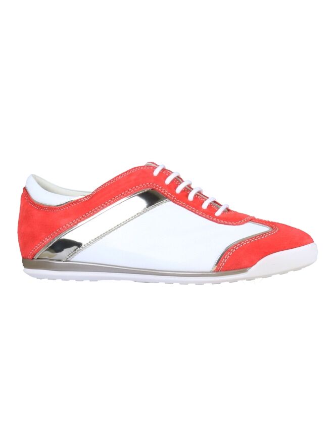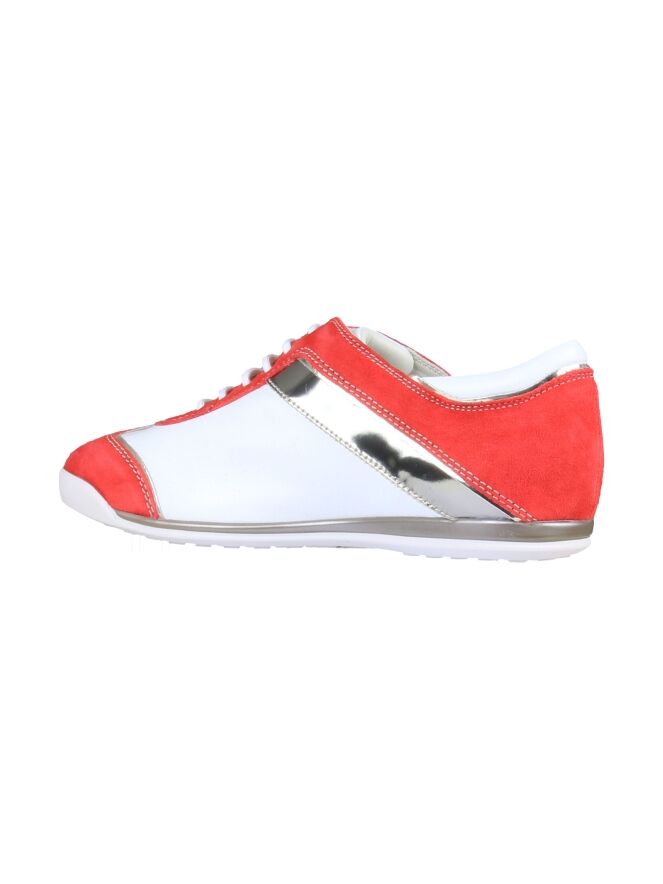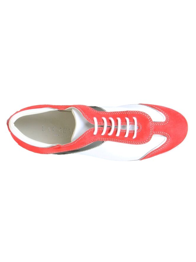 Sneaker de la marque La Cabala en cuir blanc et nubuck couleur rouge corail. Une bande argentée décore le côté de la chaussure. La semelle intérieure est amovible. Intérieur doublé cuir.