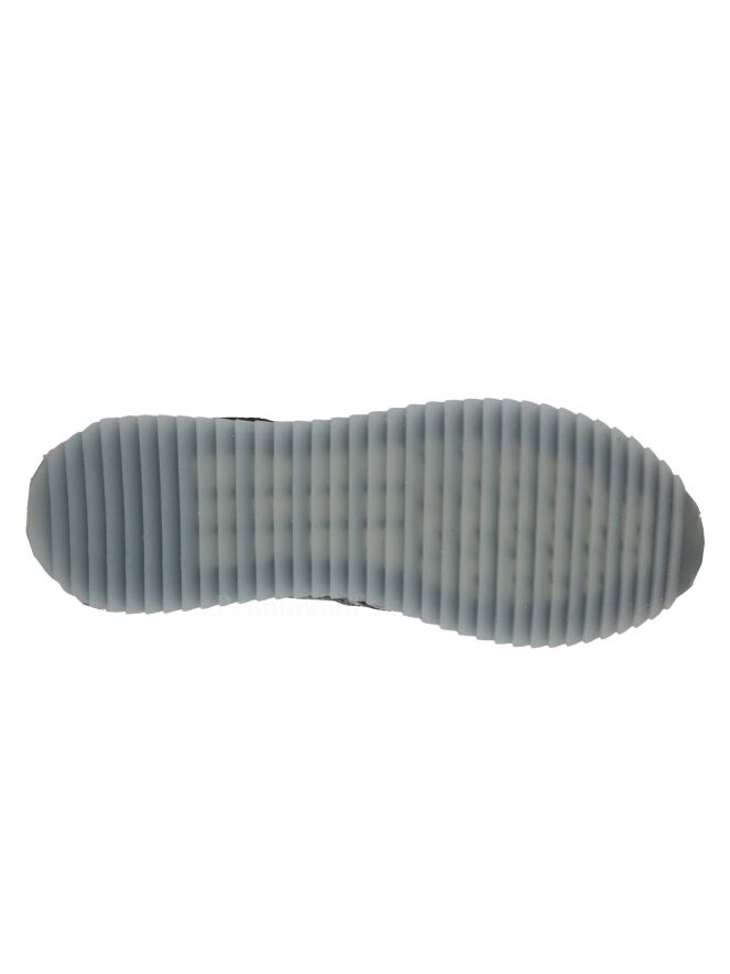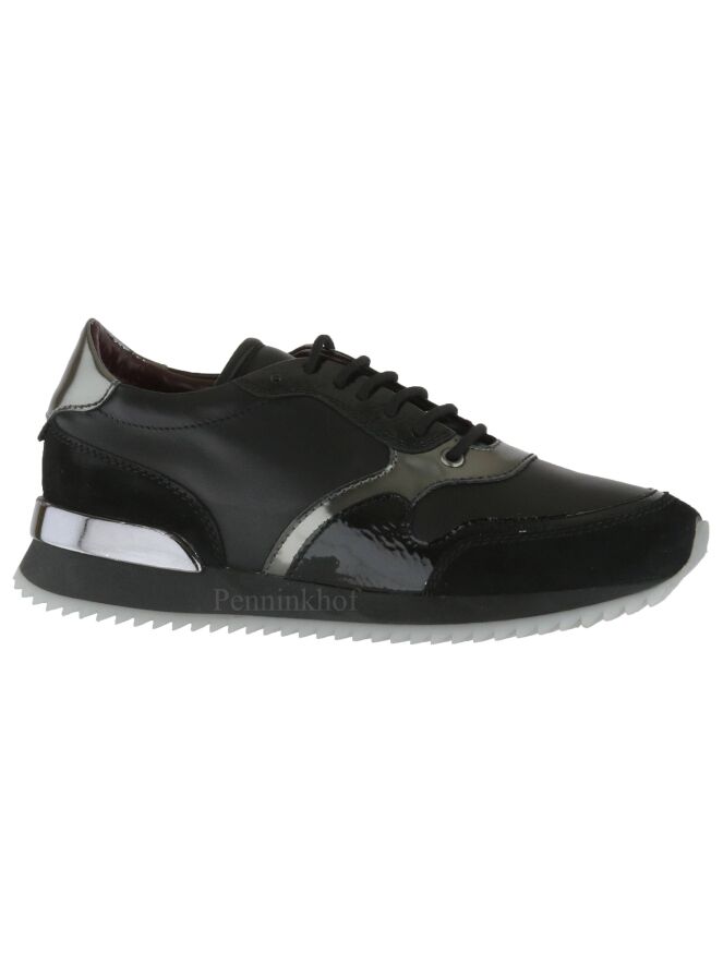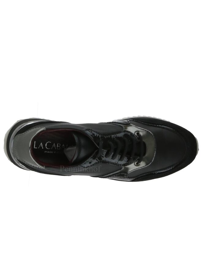 Sneaker de la marque La Cabala, en cuir de couleur noire. Du nez aux côtés, le daim camoscio noir est garni d'une bordure en cuir verni noir. Le long de la dentelle se trouve un passepoil de couleur nickel. Sur le talon se trouvent 2 empiècements de couleur nickel. La semelle à grain fin est de couleur gris clair et gris foncé. L'intérieur est doublé de cuir et la semelle intérieure est amovible.