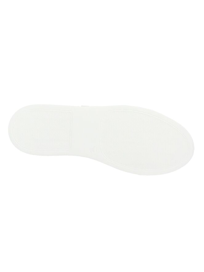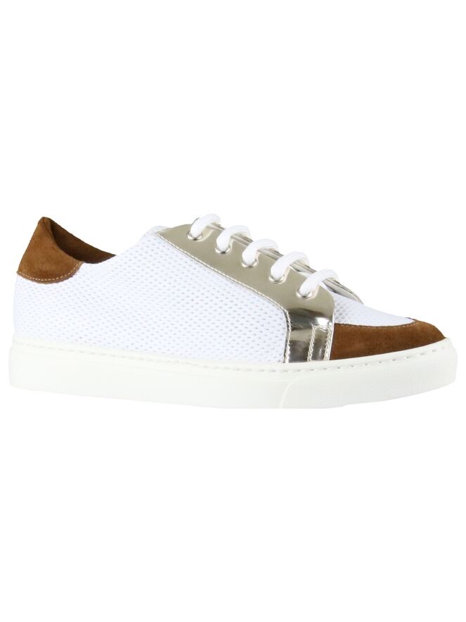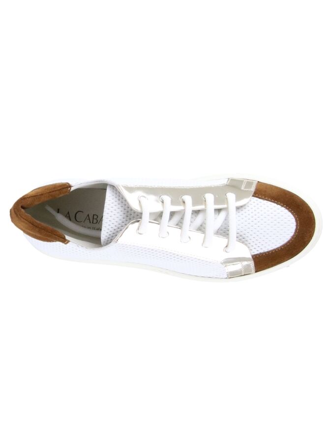 Sneaker blanche de la marque La Cabala. Le cuir est finement perforé. Le devant du nez et le talon sont bordés d'une large bande en daim de couleur cognac. Une garniture vernis argentée orne les épais lacets blancs de chaque côté. La semelle extérieure est de couleur blanc crème. La semelle intérieure est amovible.