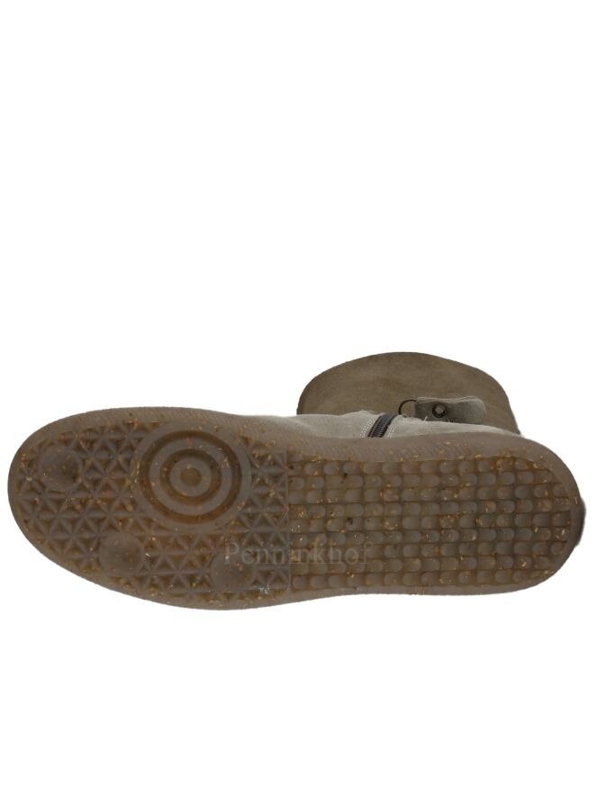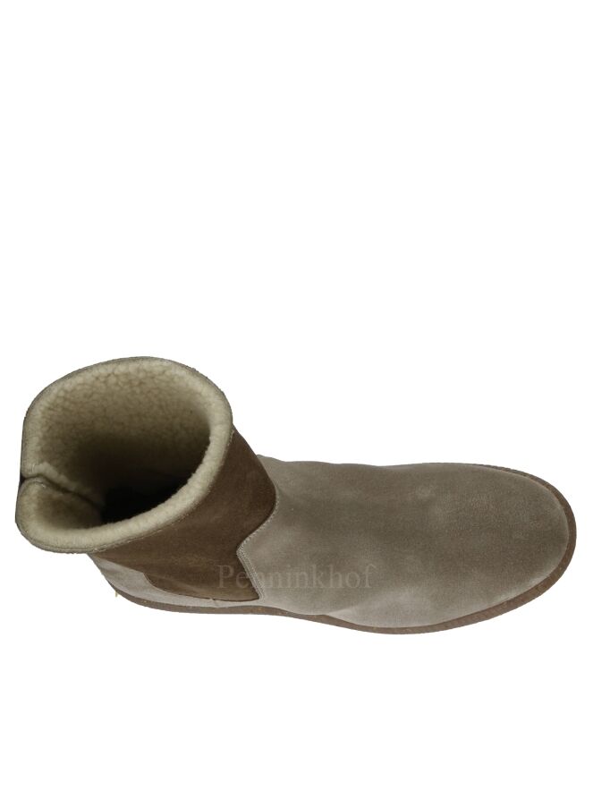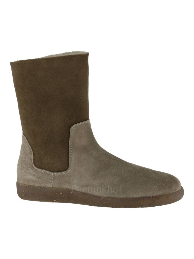 Botte mi-haute de la marque La Cabala, en deux nuances taupe. Le pied avant est de couleur taupe clair et la tige de couleur taupe foncé. L'intérieur du manche est doublé d'une imitation de fourrure en mouton retourné.