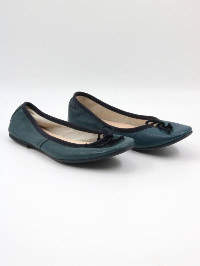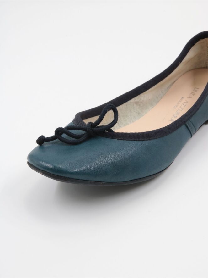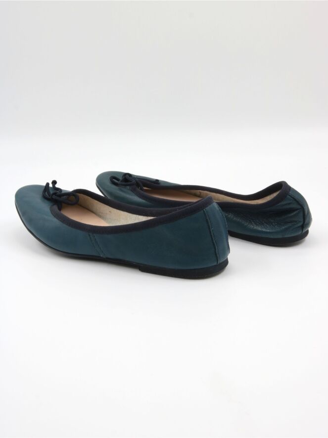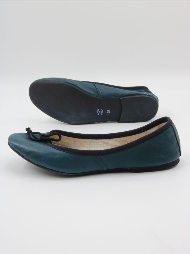 Une ballerine échancrée de Linea Azzurra en bleu pétrole. Un biais élastique est cousu le long du bord de la tige. Un petit nœud décoratif orne l’avant du pied. L’intérieur n’est pas doublé.