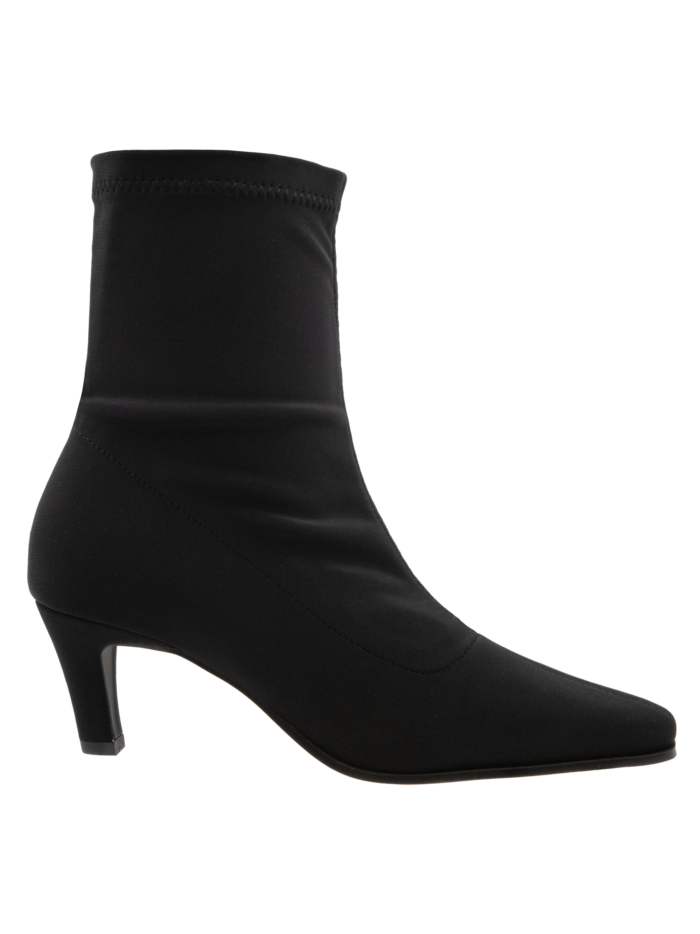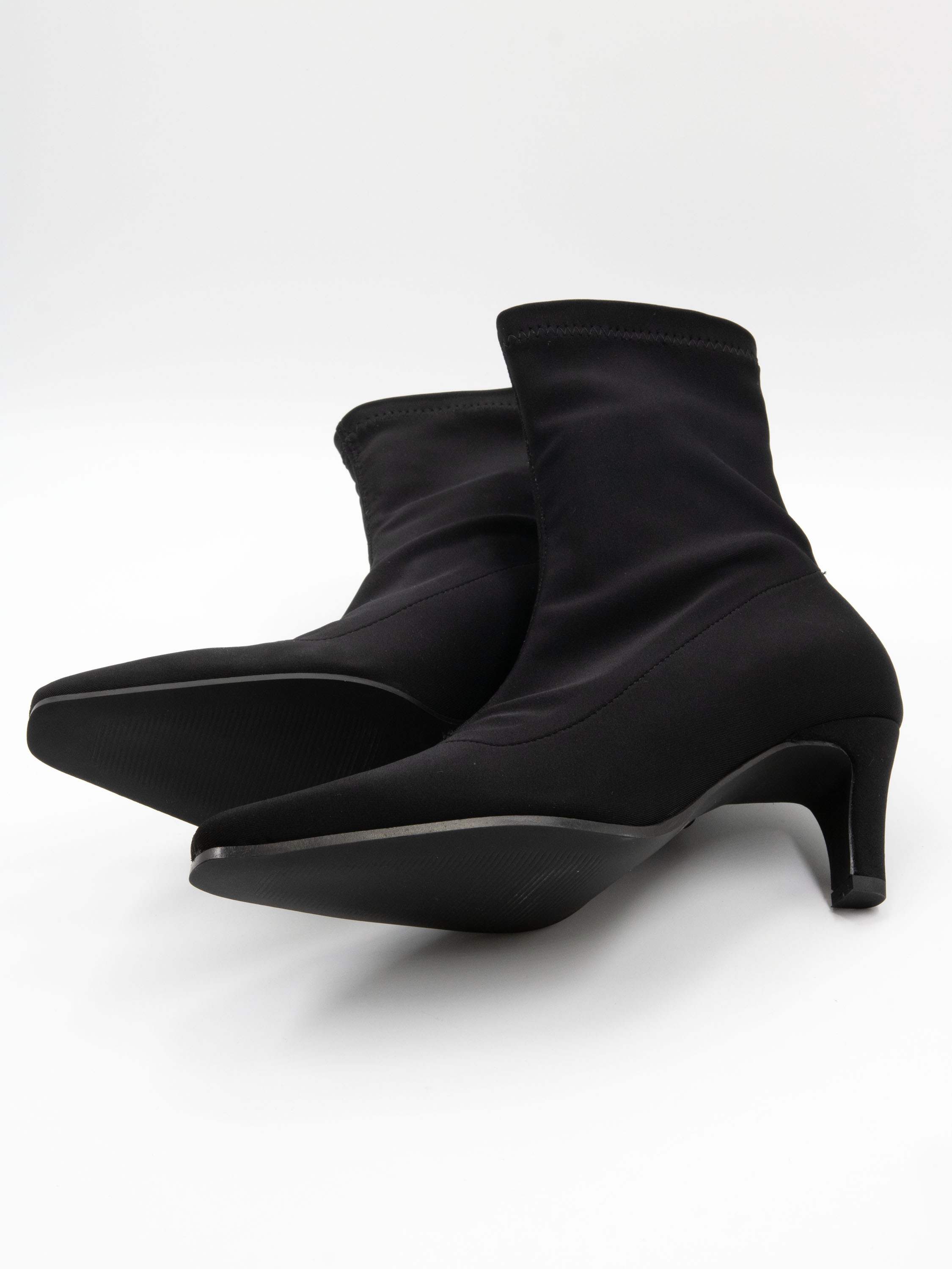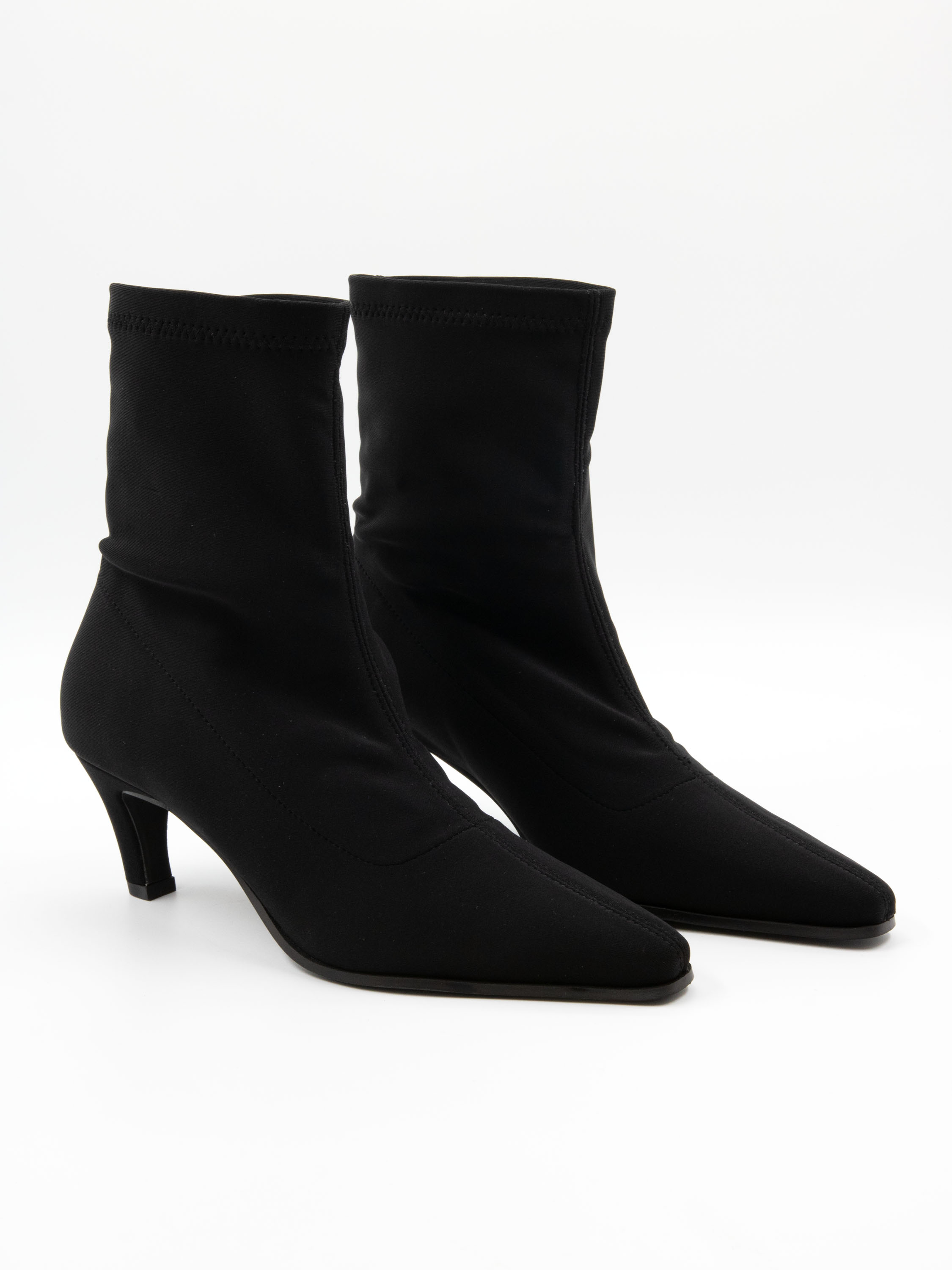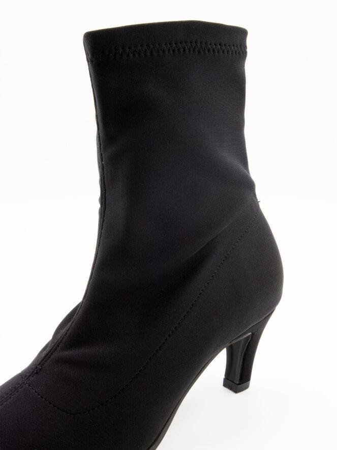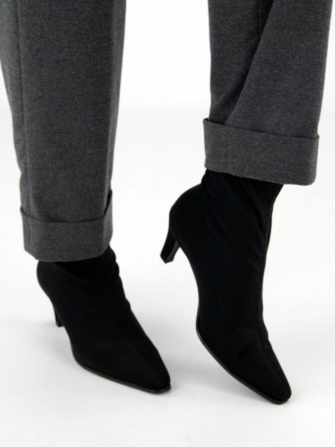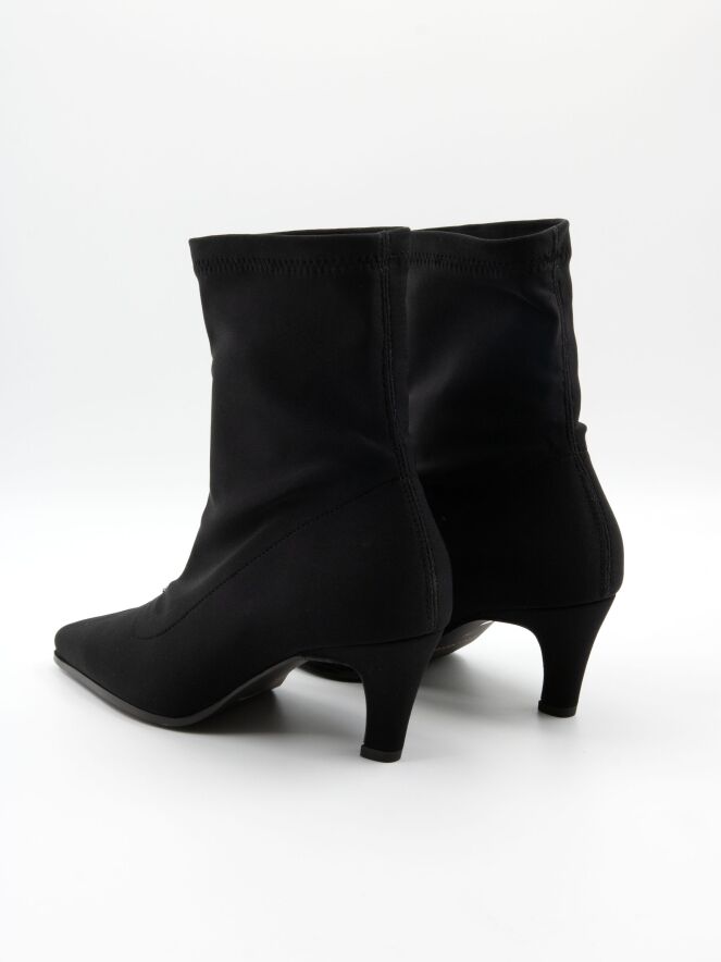 Une bottine courte de Madore en tissu élastique. Elle présente un bout pointu et élancé, tandis que la matière extensible épouse élégamment le pied.