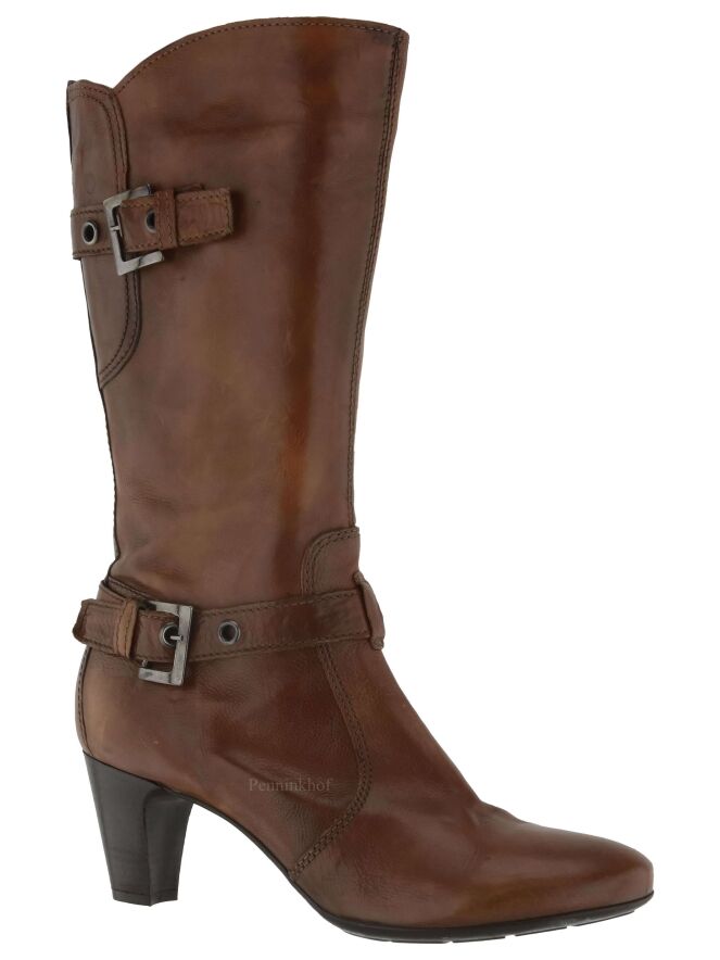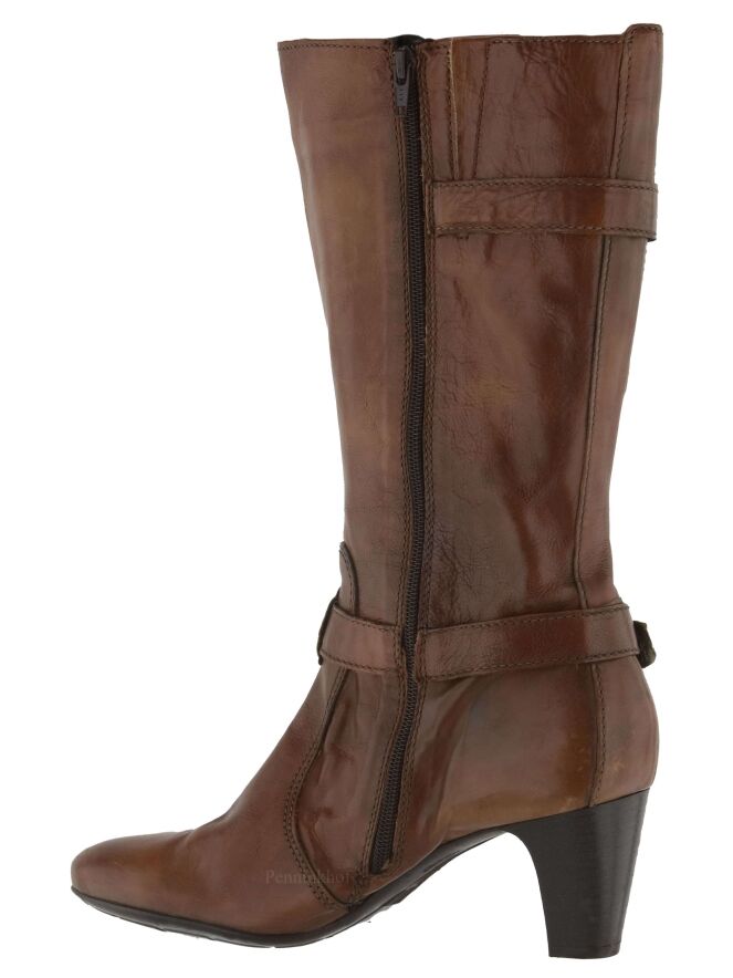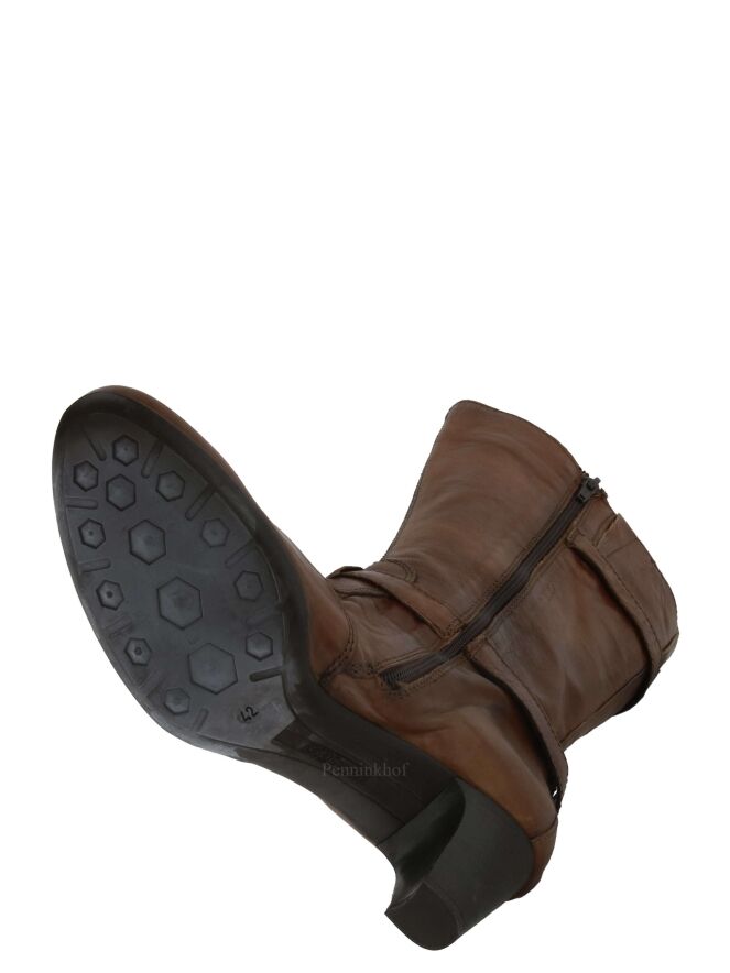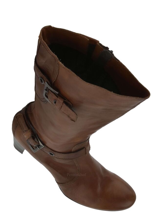 Une botte mi-haute de Manas en cognac foncé. Une boucle décorative se trouve au niveau de la cheville et à l’arrière du mollet. La botte a un bout rond et un talon de couleur brun foncé.
