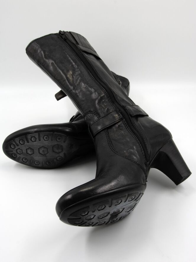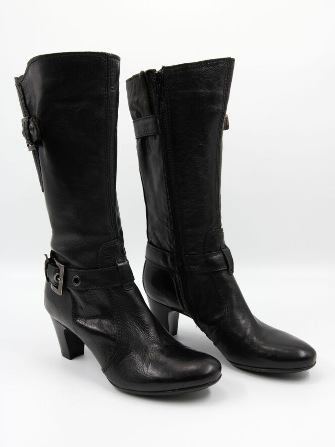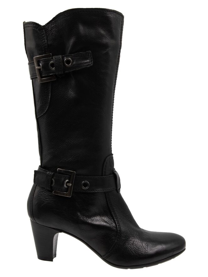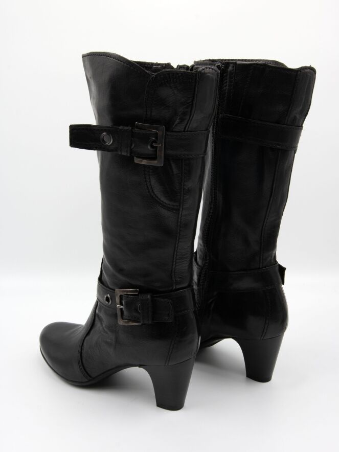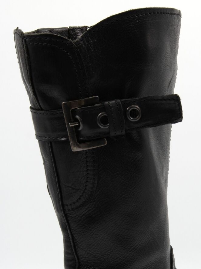 Une botte mi-haute de Manas en noir. Une boucle décorative se trouve au niveau de la cheville et à l’arrière du mollet. La botte a un bout rond et un talon de couleur noire.
