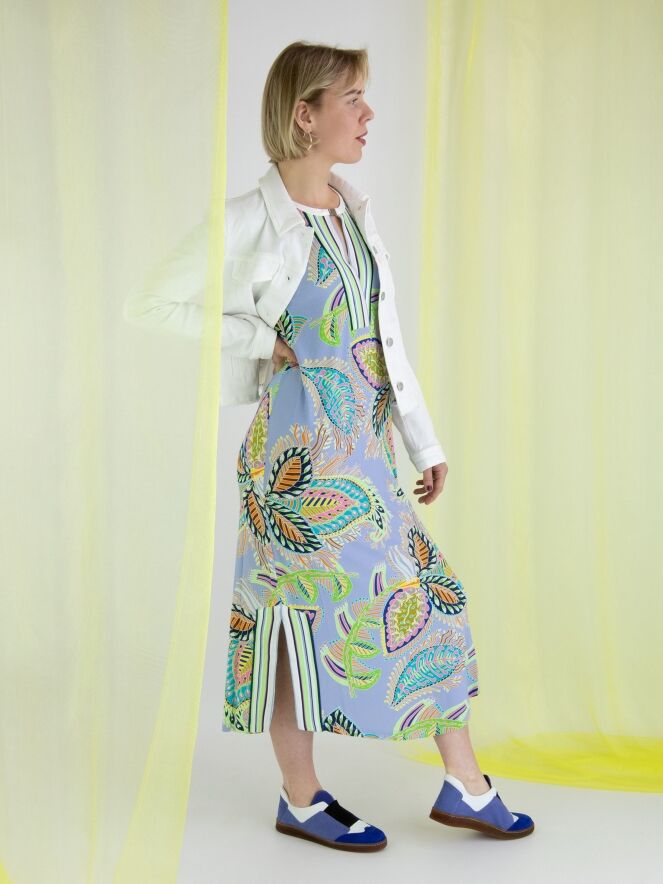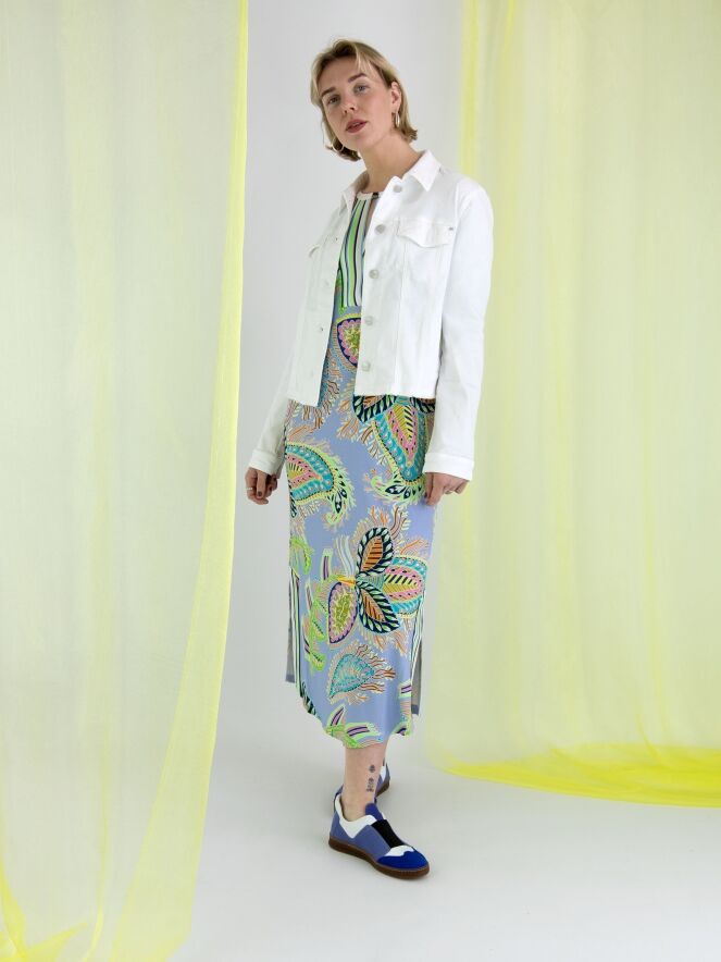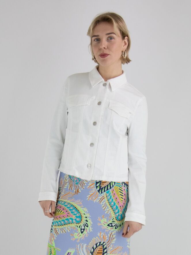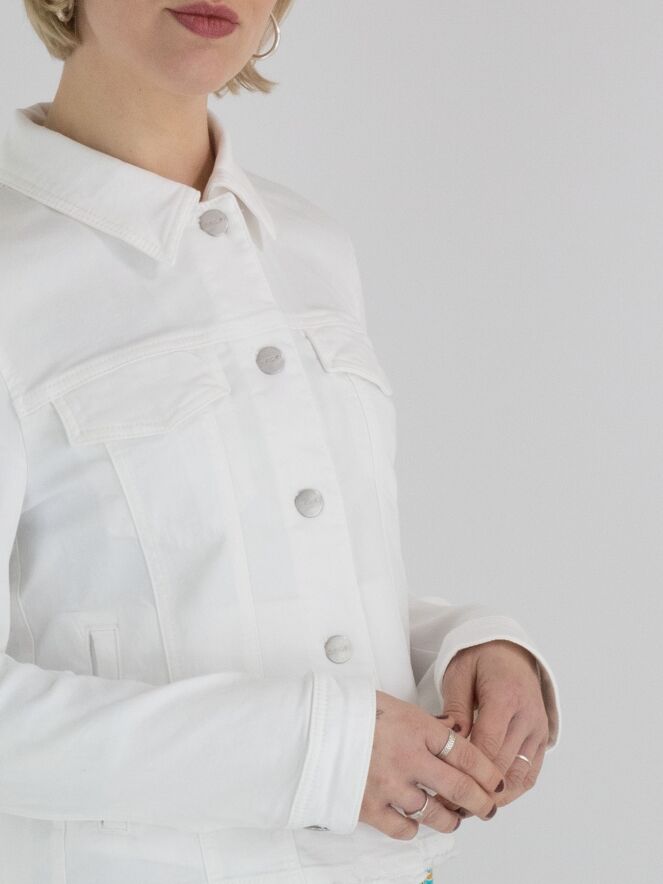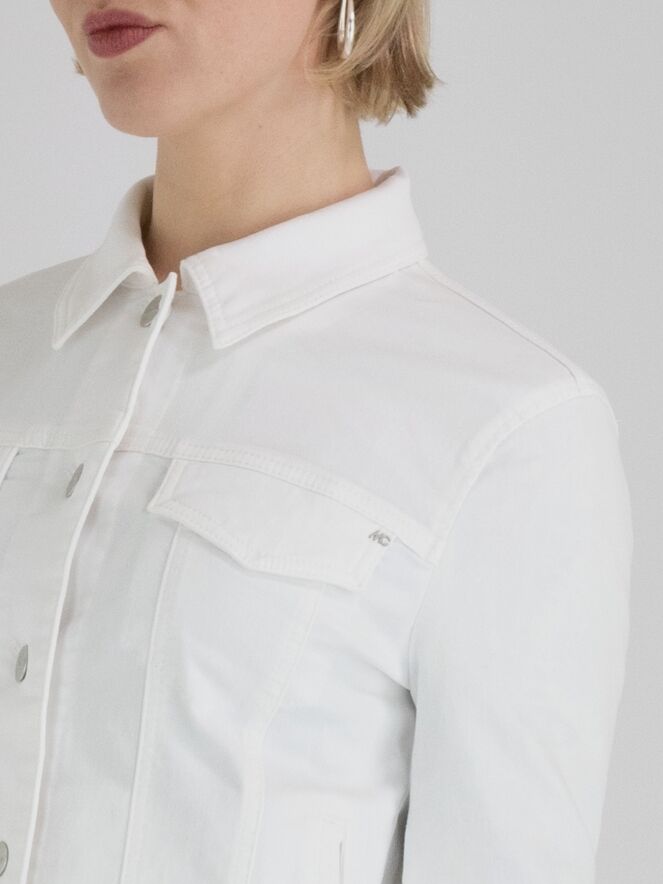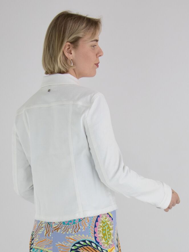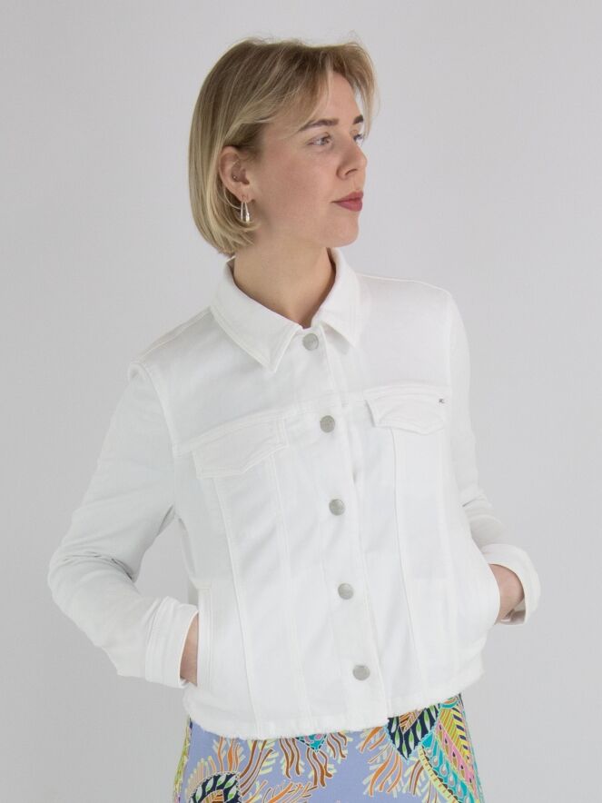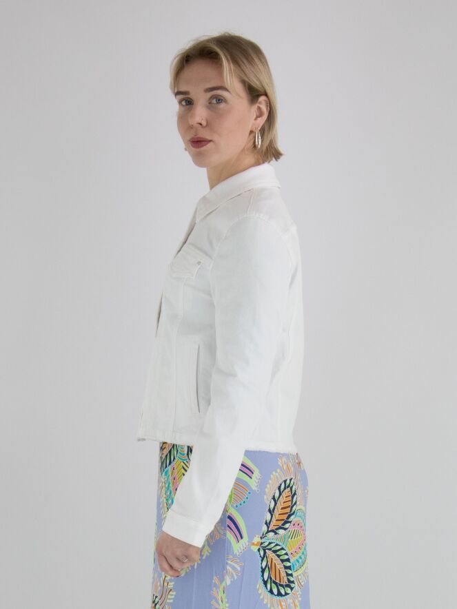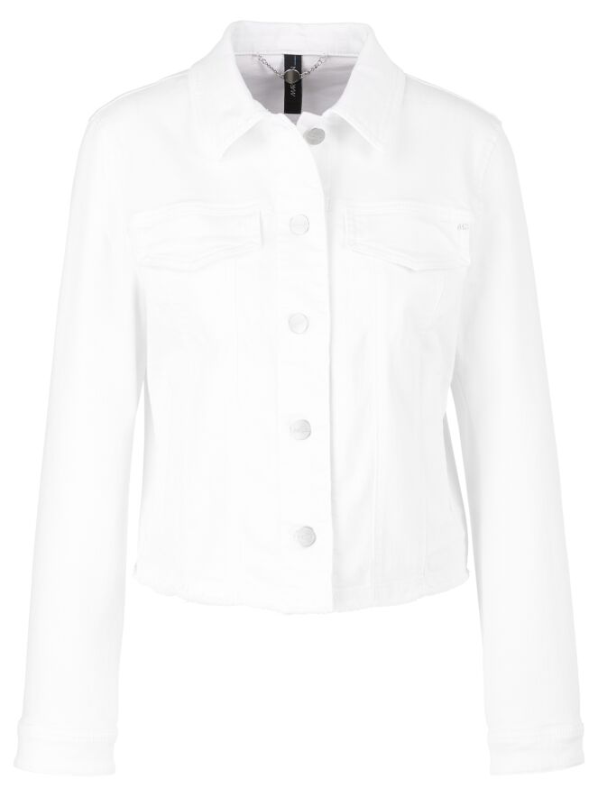 Un blazer en denim blanc de Marc Cain. Il est doté d'une fermeture à boutons avec 5 boutons et le bord inférieur du tissu est finement effiloché. Ce blazer peut être lavé à 30 degrés.
