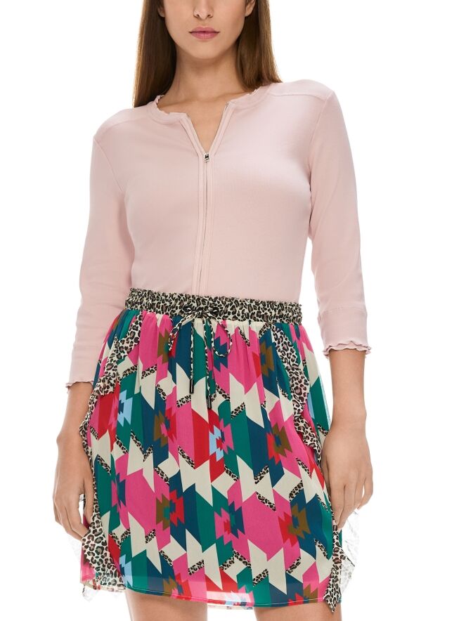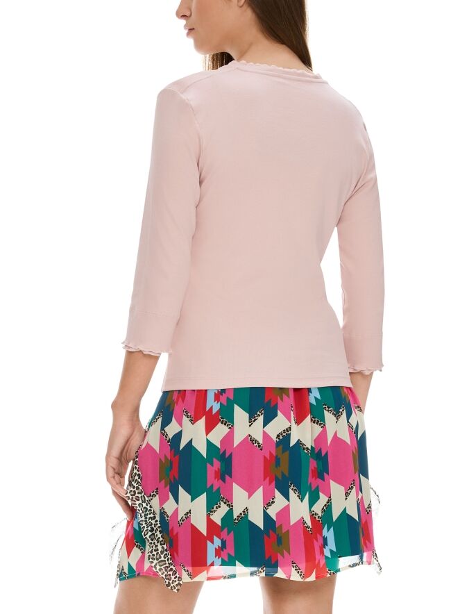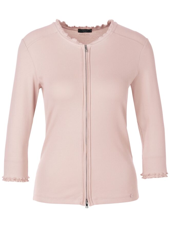 Un gilet rose de la marque Marc Cain. Le gilet a des manches mi-longues et un col rond. Un bandeau côtelé longe le col et la fermeture éclair. Ce gilet peut être lavé à 30 degrés.