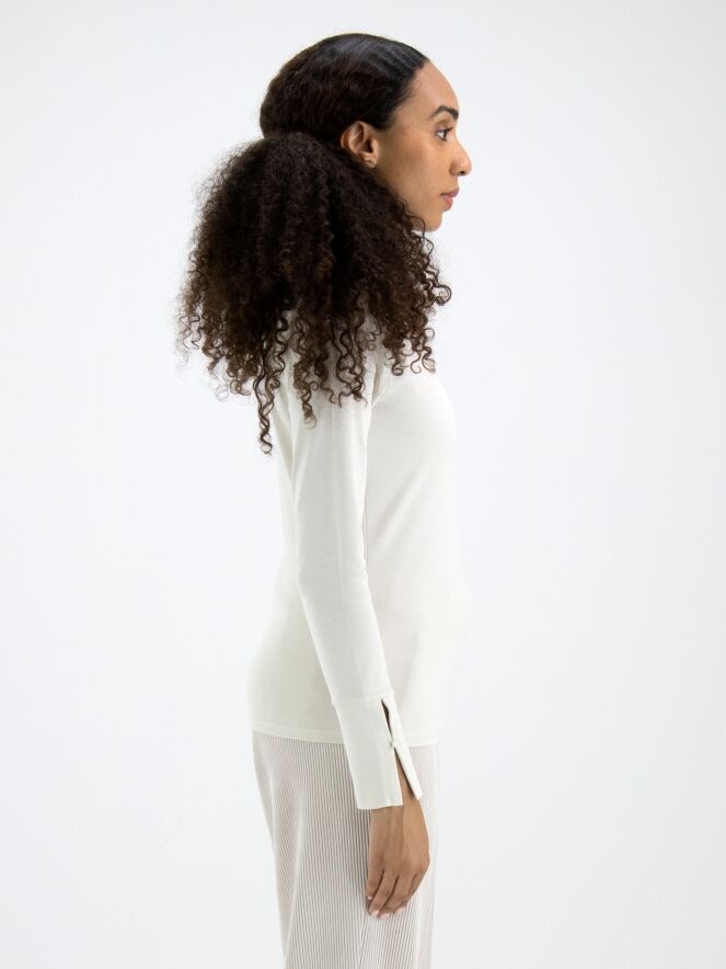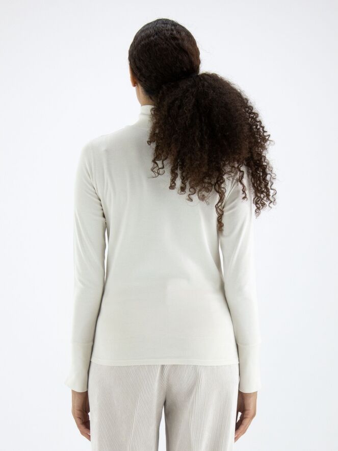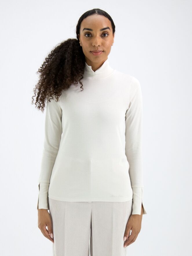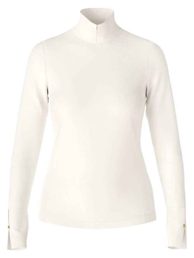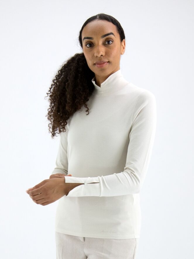 Un chemisier de Marc Cain de couleur blanc crème. Le chemisier a des manches longues et un col roulé avec une petite fente au centre devant. Ce chemisier peut être lavé à 30 degrés.