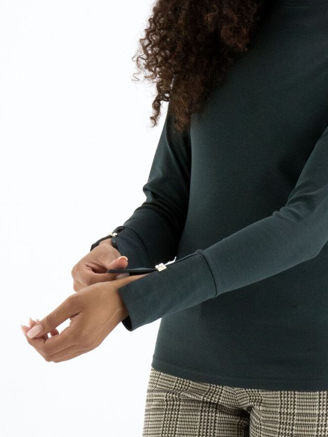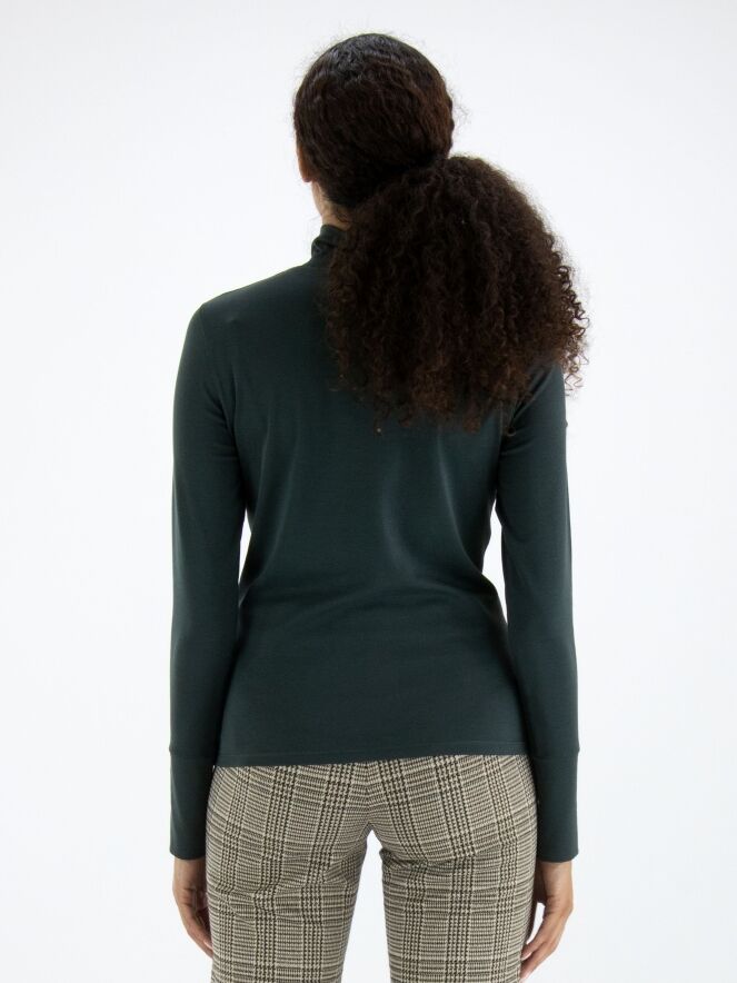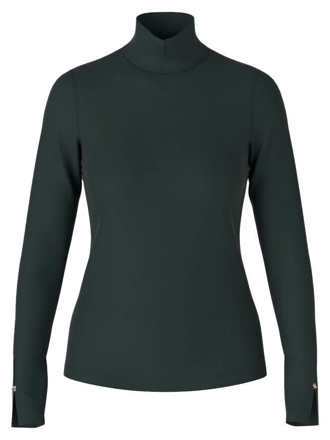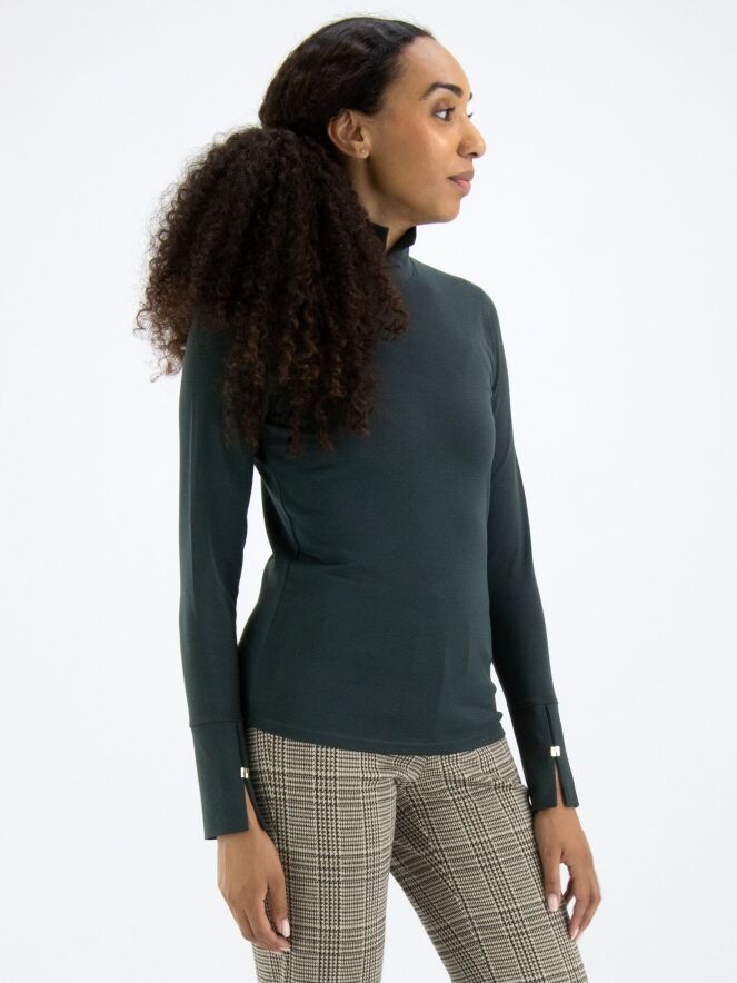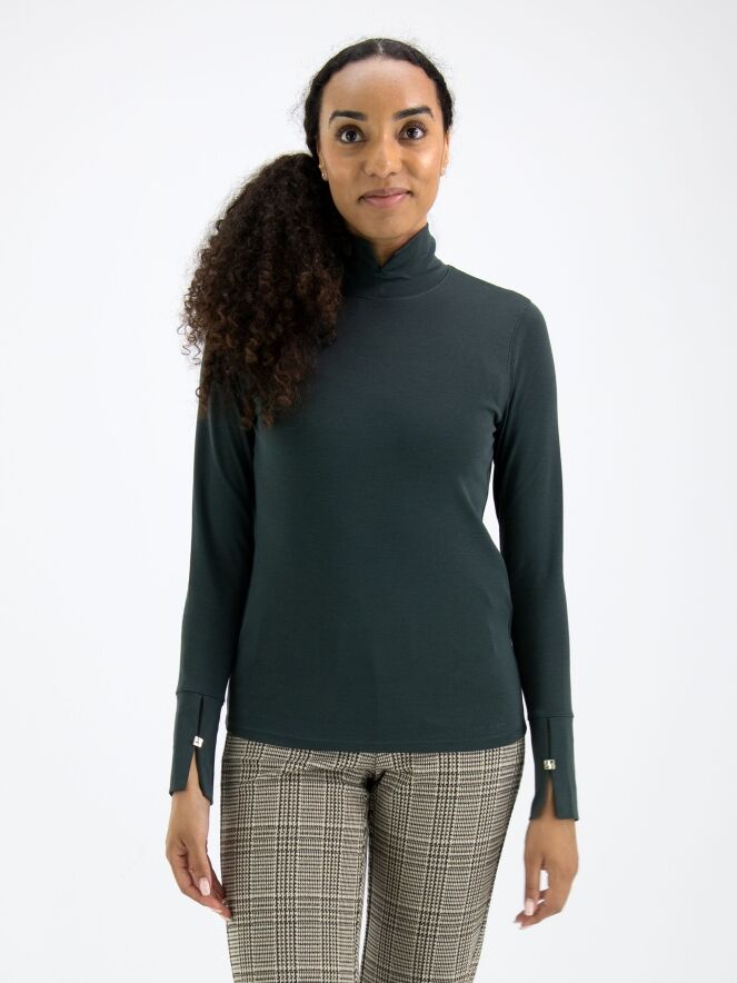 Un t-shirt de Marc Cain en vert foncé. Le t-shirt a des manches longues et un col roulé avec une petite fente à l'avant. Ce t-shirt peut être lavé à 30 degrés.