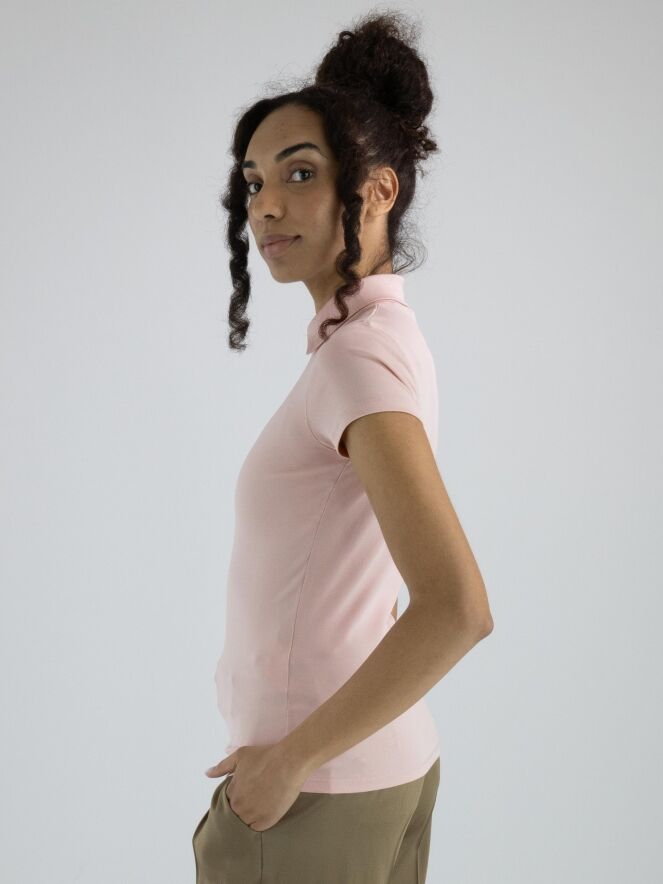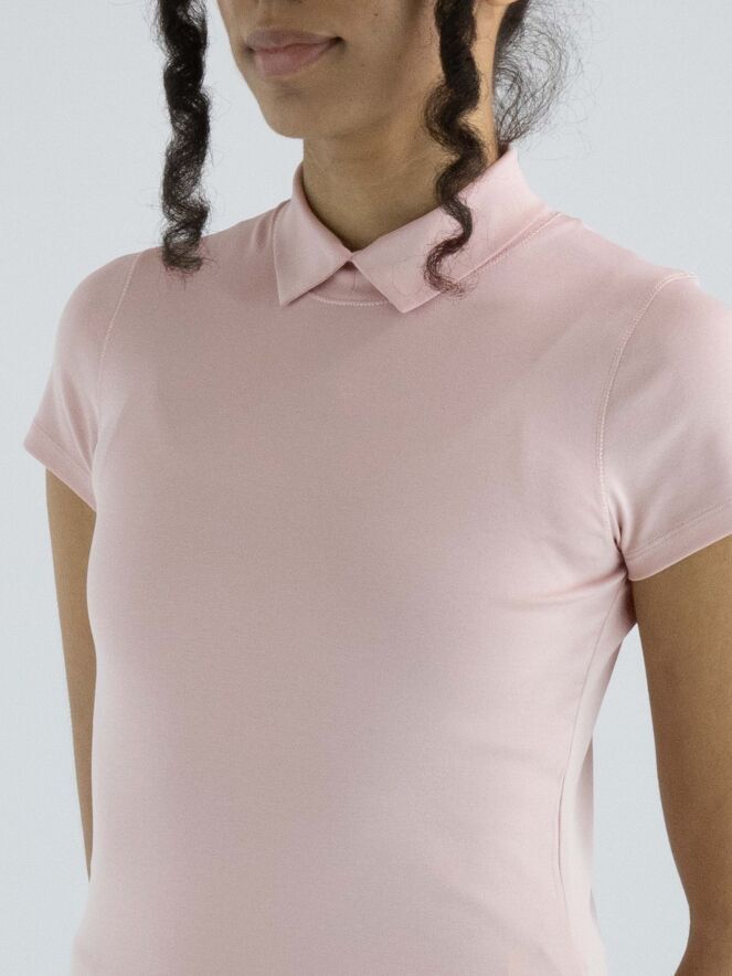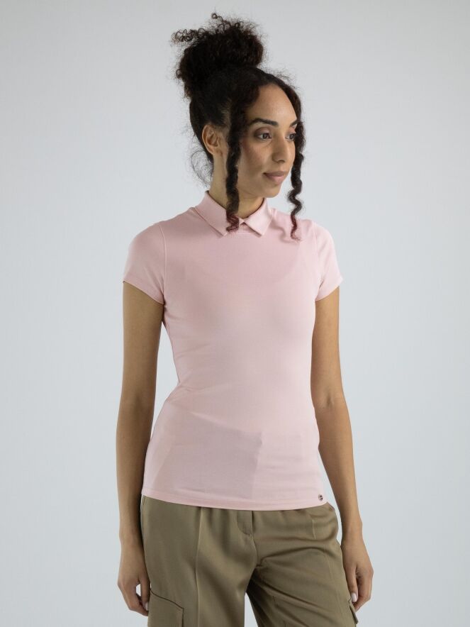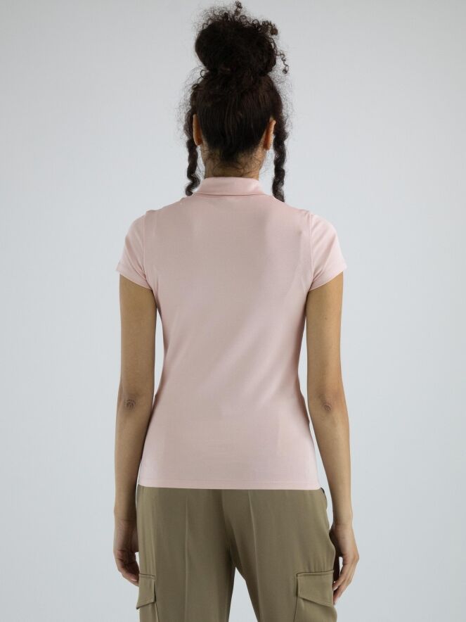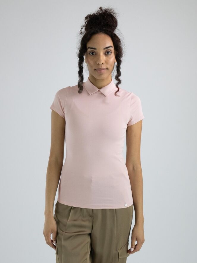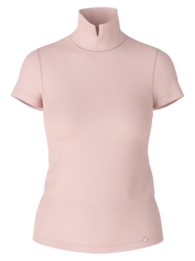 Un t-shirt rose de Marc Cain. Le t-shirt a des manches courtes et un col roulé. Il y a une petite fente à l'avant du col roulé. Ce t-shirt peut être lavé à 30 degrés.