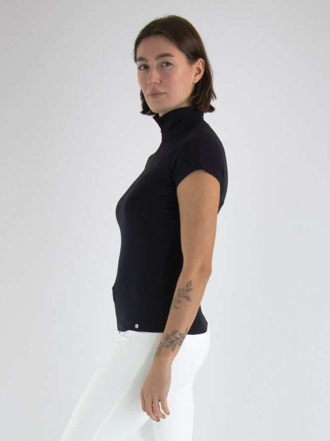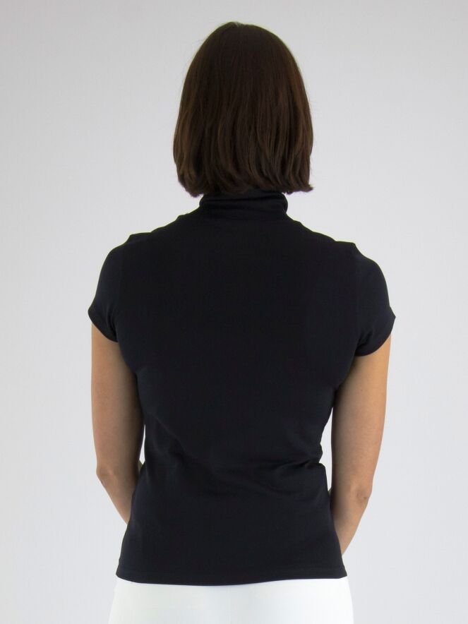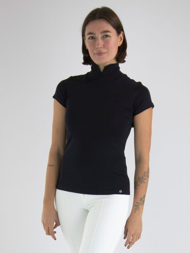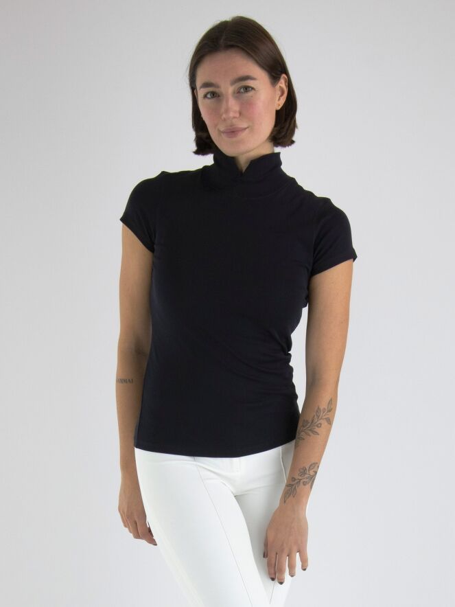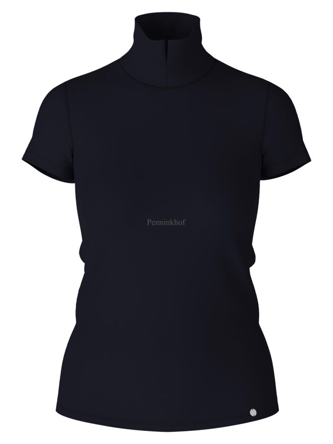 Un t-shirt bleu marine de Marc Cain. Le t-shirt a des manches courtes et un col roulé. Il y a une petite fente à l'avant du col roulé. Ce t-shirt peut être lavé à 30 degrés.