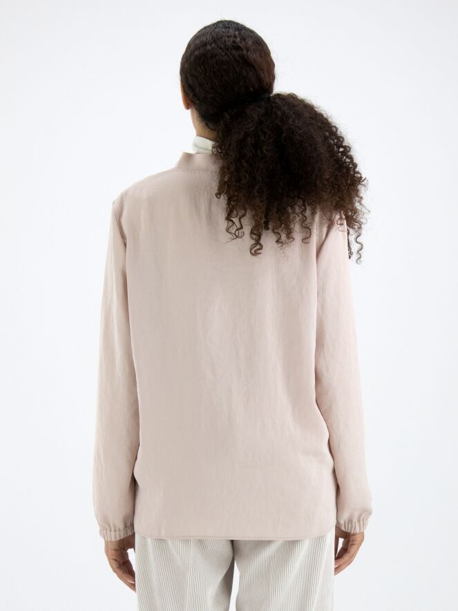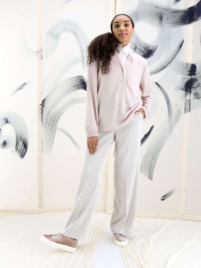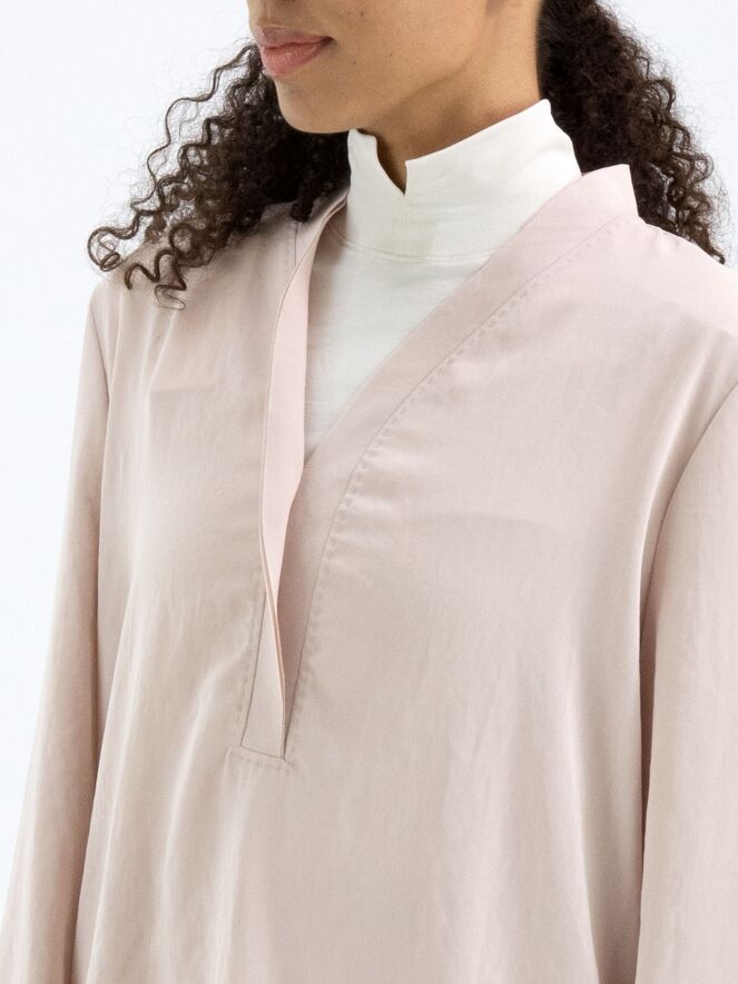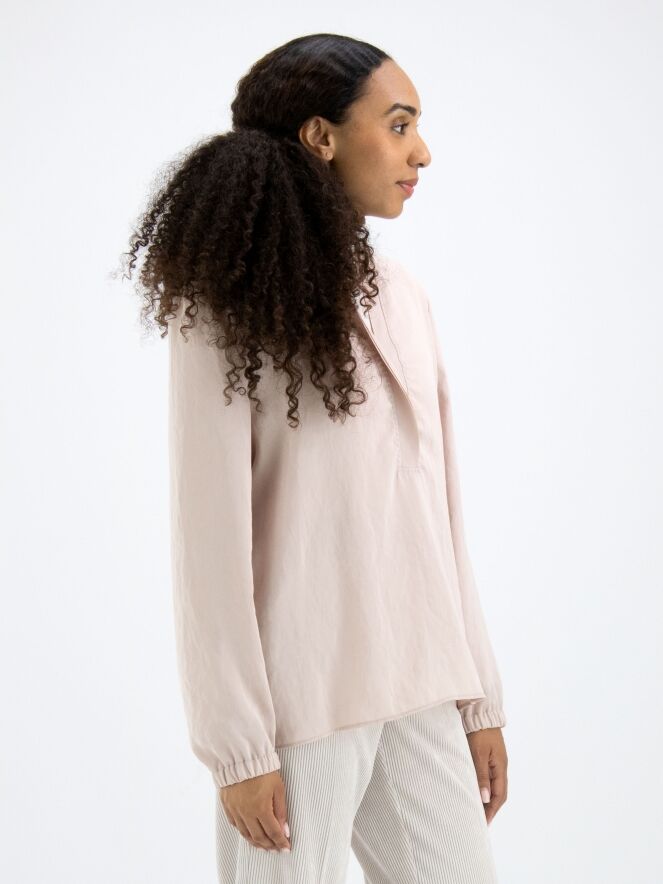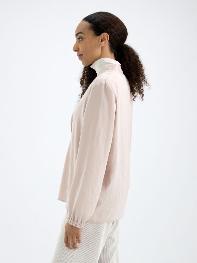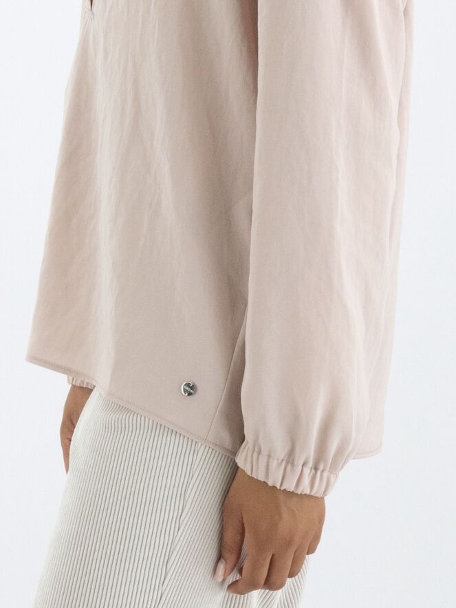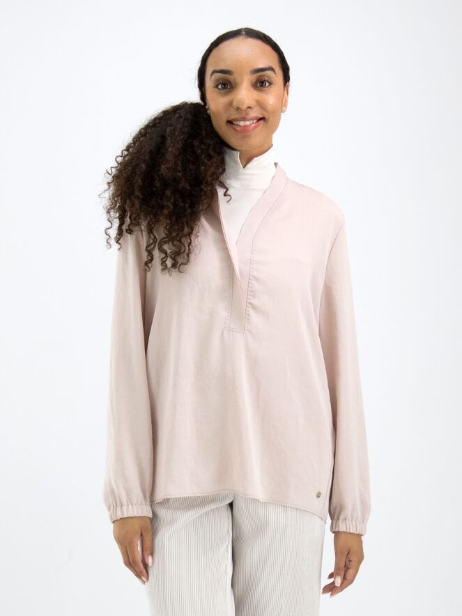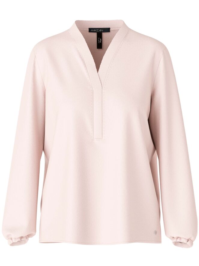 Une blouse de Marc Cain en rose pastel. Le long du bord du col en V se trouve une bordure en double tissu avec une couture décorative surpiquée. Aux extrémités des manches longues, il y a une bordure finement plissée élastique. Cette blouse peut être lavée à 30 degrés.