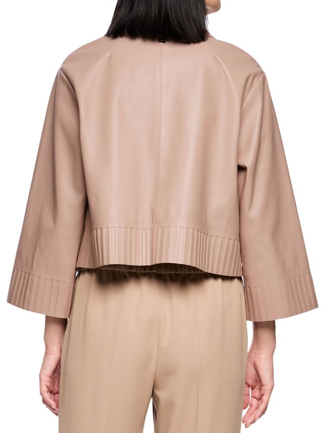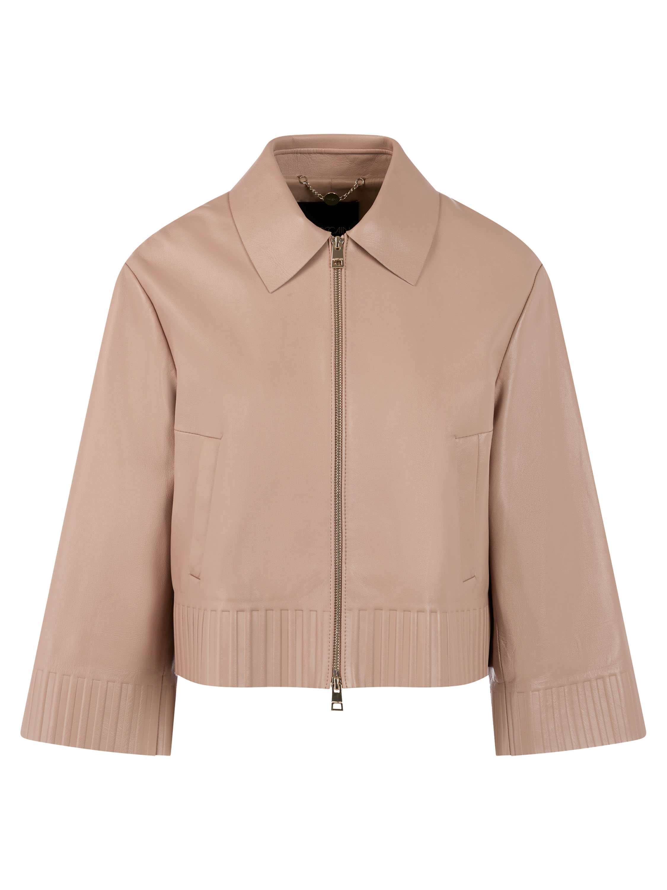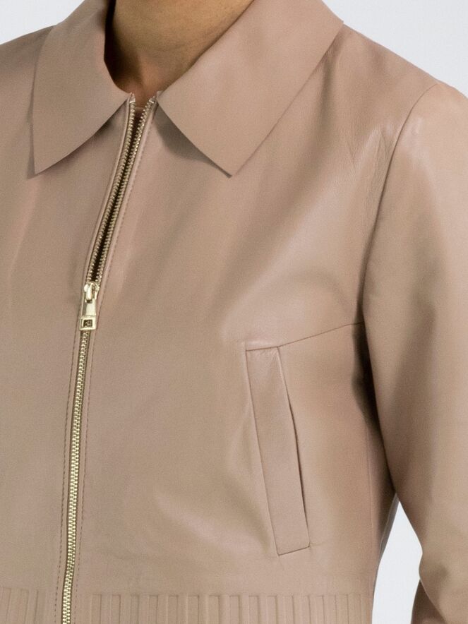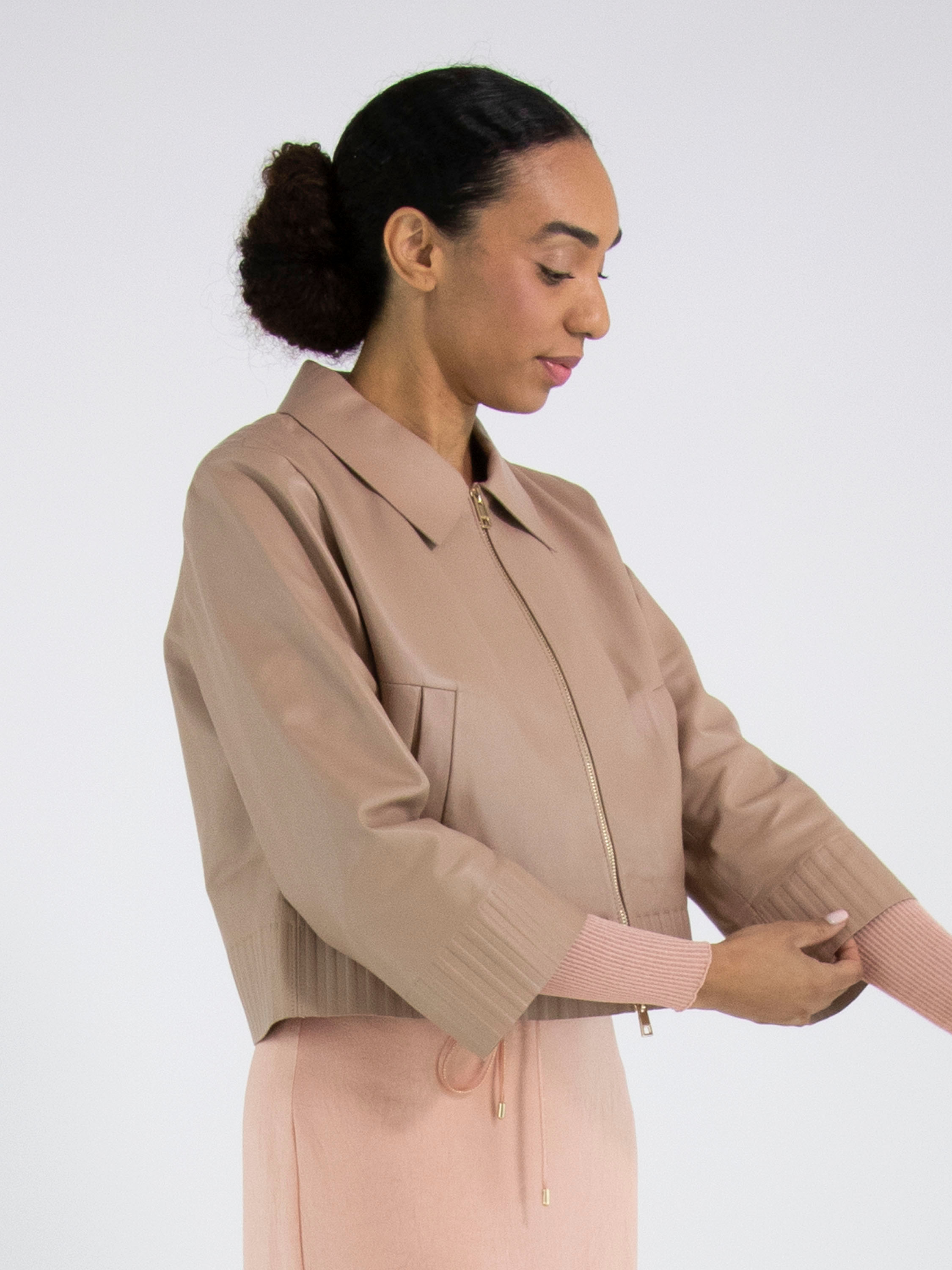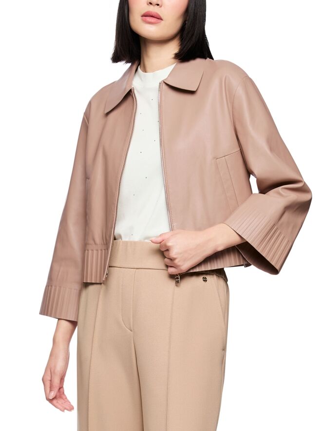 Un manteau court en cuir de Marc Cain dans une douce teinte taupe. Le manteau possède un col et une fermeture zippée. En bas et au bout des manches longues se trouve une large bande avec un motif nervuré embossé dans le cuir. Ce manteau ne doit pas être lavé.
