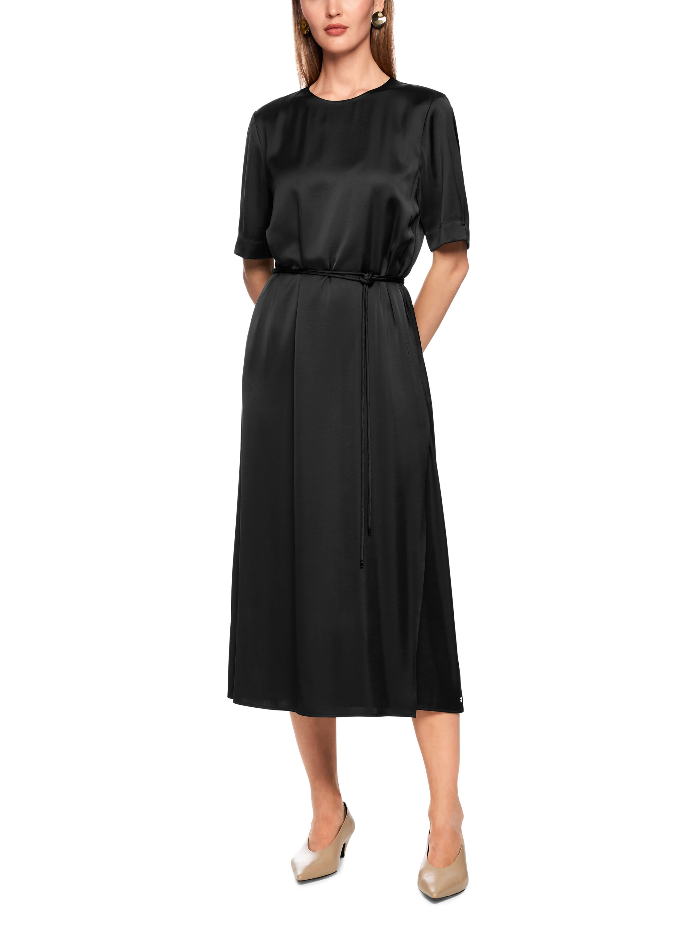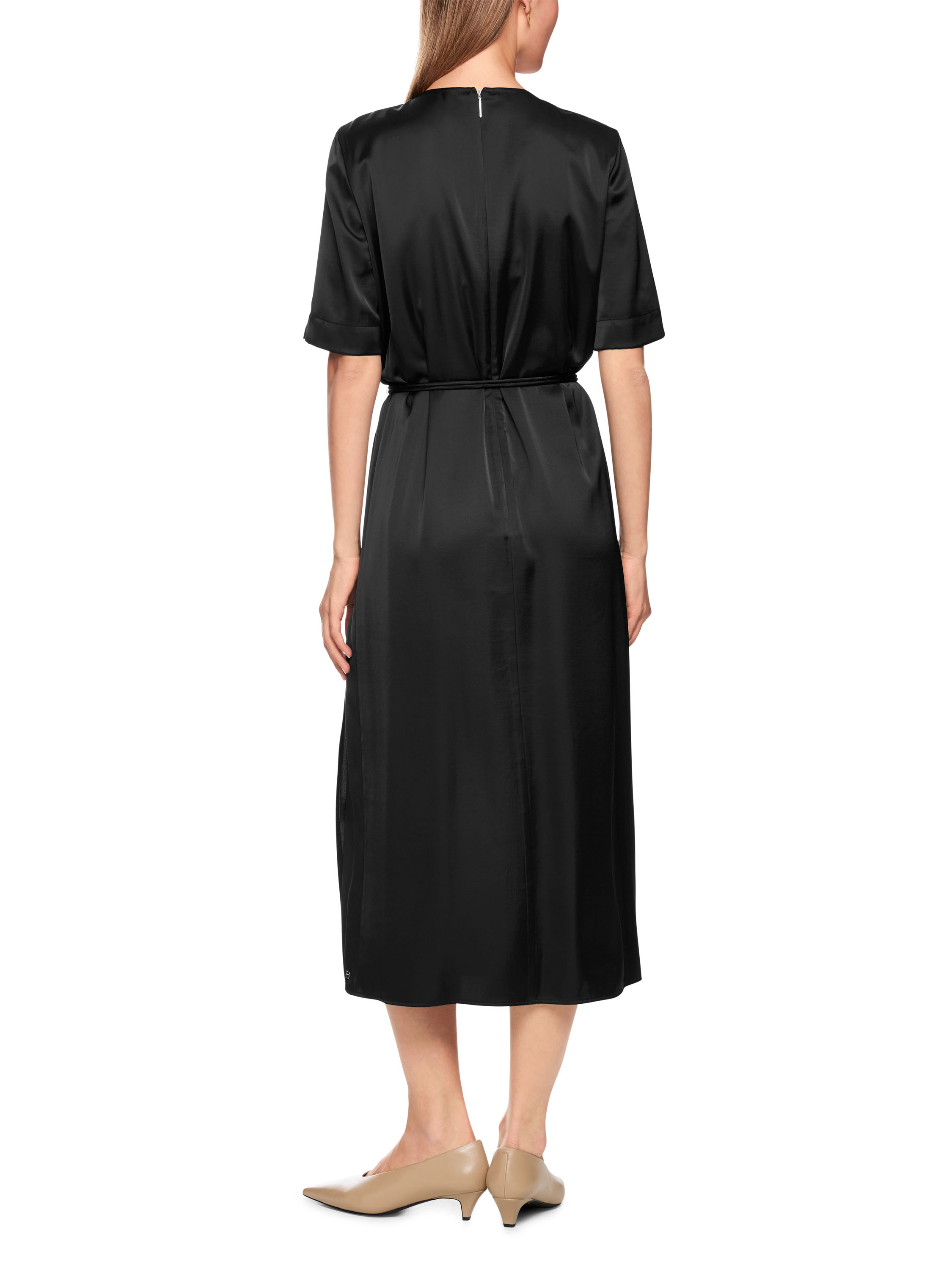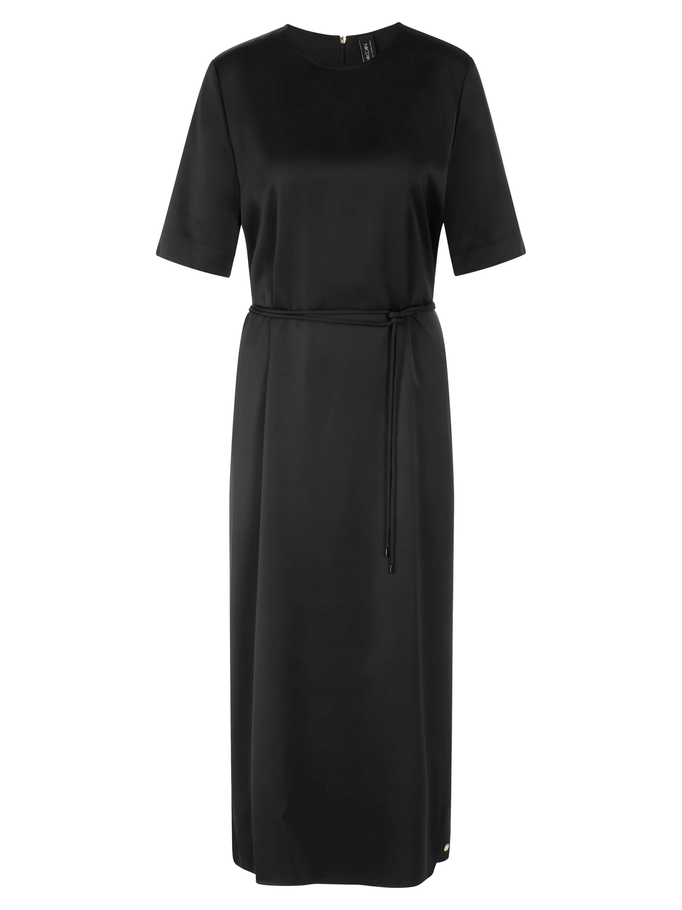 Une robe de Marc Cain en tissu mat légèrement satiné de couleur noire. La robe possède des manches courtes et une encolure ronde. À partir de la taille, la robe présente un effet portefeuille rappelant une jupe portefeuille. À la taille se trouve une ceinture-cordon en satin mat. Cette robe peut être lavée à 30 degrés.