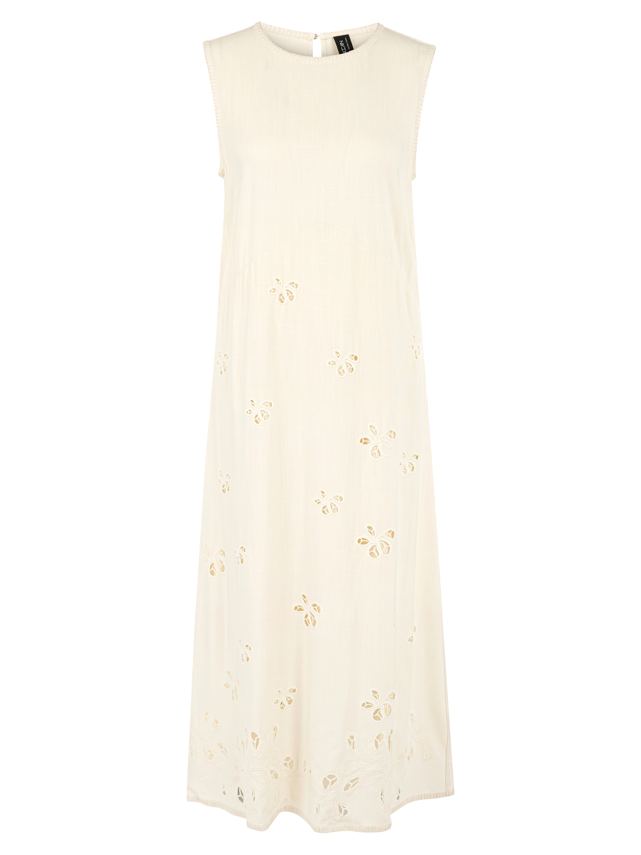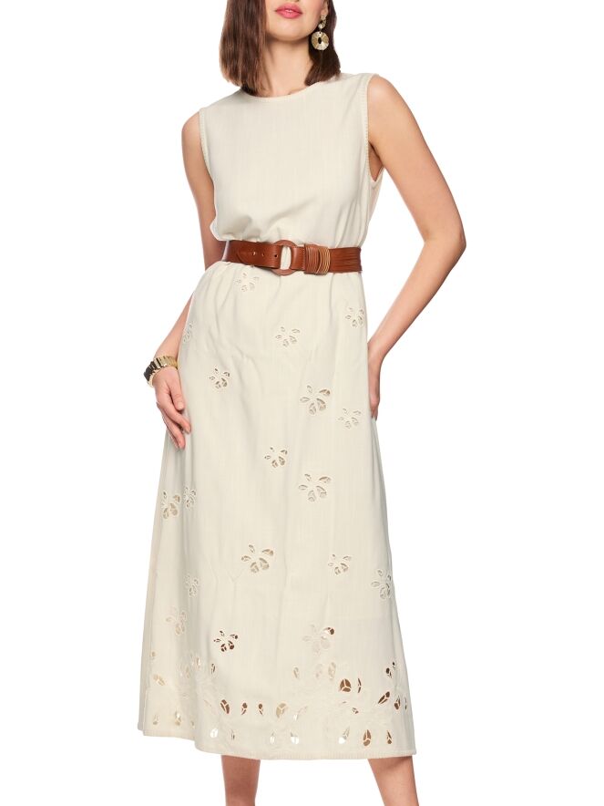 À la taille, une couture arrondie structure la silhouette, sous laquelle apparaissent des ajours floraux à l’avant comme à l’arrière, créant un effet féminin et élégant. À l’arrière de l’encolure, une ouverture avec fermeture par bouton descend jusqu’au-dessous des omoplates.