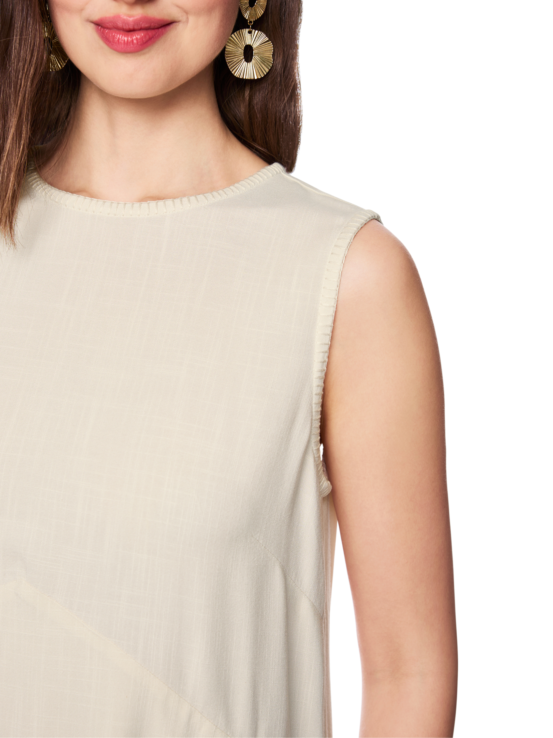 Robe de Marc Cain dans une teinte blanc crème intense. Le long de l’encolure ronde, des emmanchures et de l’ourlet, un galon décoratif avec des surpiqûres superposées en motif côtelé apporte une touche raffinée.