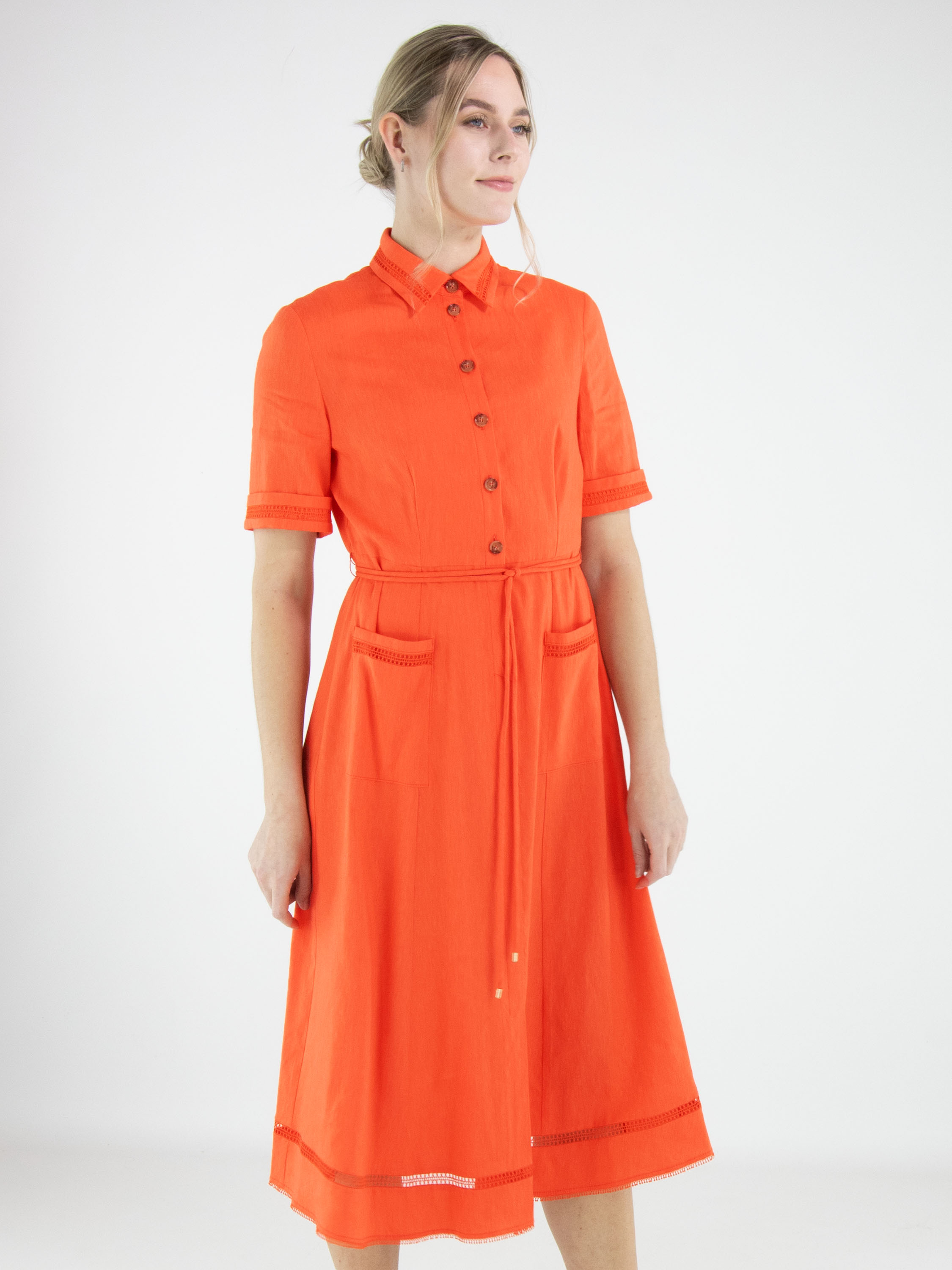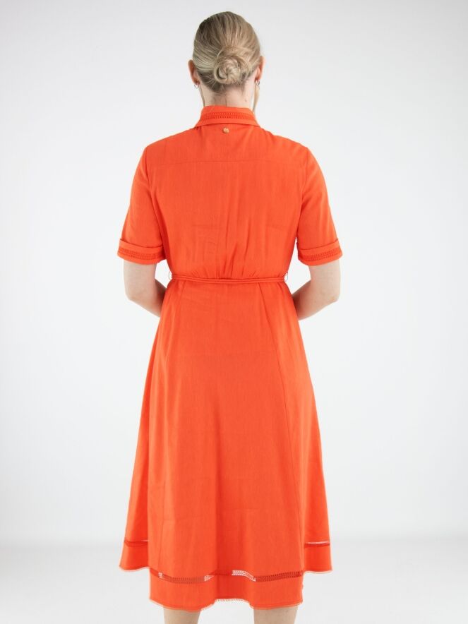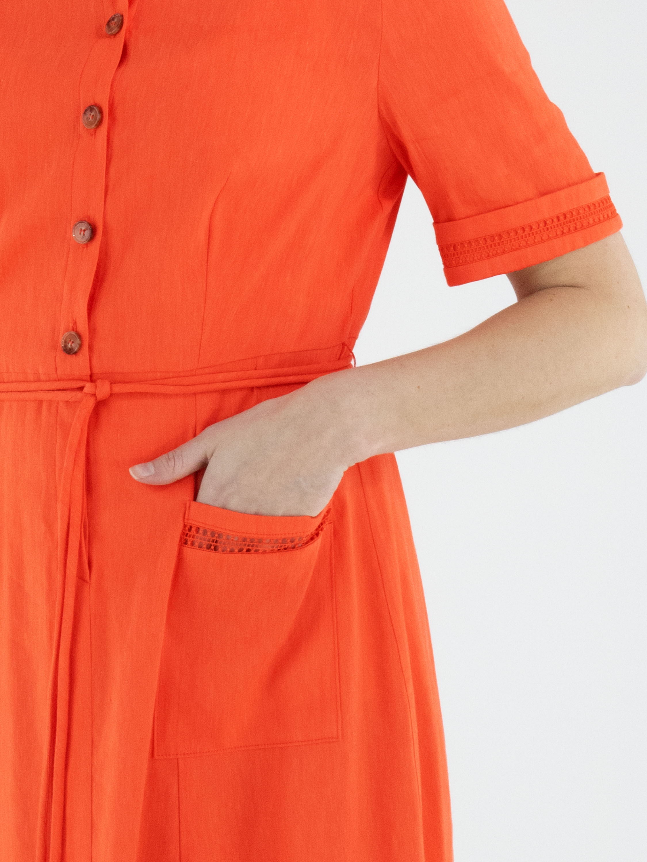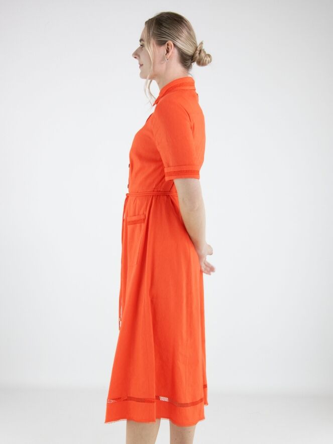 Robe de Marc Cain dans une teinte corail éclatante. Une délicate bordure ajourée souligne le col, le revers des manches courtes, les bords des poches et l’ourlet, apportant une touche féminine raffinée. La fermeture boutonnée descend sous la taille. Un cordon ceinture assorti dans la même matière marque élégamment la silhouette. À partir de la taille, la robe s’évase légèrement en ligne A. Cette robe peut être lavée à 30 degrés.