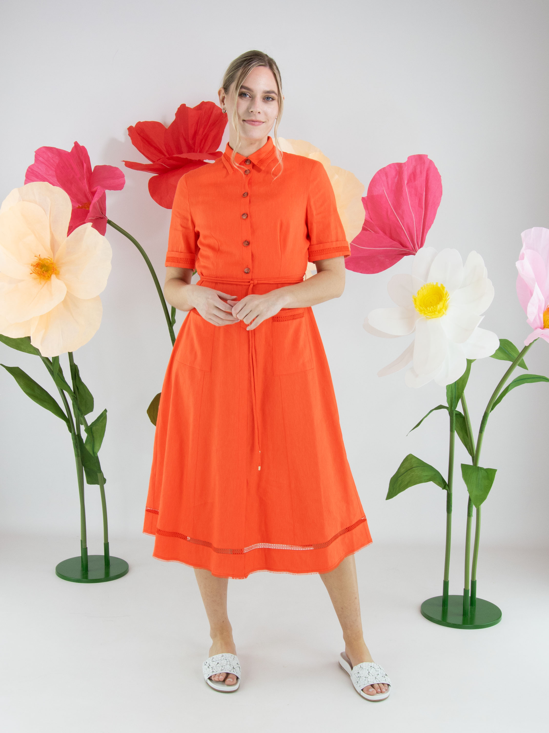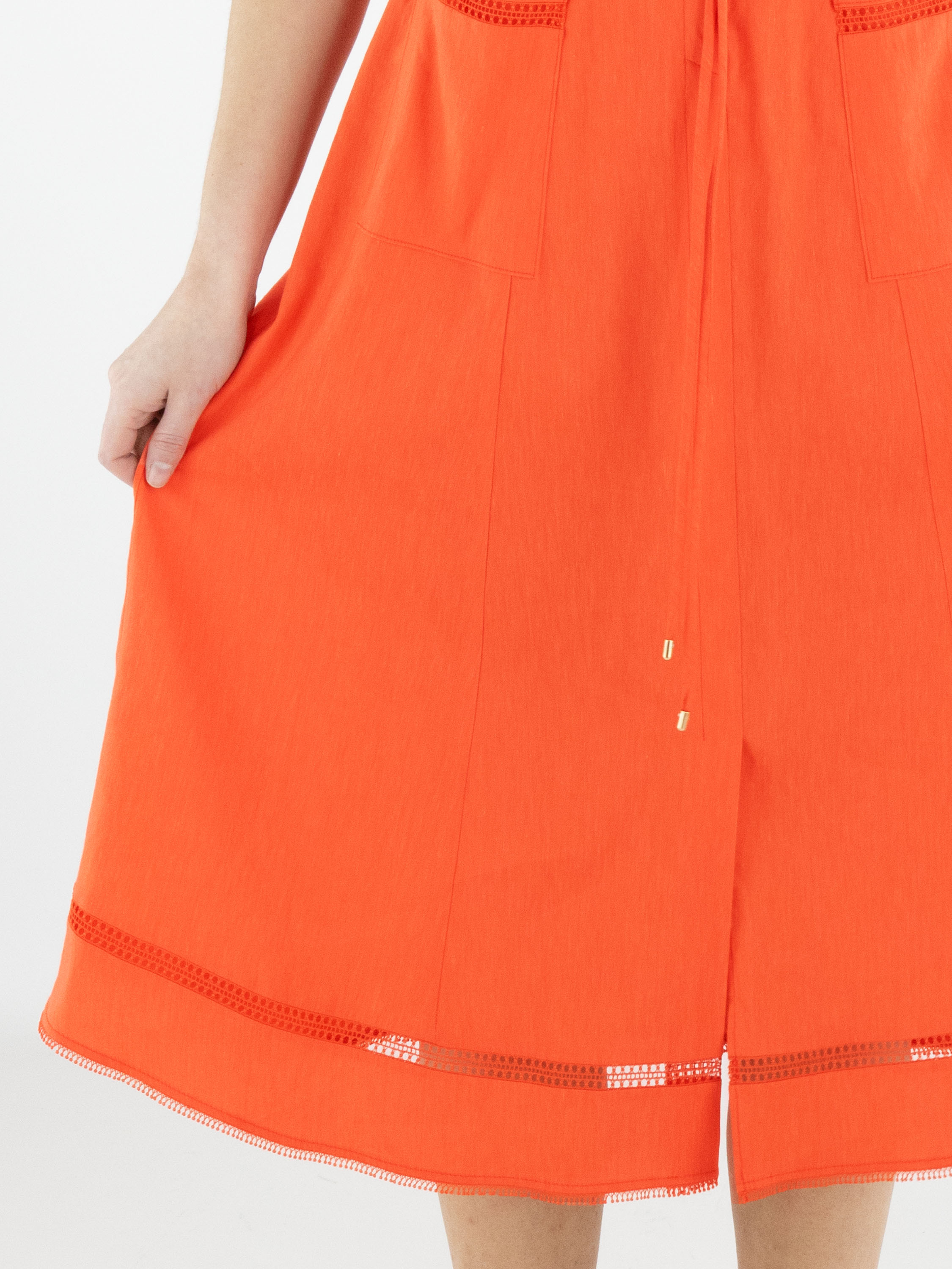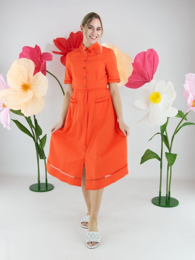 Robe de Marc Cain dans une teinte corail éclatante. Une délicate bordure ajourée souligne le col, le revers des manches courtes, les bords des poches et l’ourlet, apportant une touche féminine raffinée. La fermeture boutonnée descend sous la taille. Un cordon ceinture assorti dans la même matière marque élégamment la silhouette. À partir de la taille, la robe s’évase légèrement en ligne A. Cette robe peut être lavée à 30 degrés.