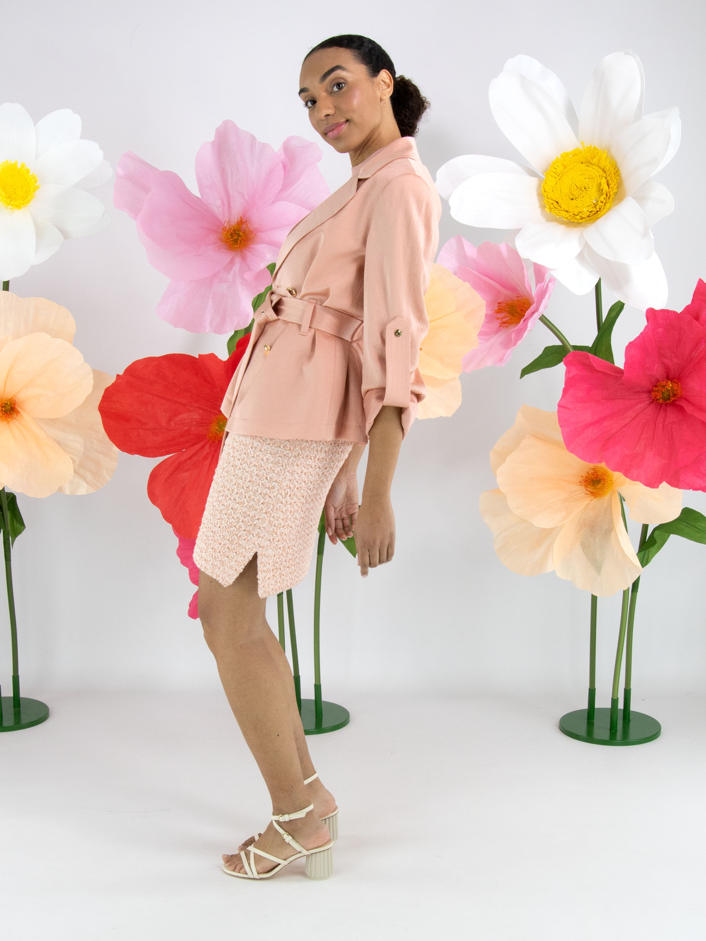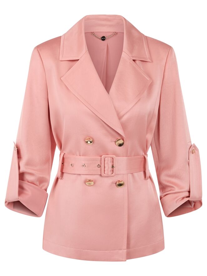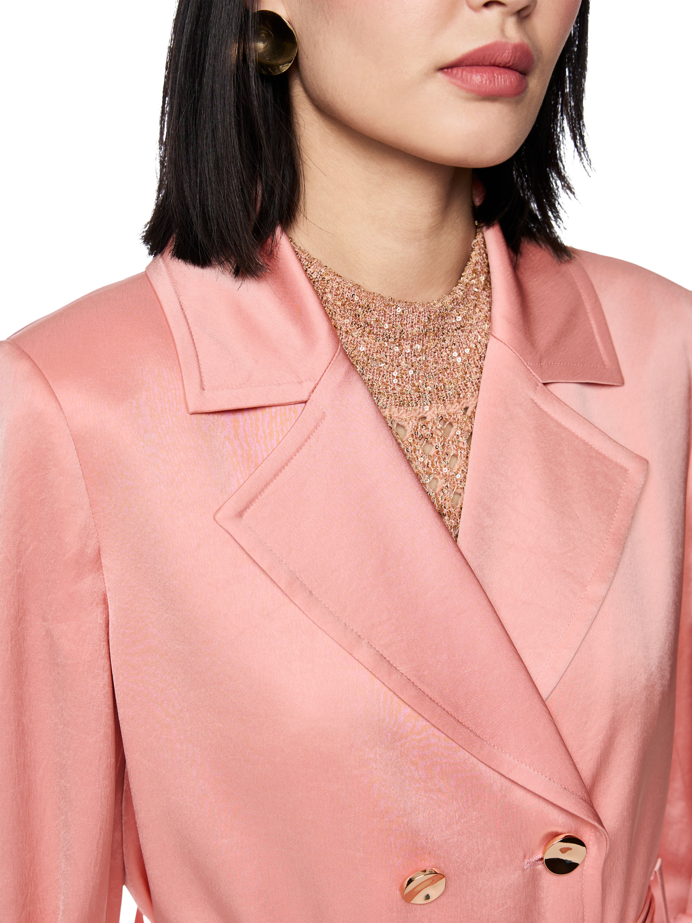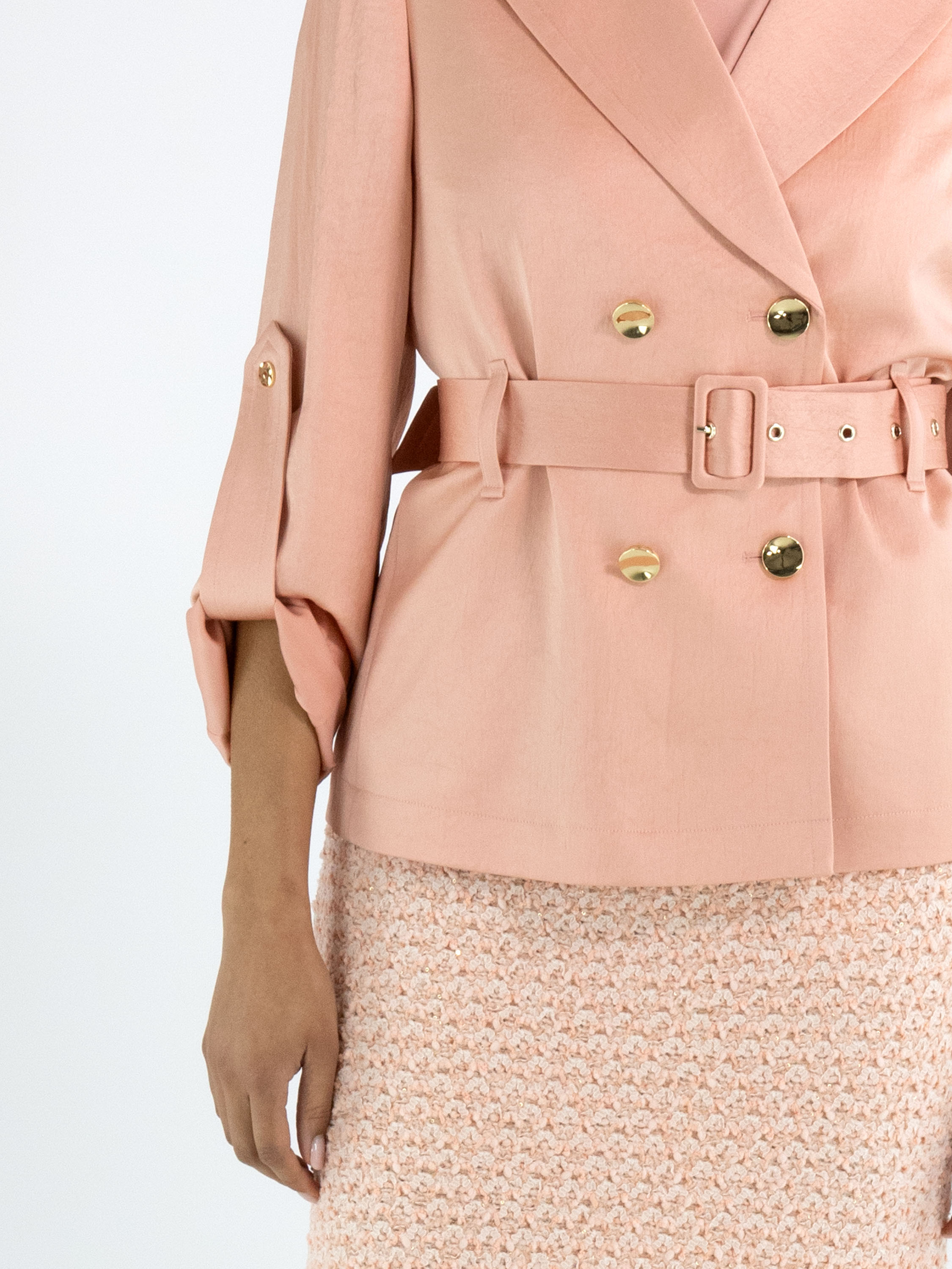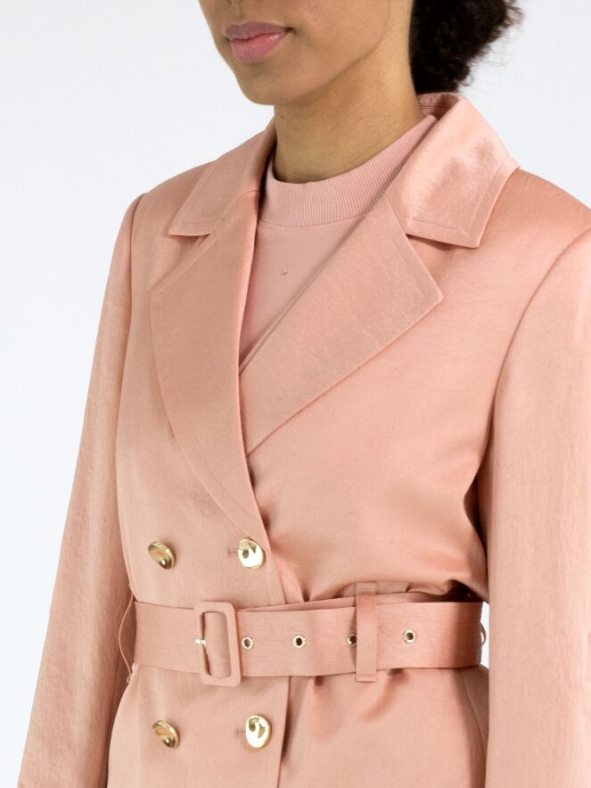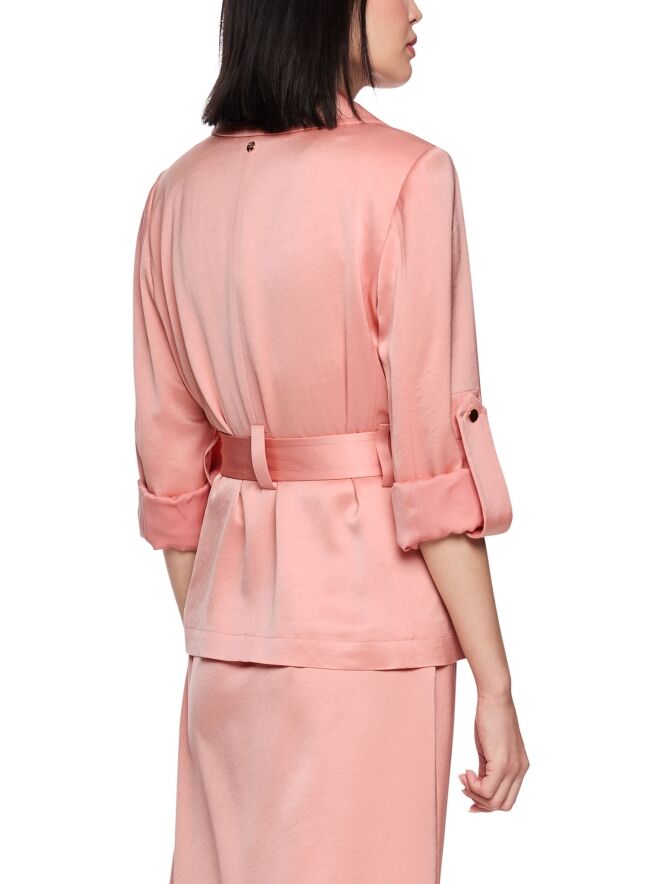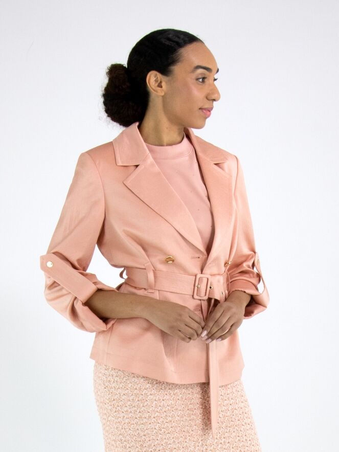 Un blazer croisé de Marc Cain en tissu satiné mat de couleur rose saumon. Le blazer est orné de boutons décoratifs dorés. À la taille se trouve une ceinture dans la même matière que le blazer. Les manches comportent une boucle permettant de fixer les manches retroussées à l’aide d’un bouton-pression. Le blazer est doublé et ne doit pas être lavé.