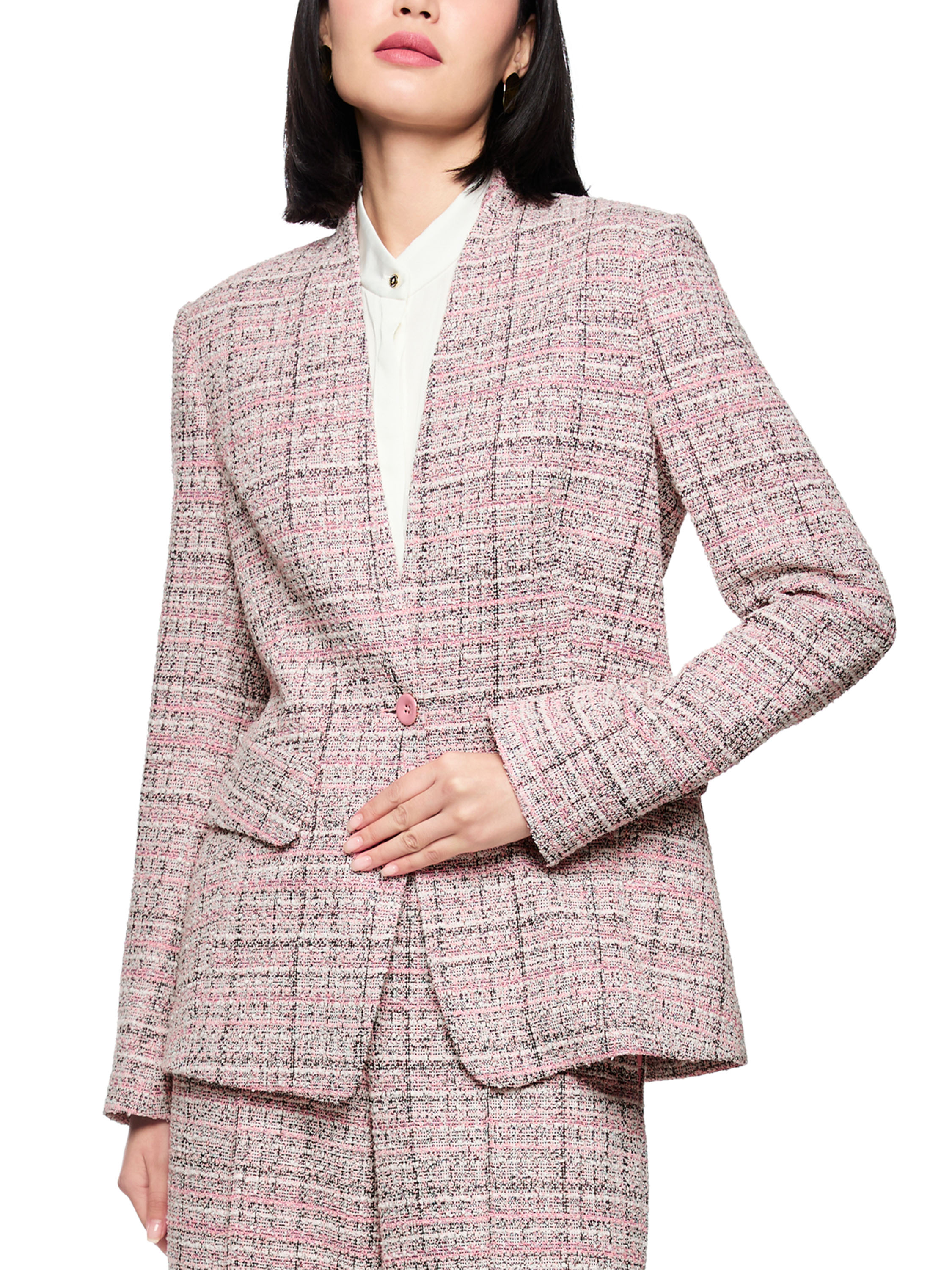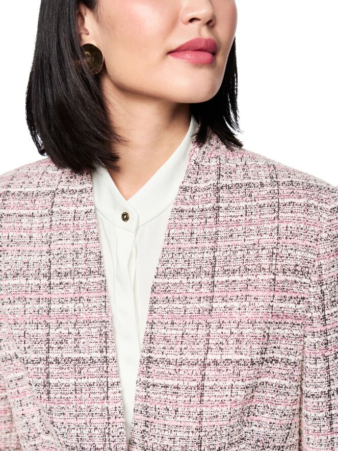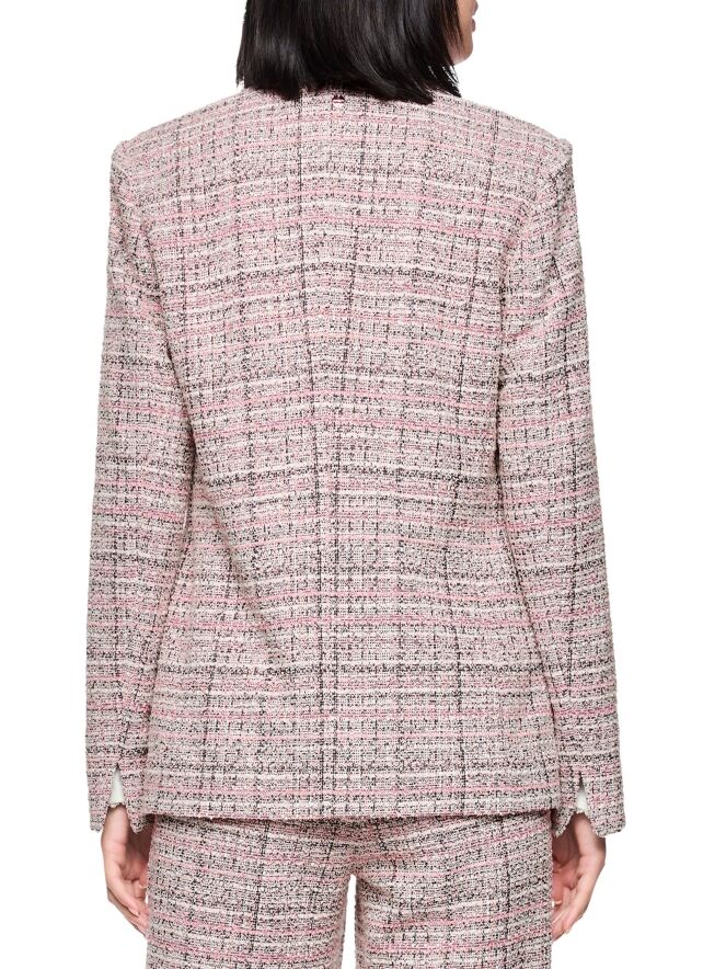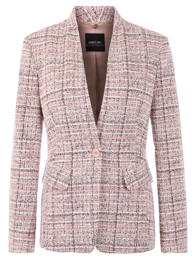 Un blazer à l’allure tweed dans les tons rose saumon, blanc cassé, nude et noir. La fermeture se fait par un seul bouton émaillé. À l’extrémité des manches longues se trouve une petite fente. Le blazer est doublé et ne doit pas être lavé.