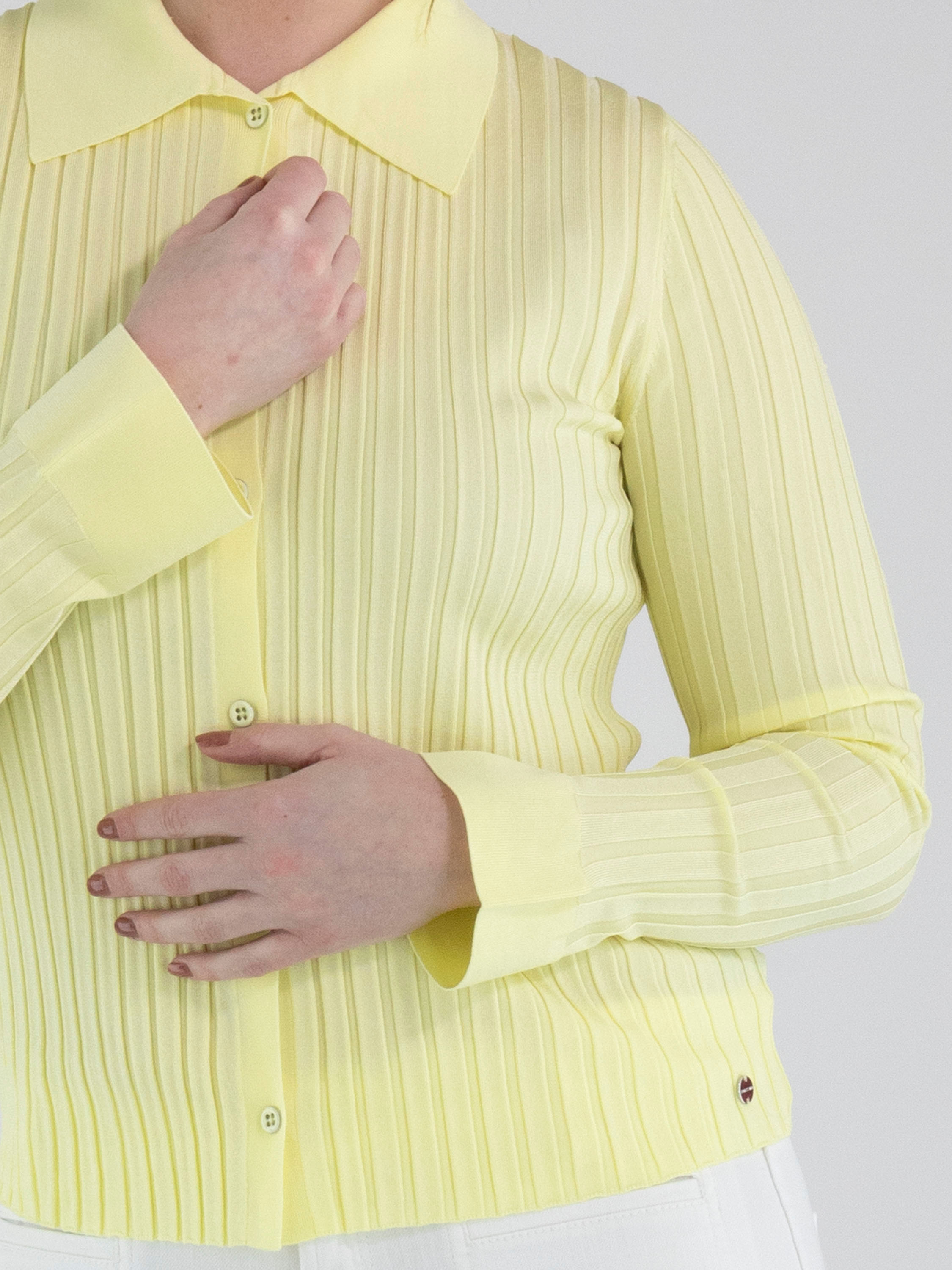 Un gilet de Marc Cain dans une teinte jaune pastel. Le tissu présente une large structure côtelée. Le col et les extrémités des manches longues sont finement côtelés. Ce gilet peut être lavé à la main.