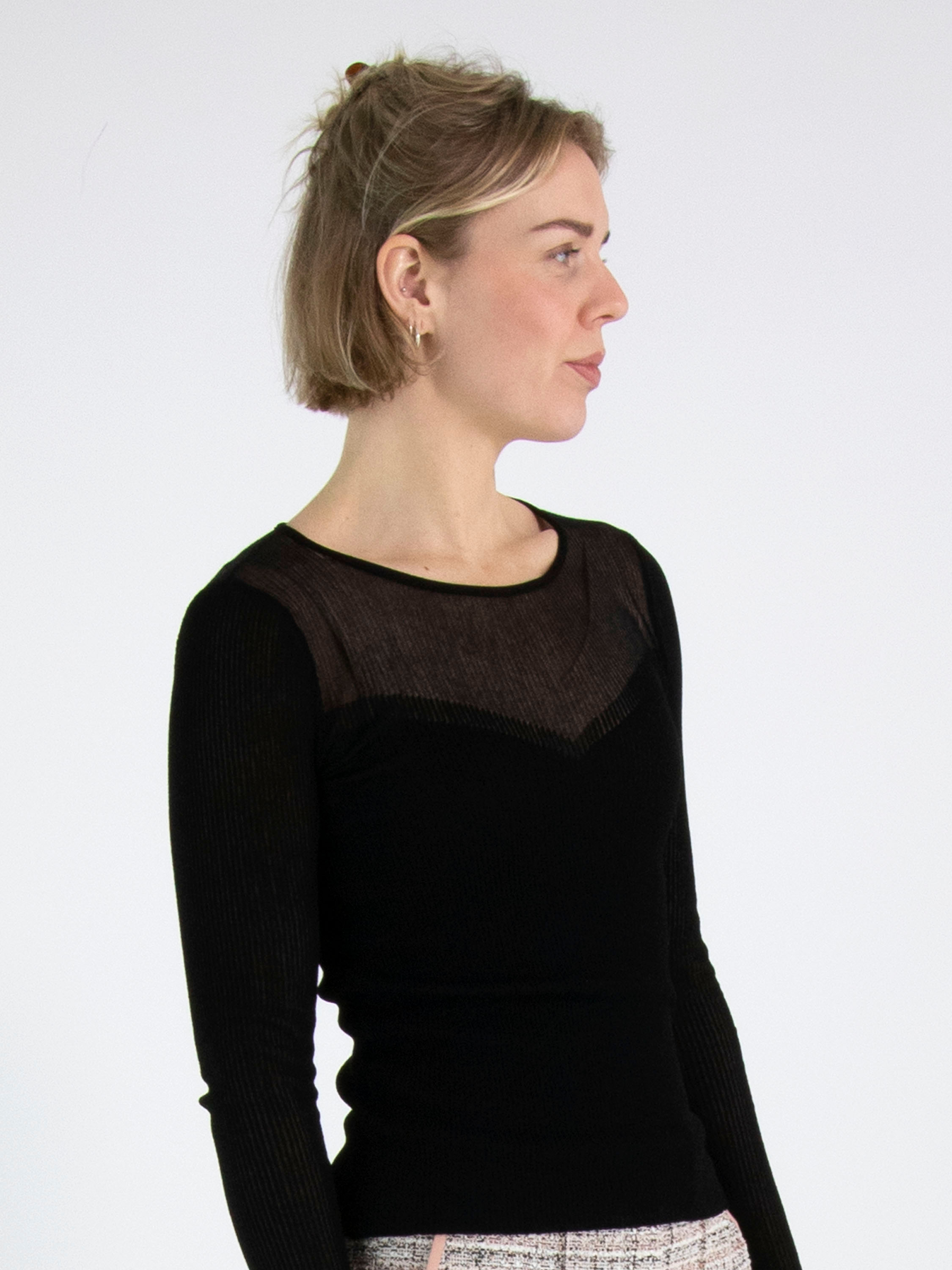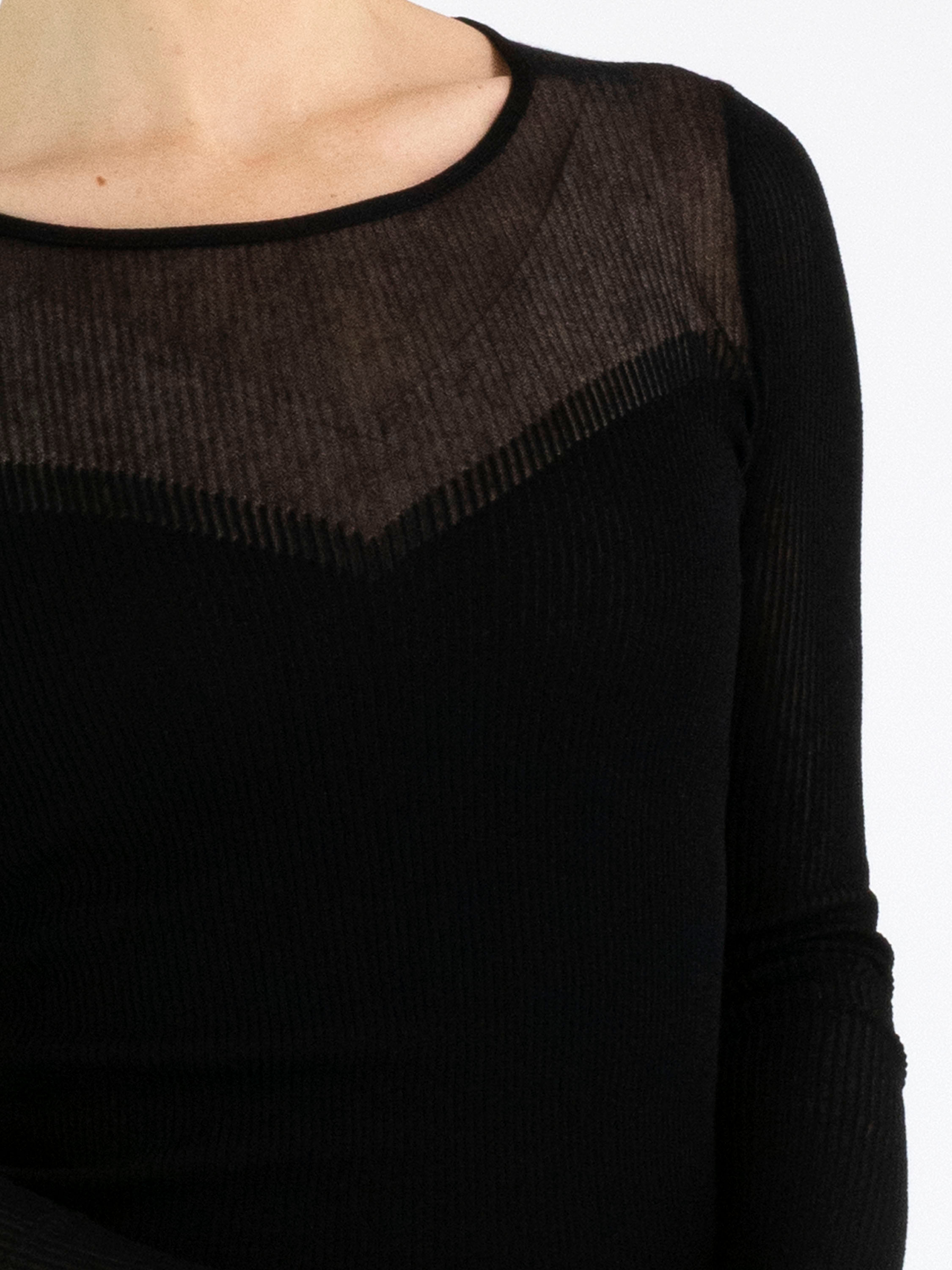 Un pull de Marc Cain à structure finement côtelée en noir. Le tissu est légèrement transparent jusqu’à la poitrine. Ce pull peut être lavé à 30 degrés.
