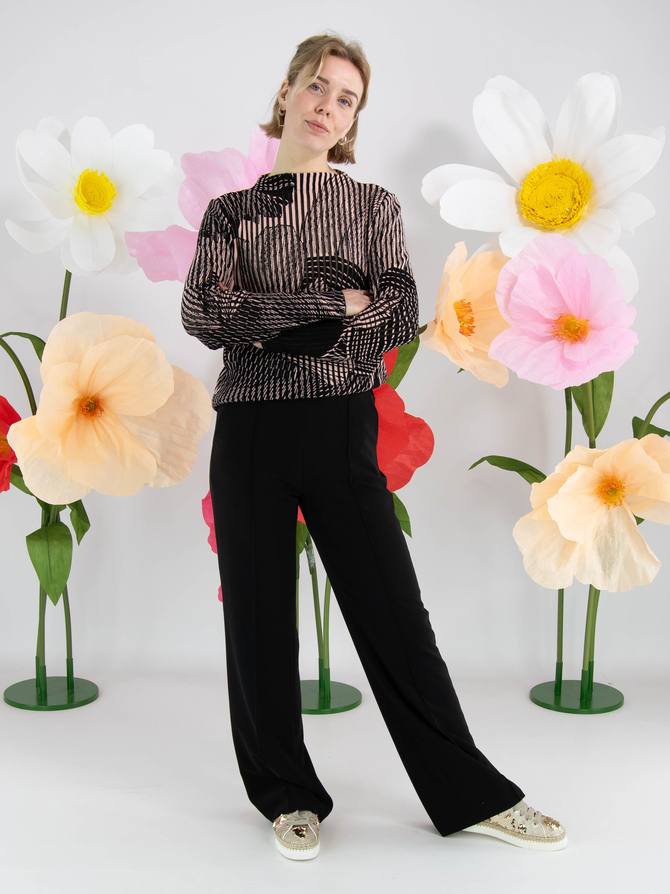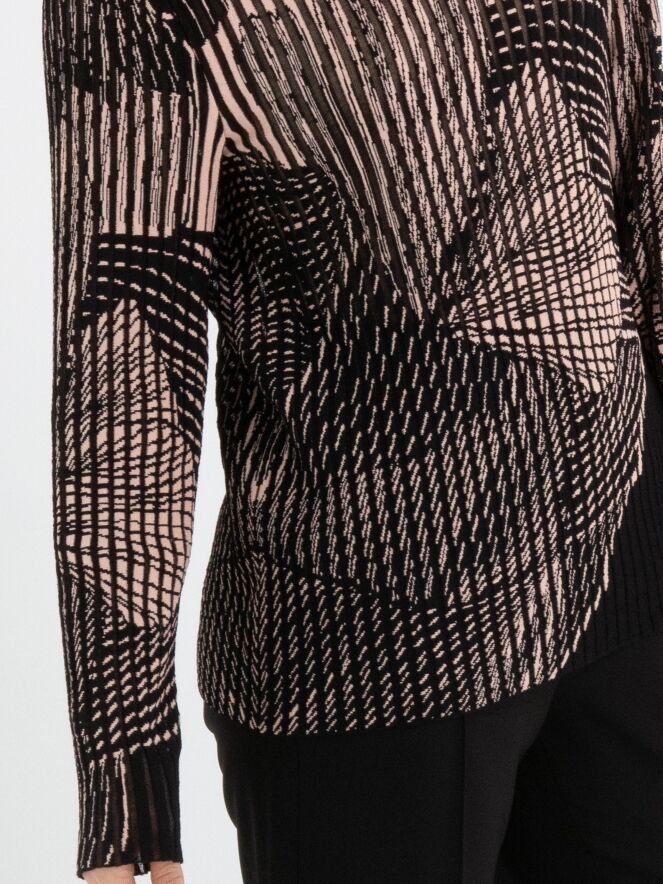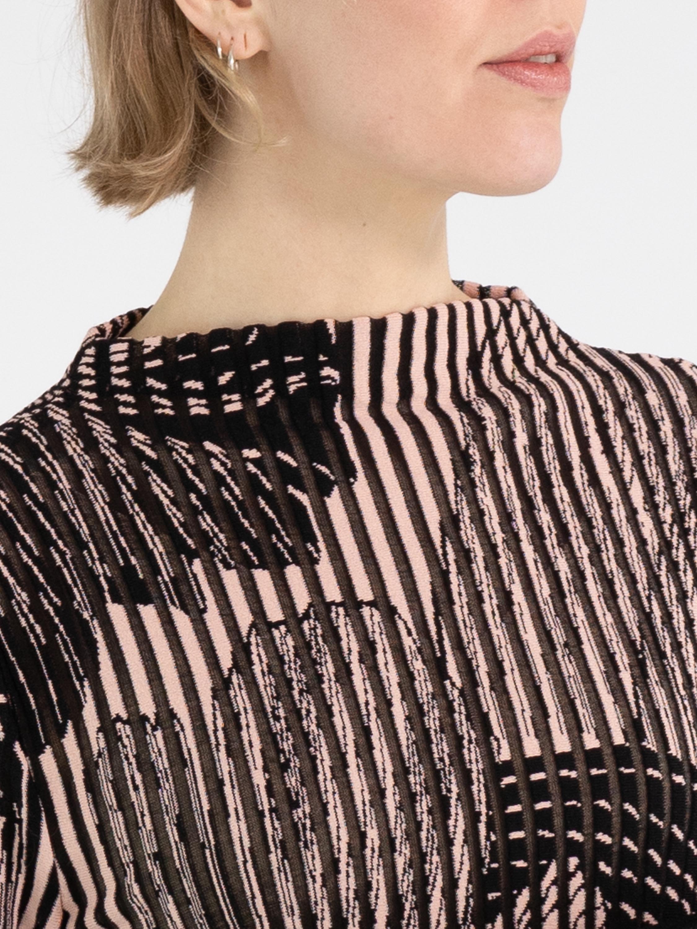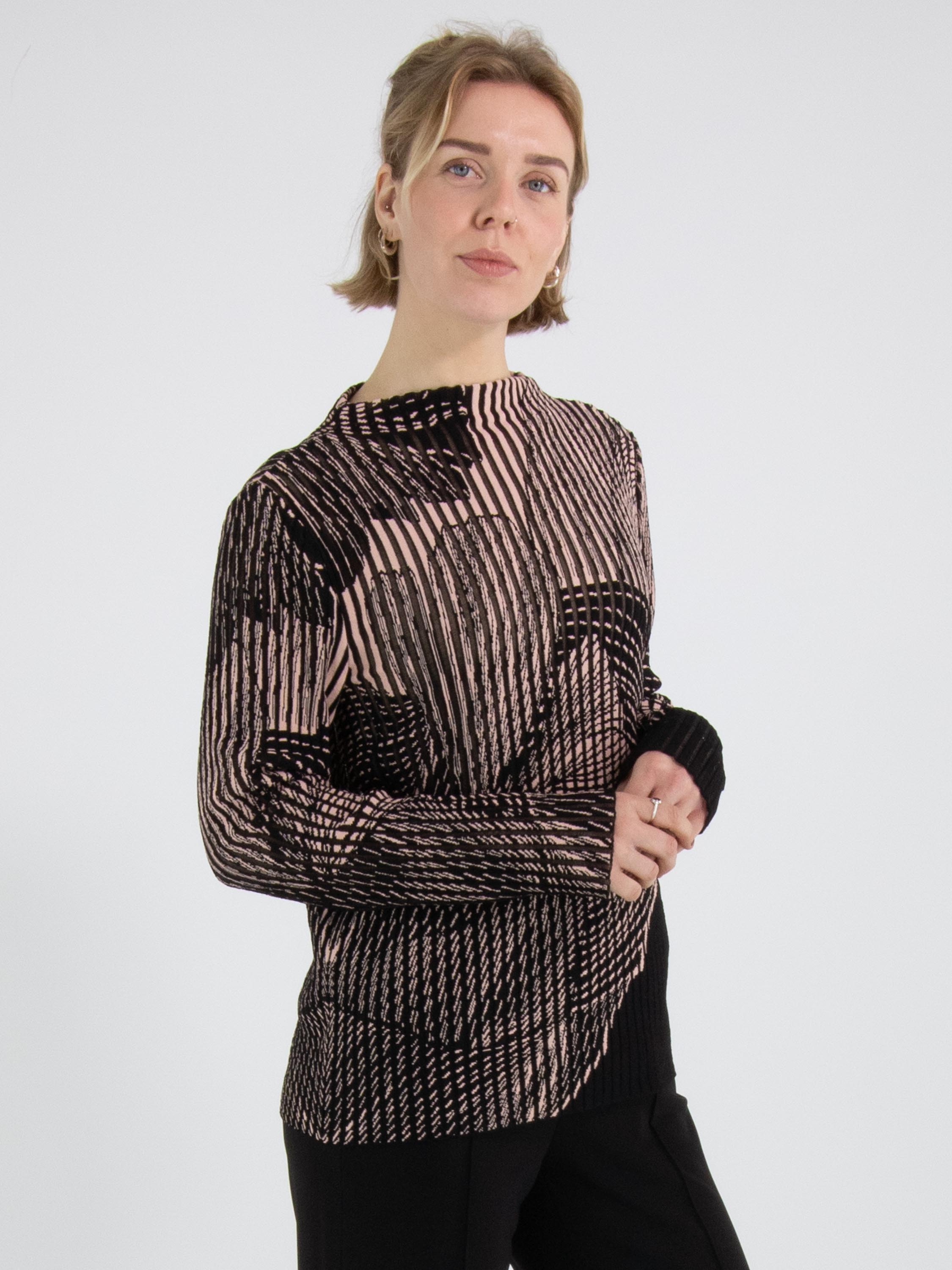 Un pull de Marc Cain avec une structure à rayures verticales, dont les intervalles sont légèrement transparents. Le pull présente un imprimé graphique d'une grande fleur en noir et rose doux. Il possède des manches longues et un col montant. Ce pull peut être lavé à 30 degrés.