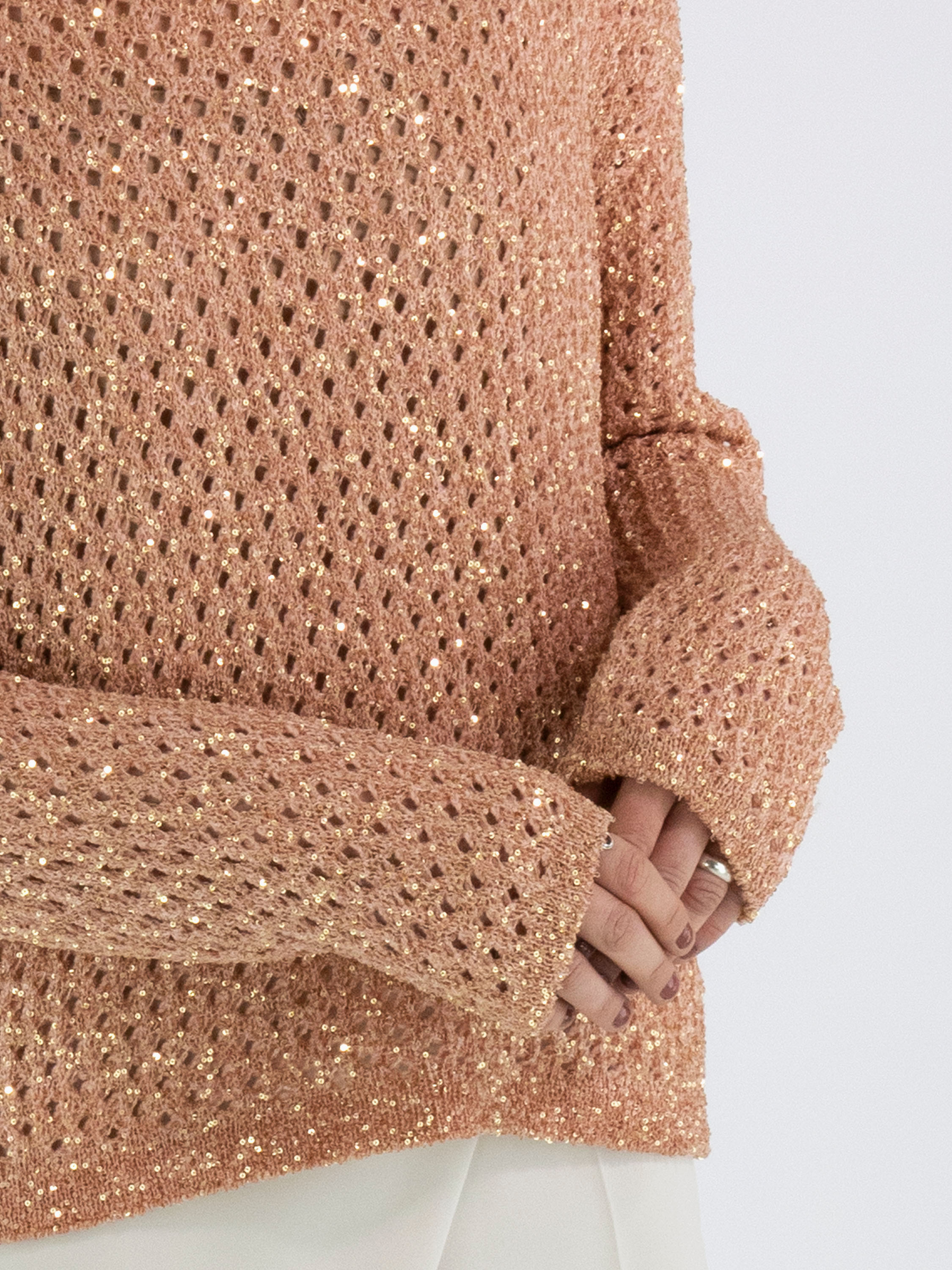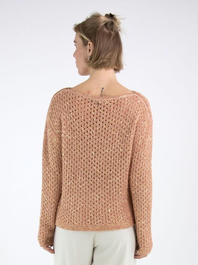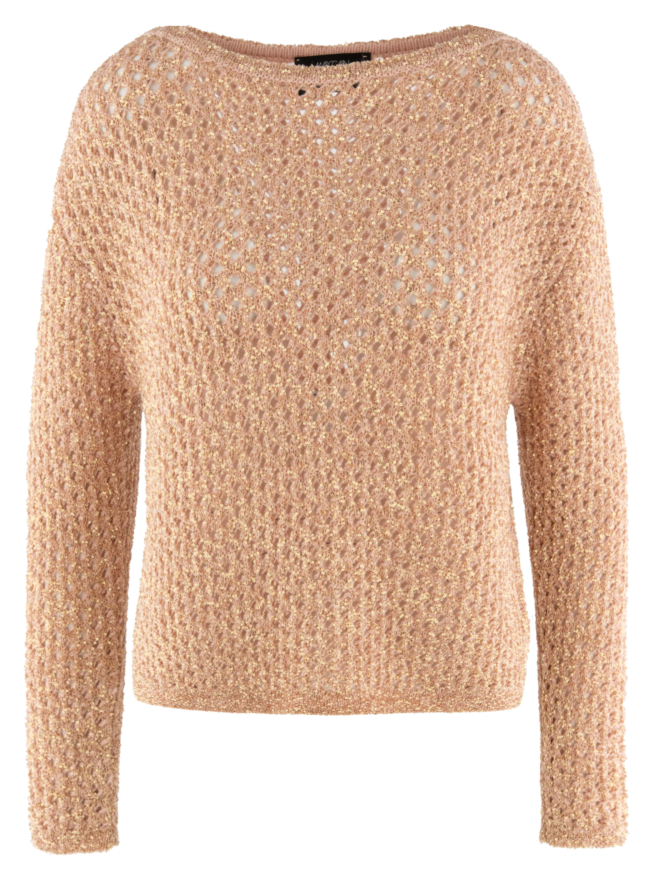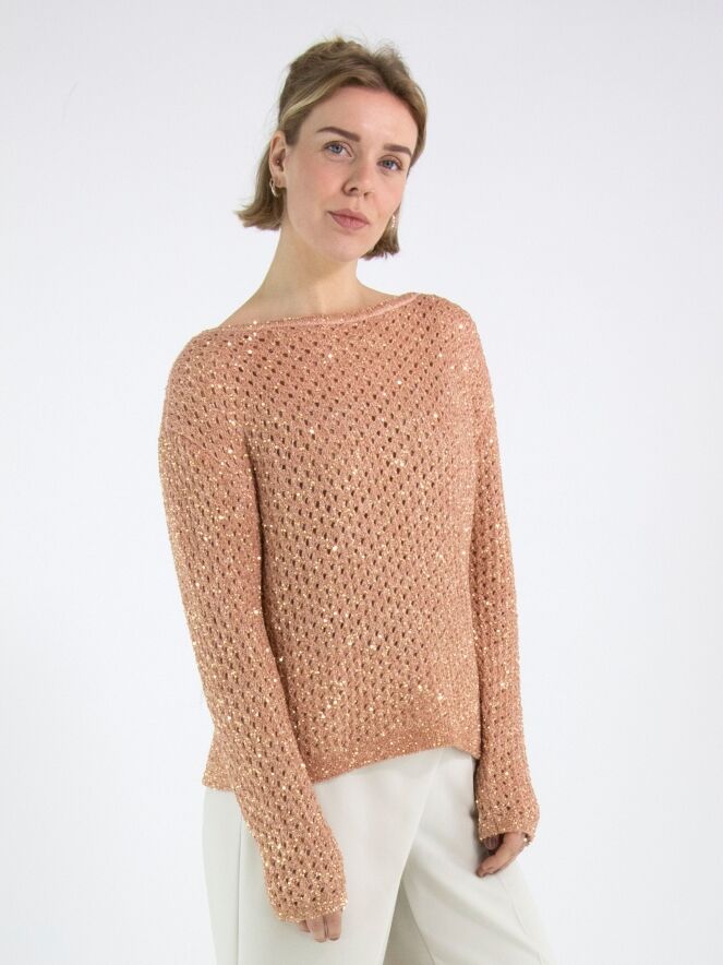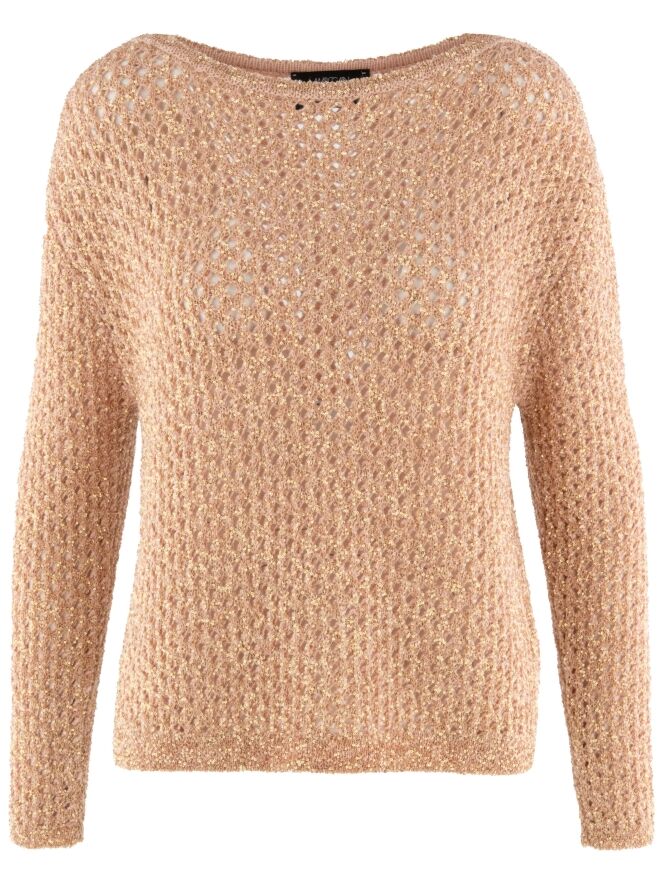 Un pull en maille ajourée de Marc Cain en rose saumon. Des paillettes dorées sont tissées dans la matière. Le pull possède un col rond et peut être lavé à la main.