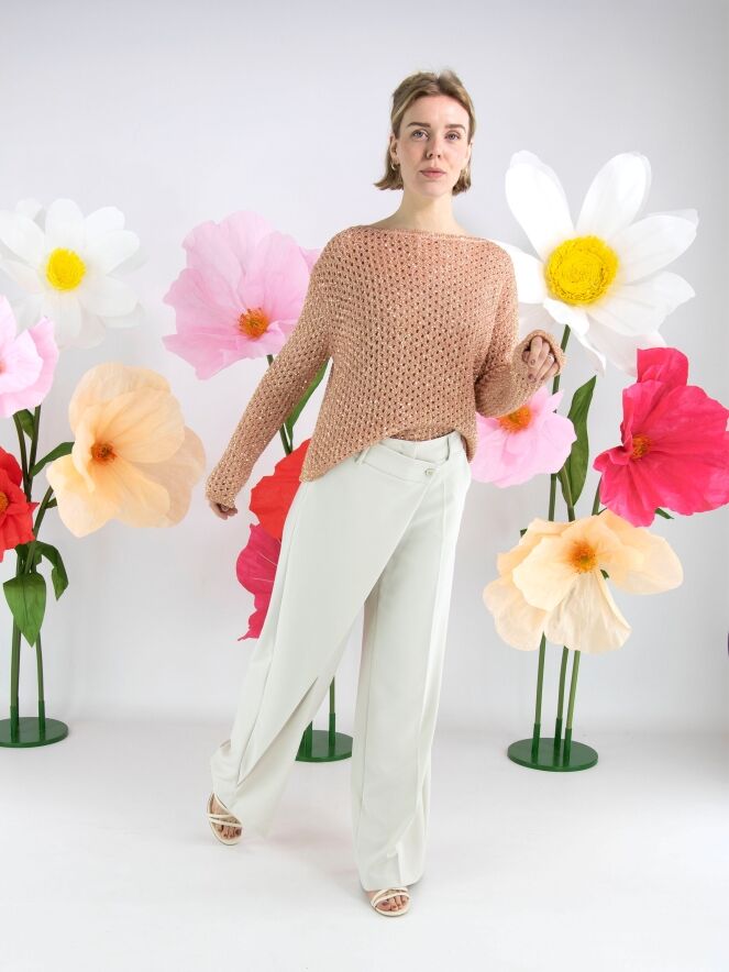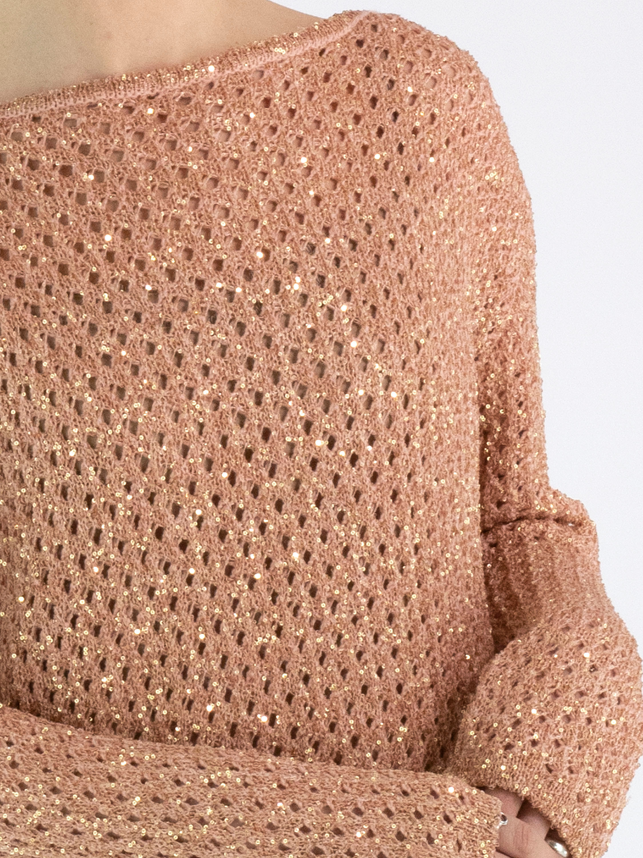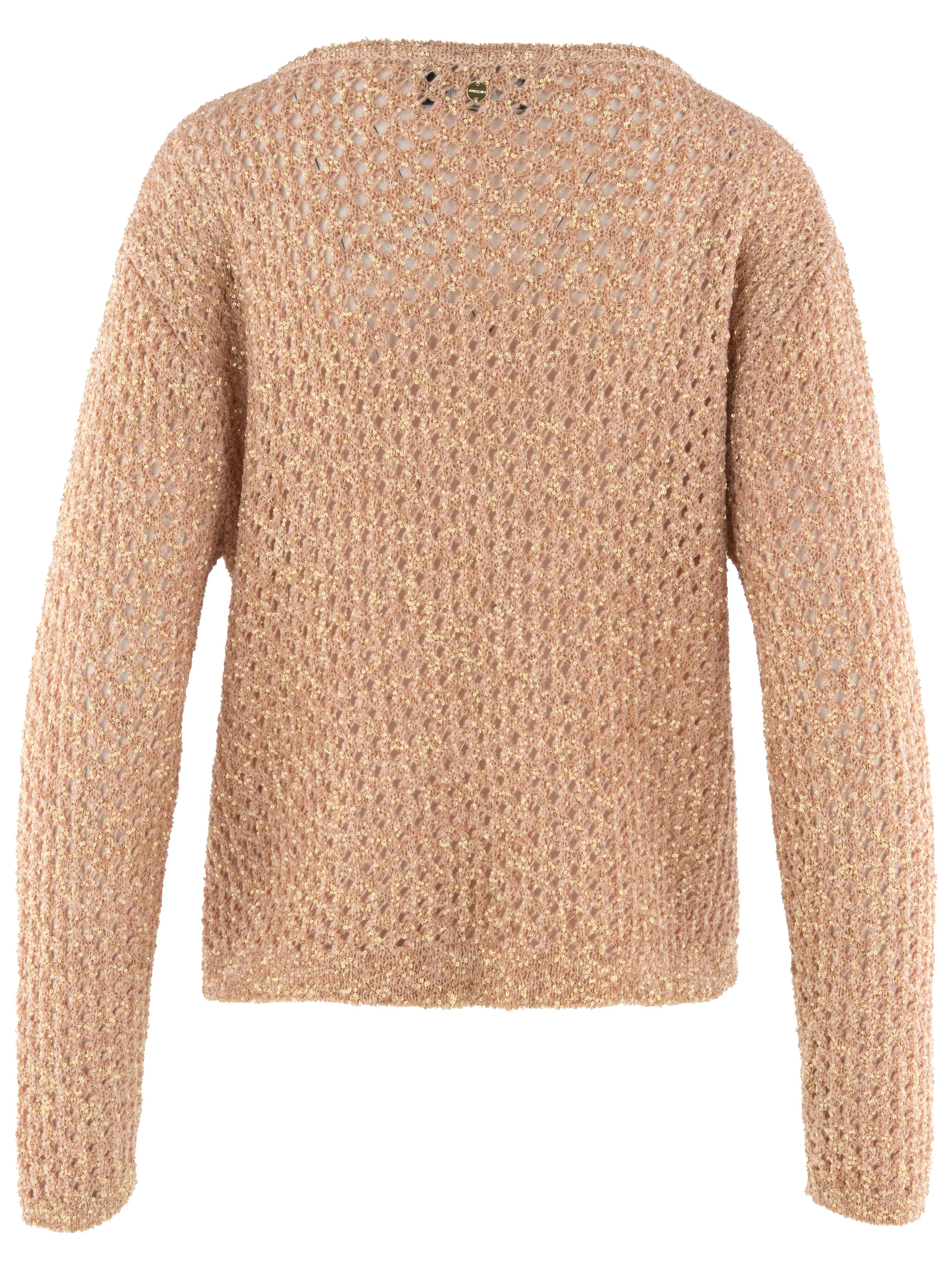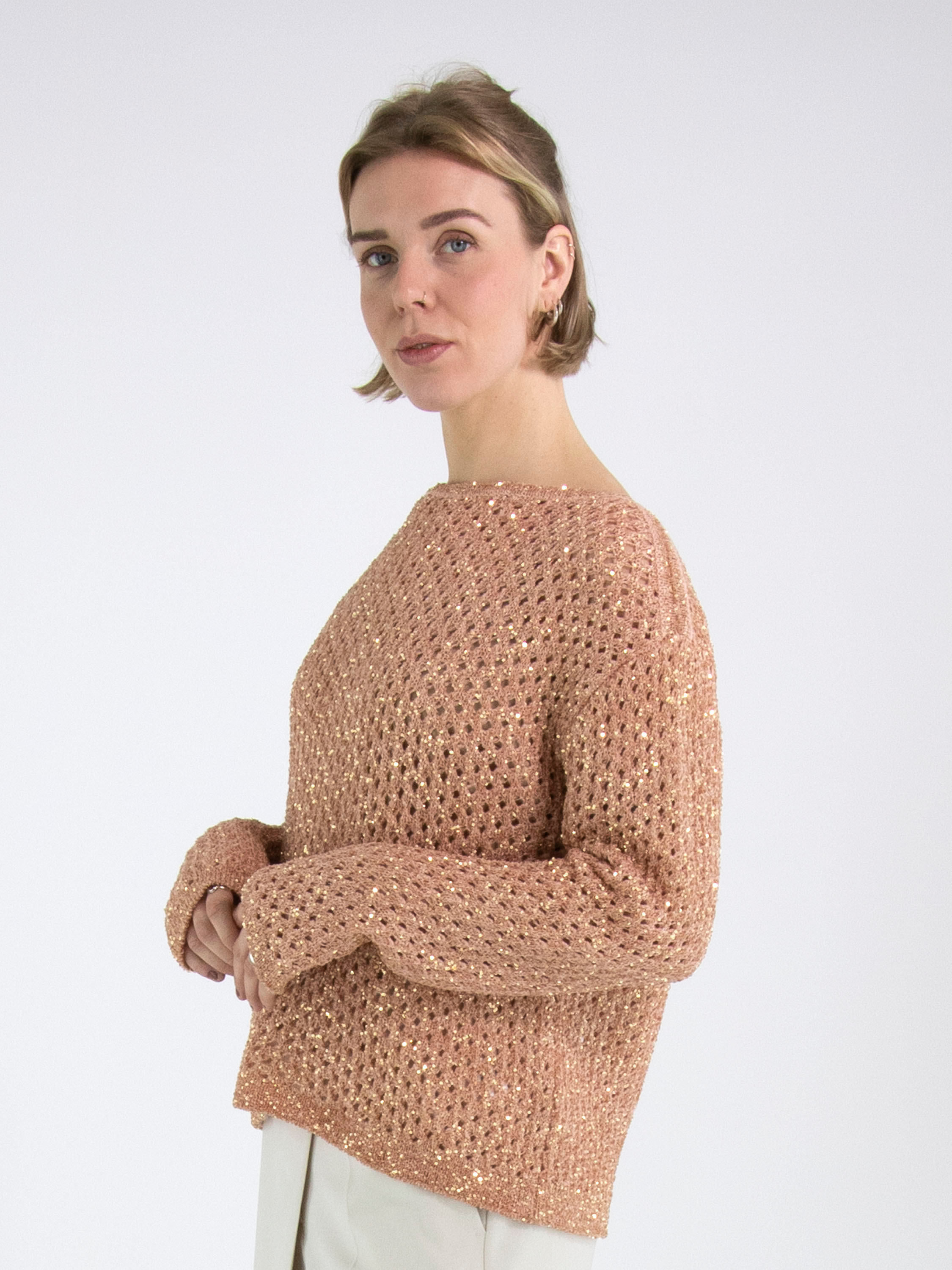 Un pull en maille ajourée de Marc Cain en rose saumon. Des paillettes dorées sont tissées dans la matière. Le pull possède un col rond et peut être lavé à la main.