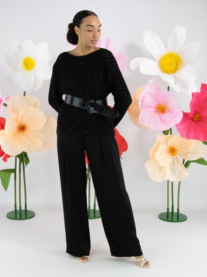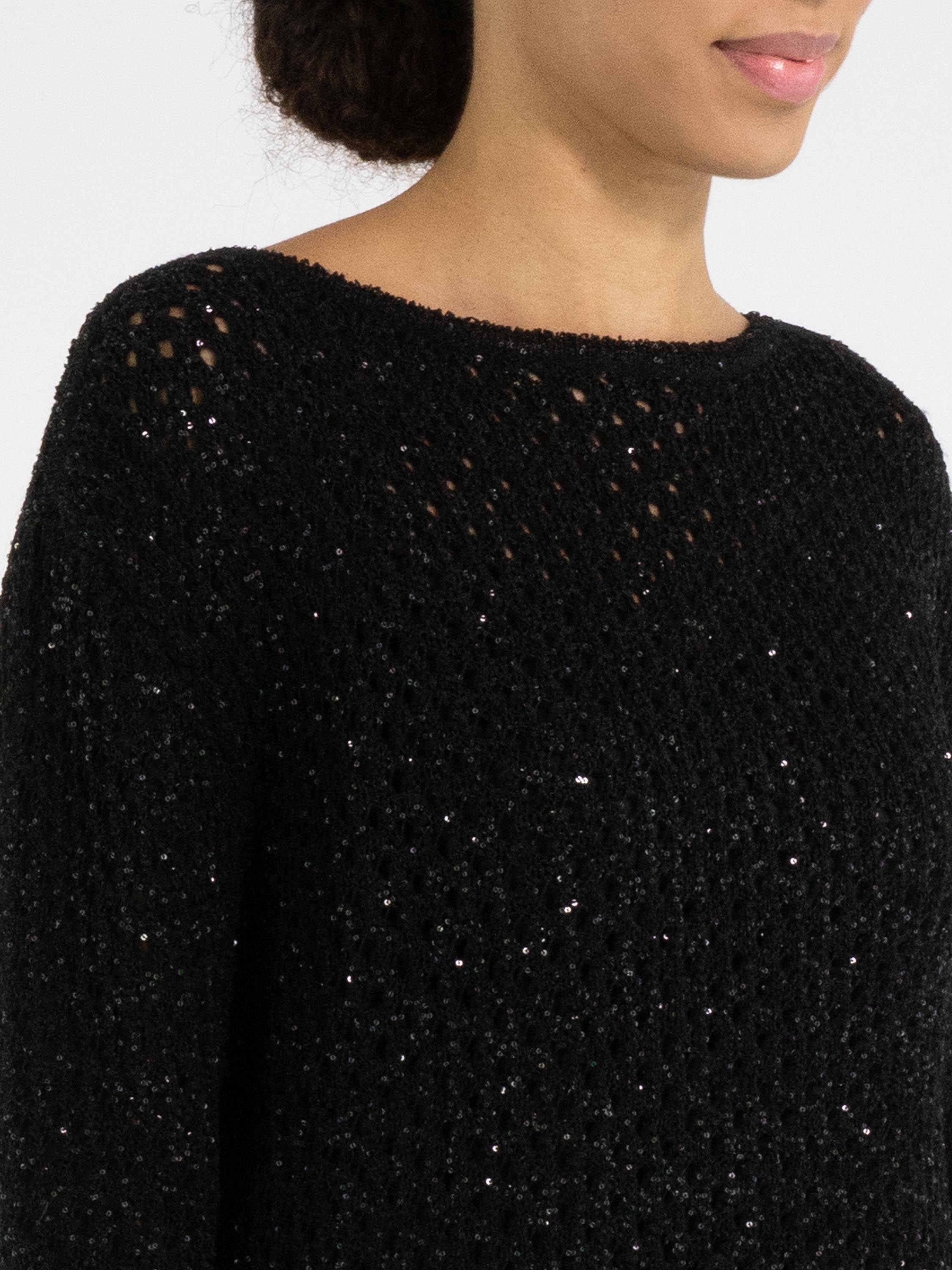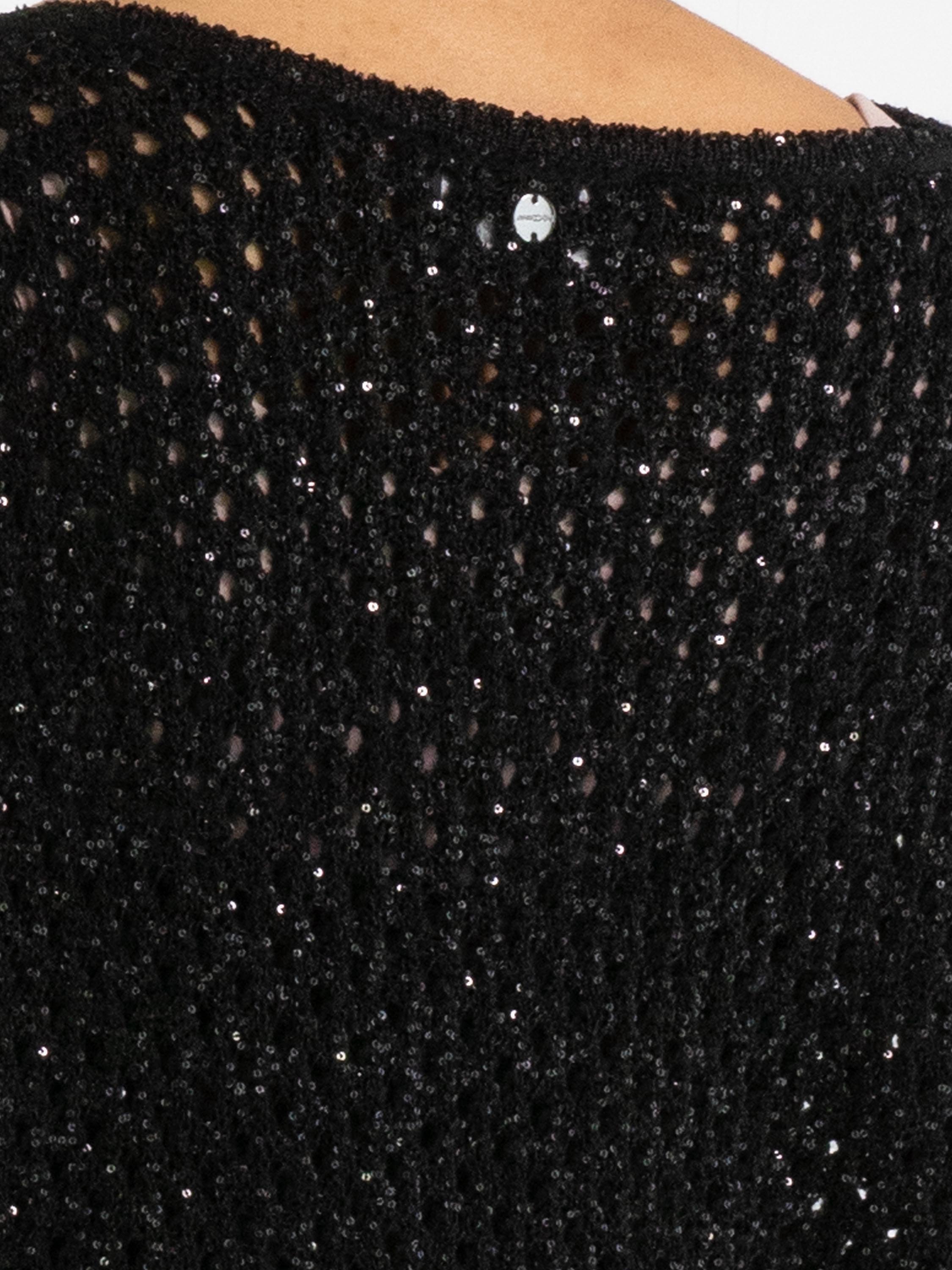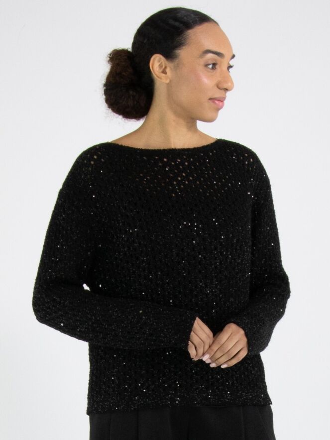 Un pull en maille ajourée de Marc Cain en noir. Des paillettes noires sont tissées dans la matière. Le pull possède un col rond et peut être lavé à la main.