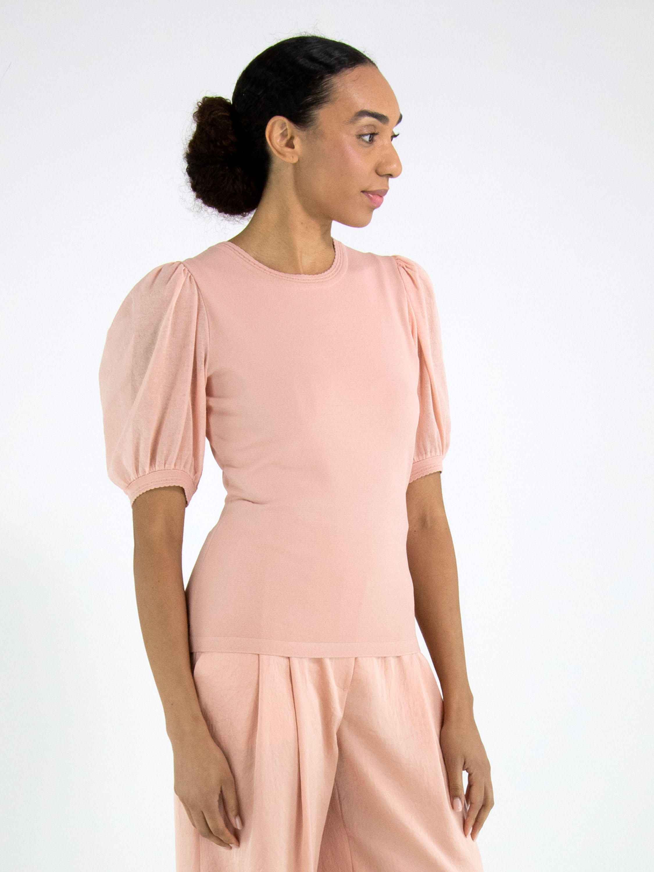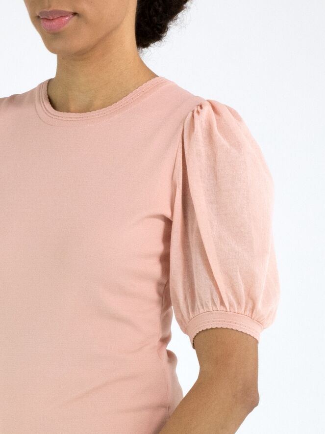 Un shirt de Marc Cain en rose saumon. Le shirt présente des manches bouffantes légèrement transparentes, dont le tissu est finement plissé à l’emmanchure et au poignet. L’encolure ronde est bordée d’un galon festonné. Ce shirt peut être lavé à 30 degrés.