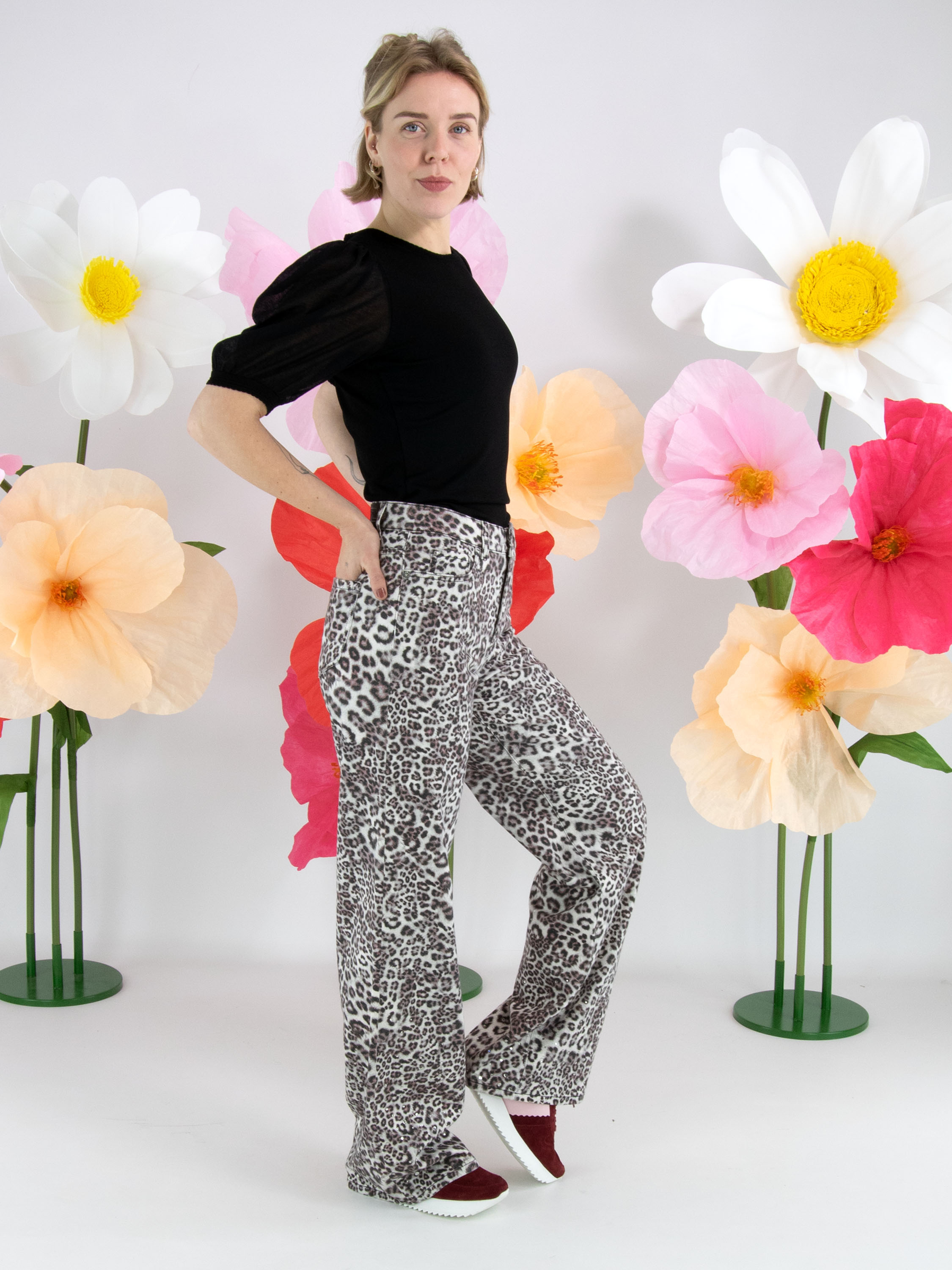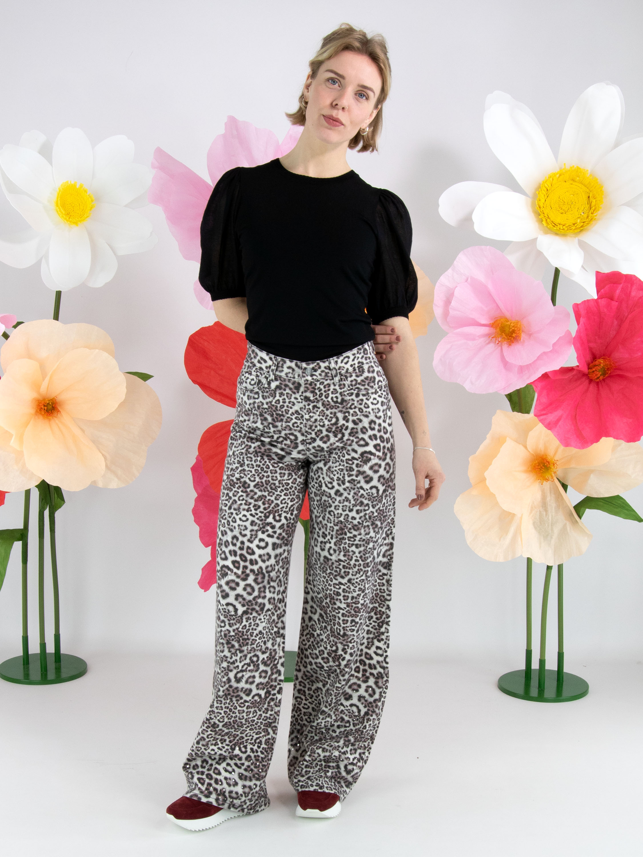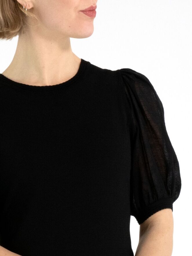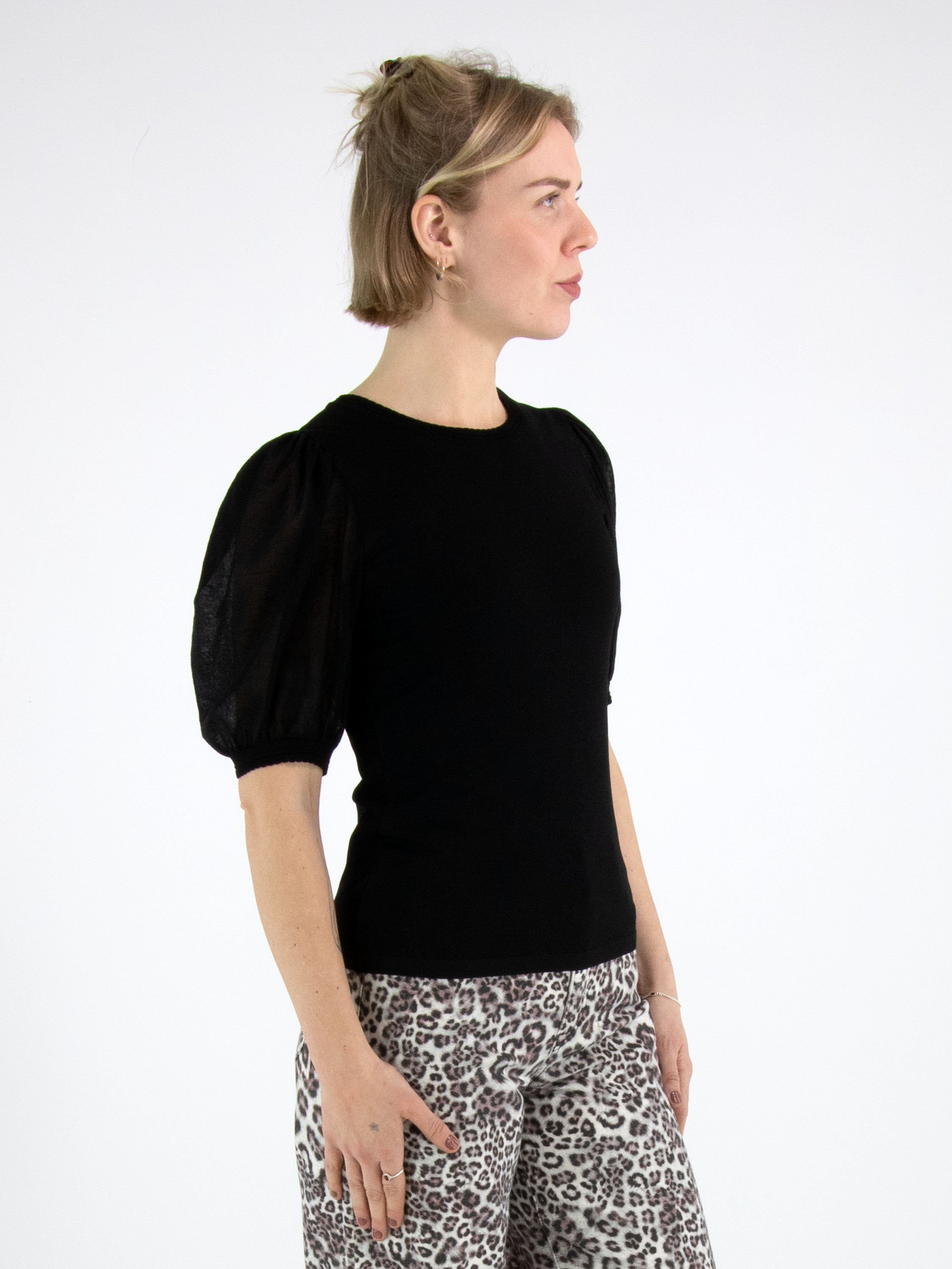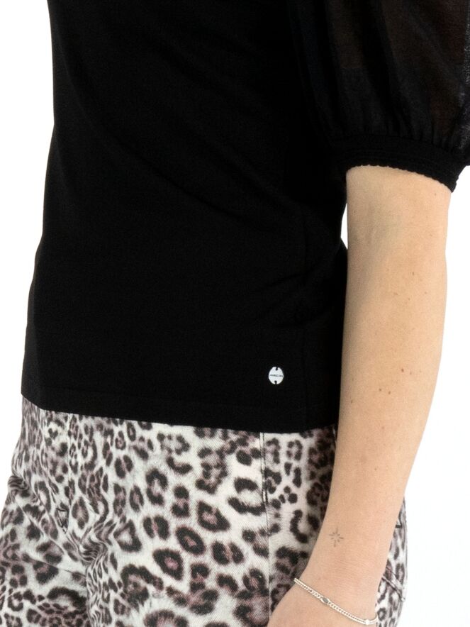Un shirt de Marc Cain en noir. Le shirt possède des manches bouffantes légèrement transparentes, dont le tissu est finement plissé à la tête de manche et au bord du poignet. Le long de l’encolure ronde se trouve un bord festonné. Ce shirt peut être lavé à 30 degrés.