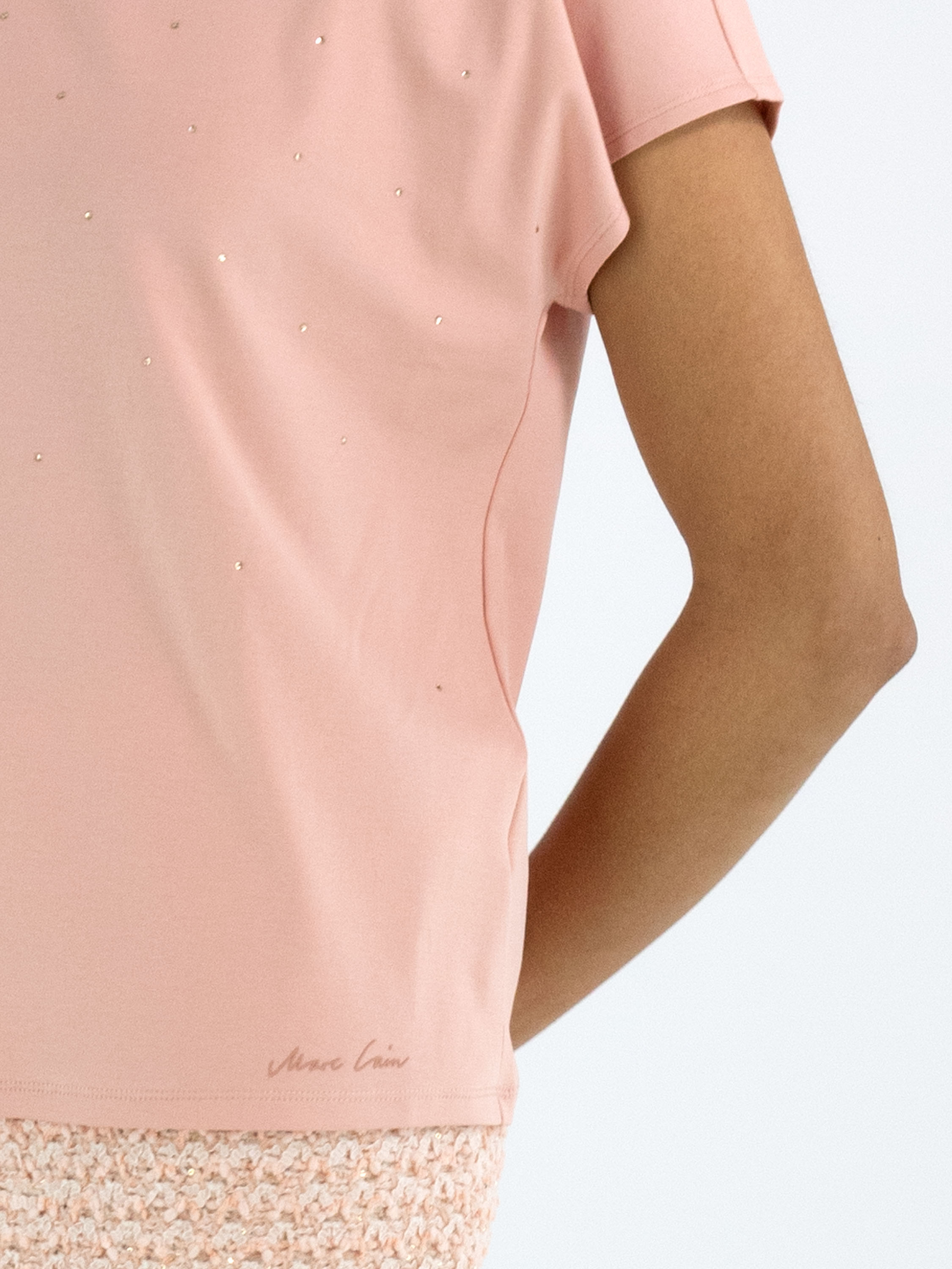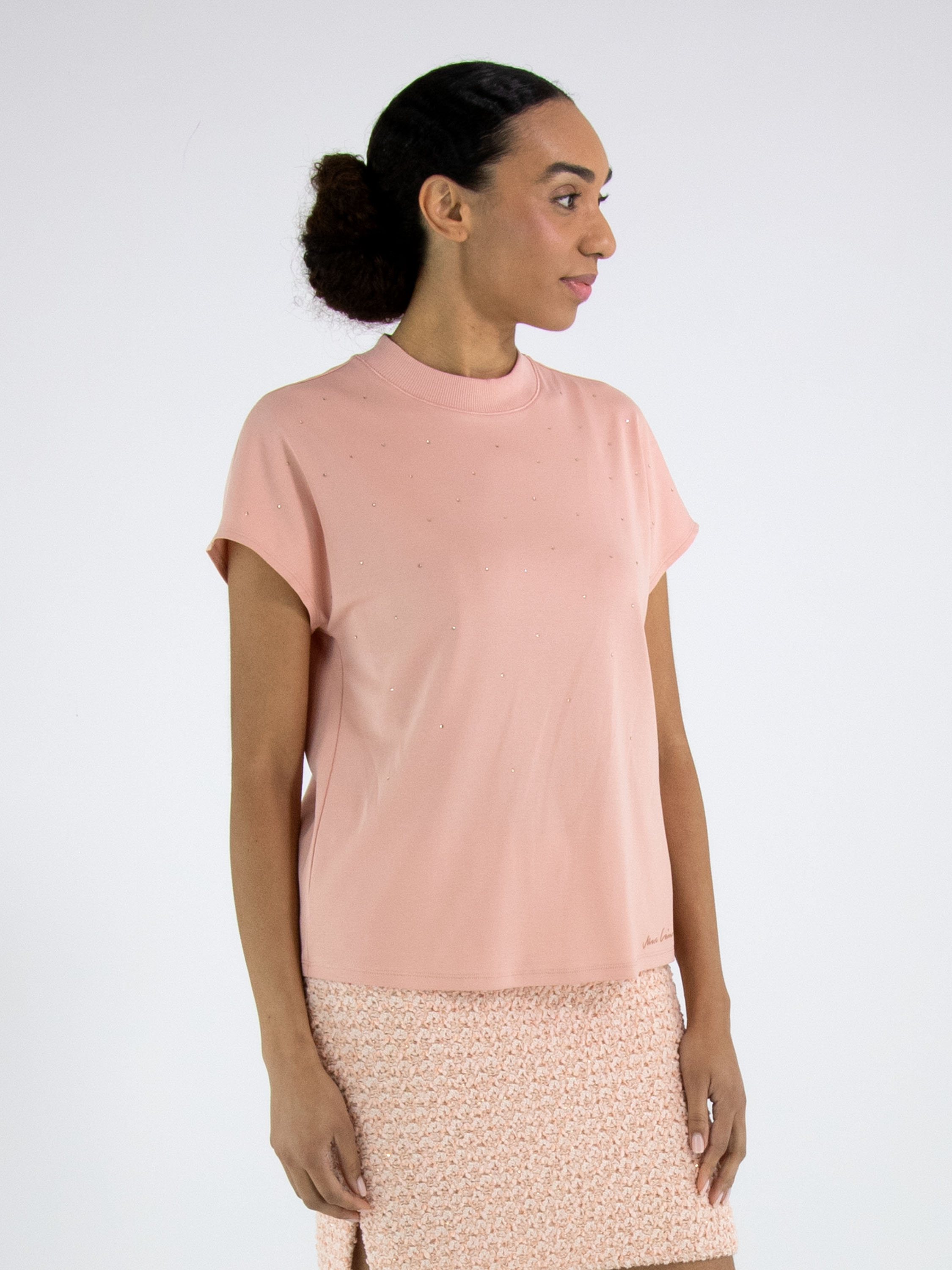 Un shirt de Marc Cain en rose saumon. Des strass décoratifs sont dispersés sur le devant. Le bord du col rond montant est fini d’une bande en maille finement côtelée. Le shirt possède des manches cap et peut être lavé à 30 degrés.