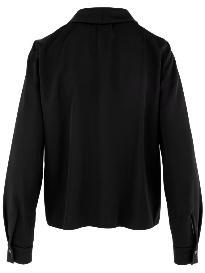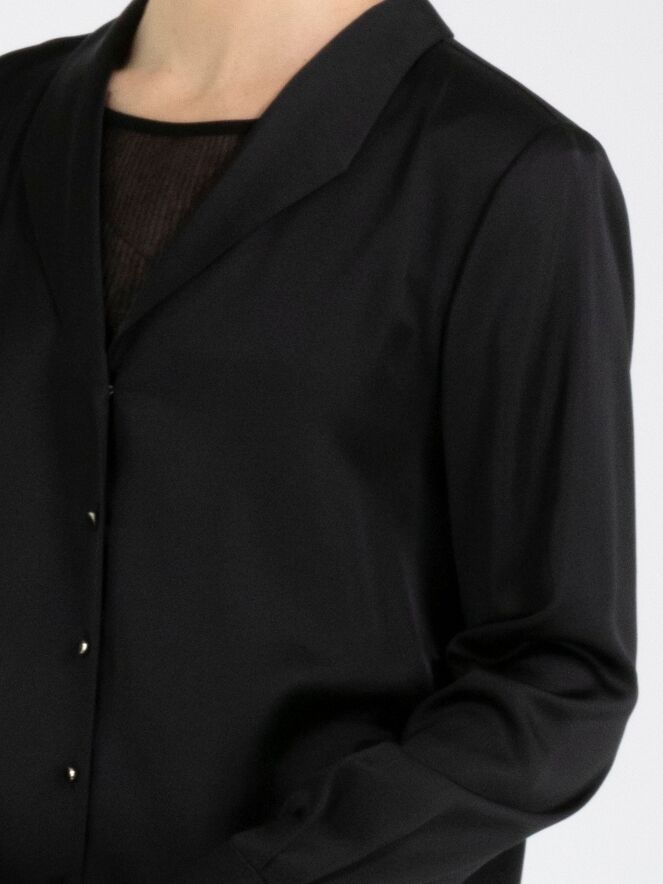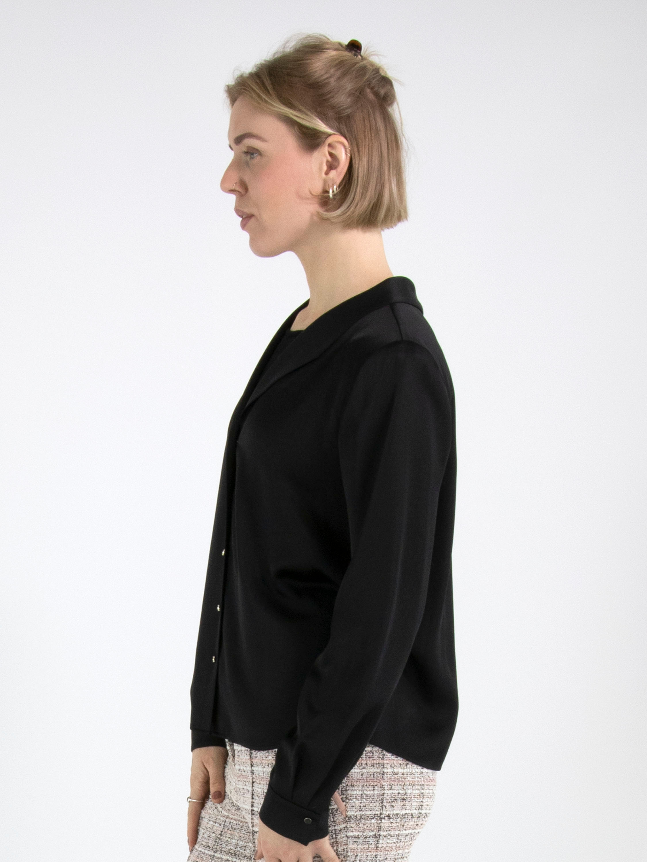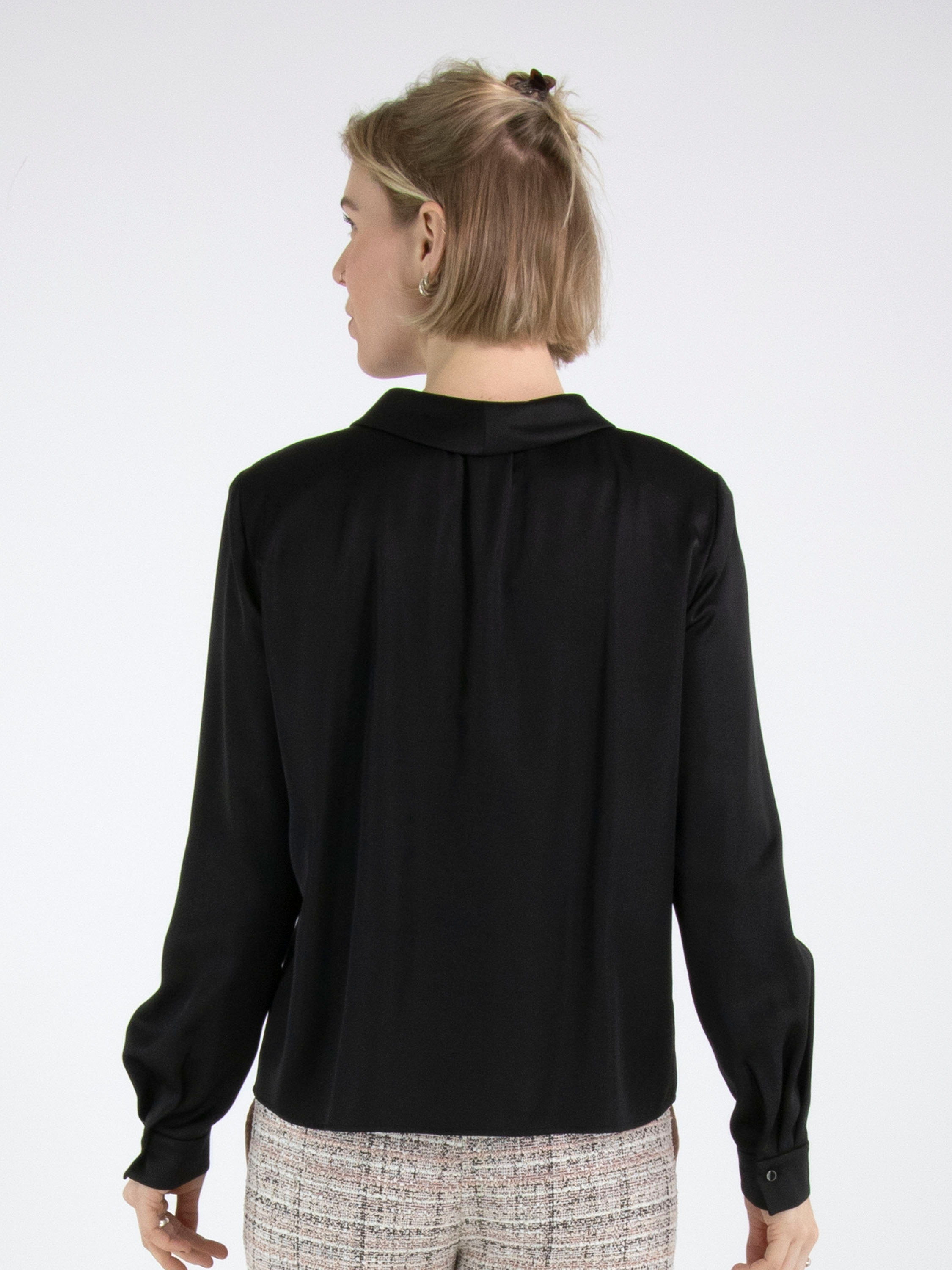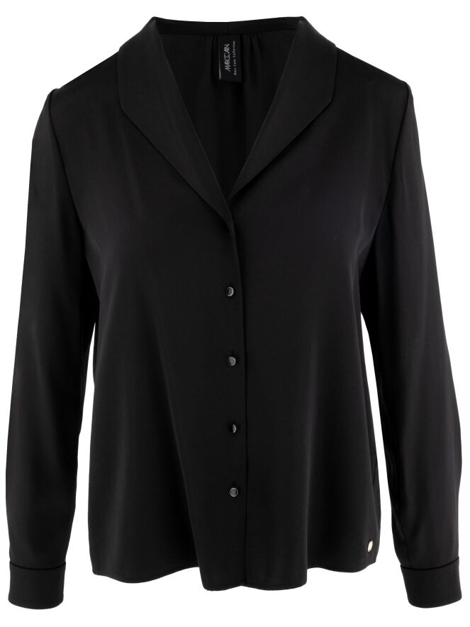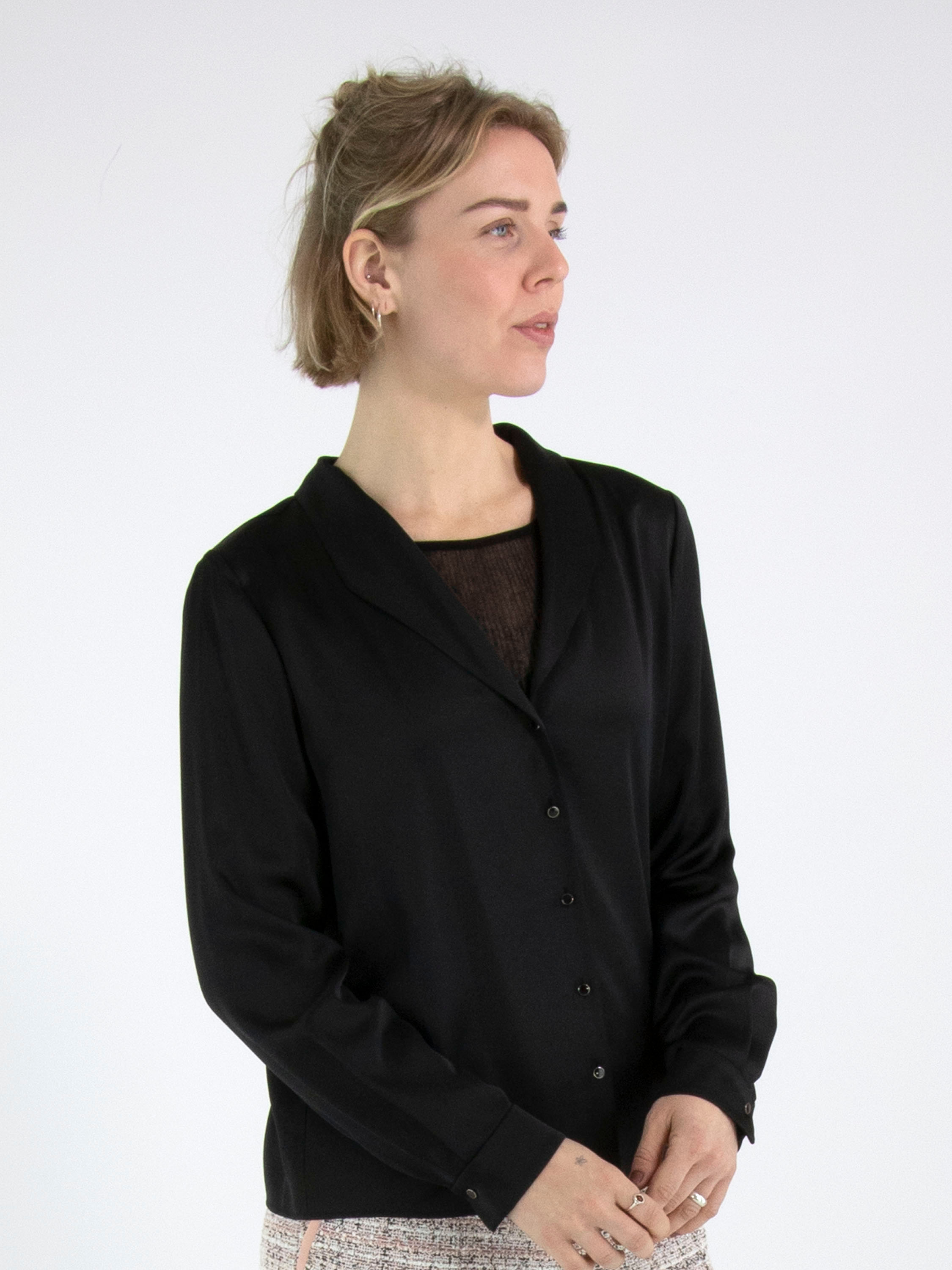 Une blouse de Marc Cain en tissu satiné mat de couleur noire. La blouse possède une fermeture à boutons. Au niveau des poignets, le tissu comporte plusieurs plis. Cette blouse peut être lavée à 30 degrés.