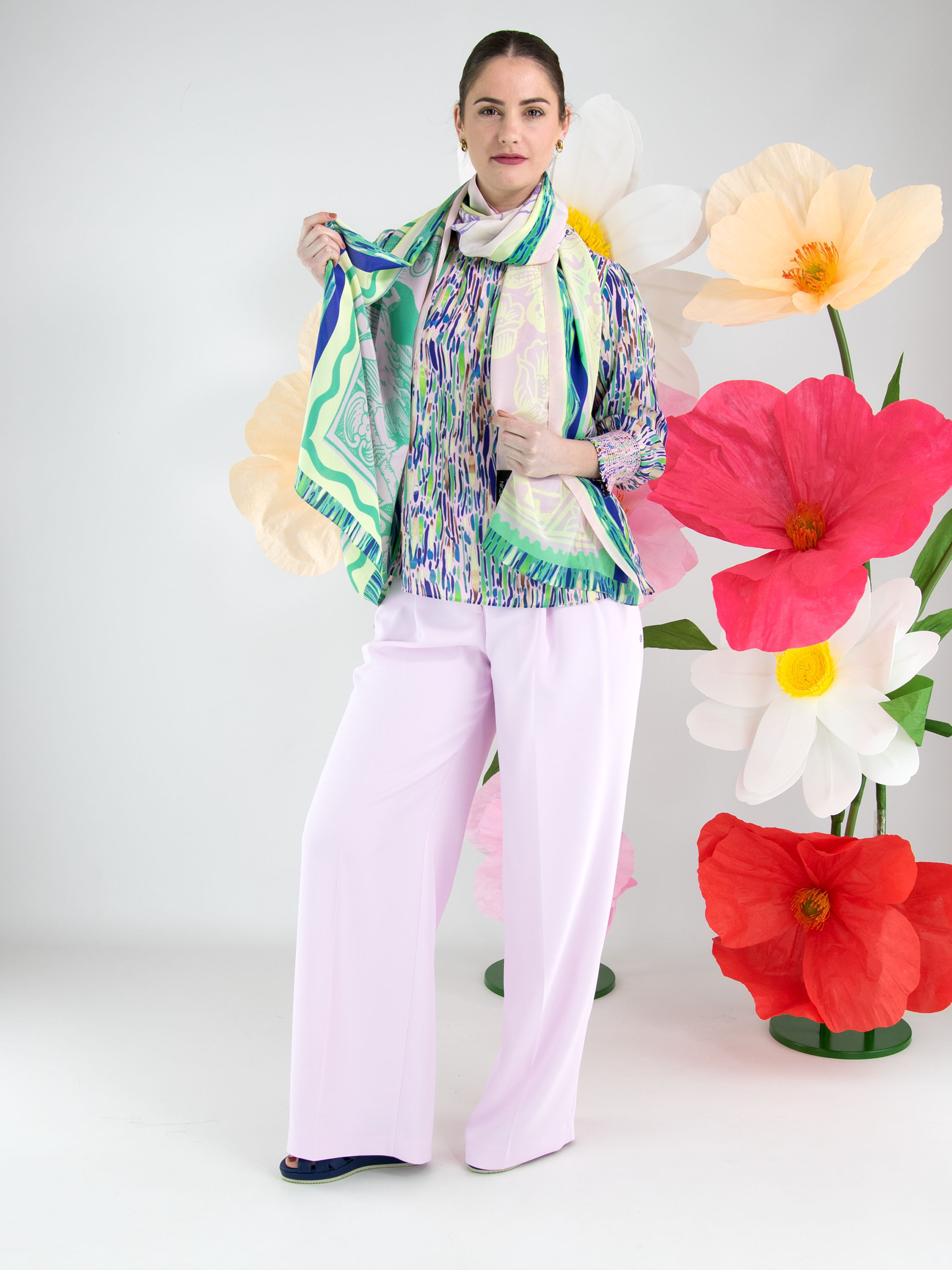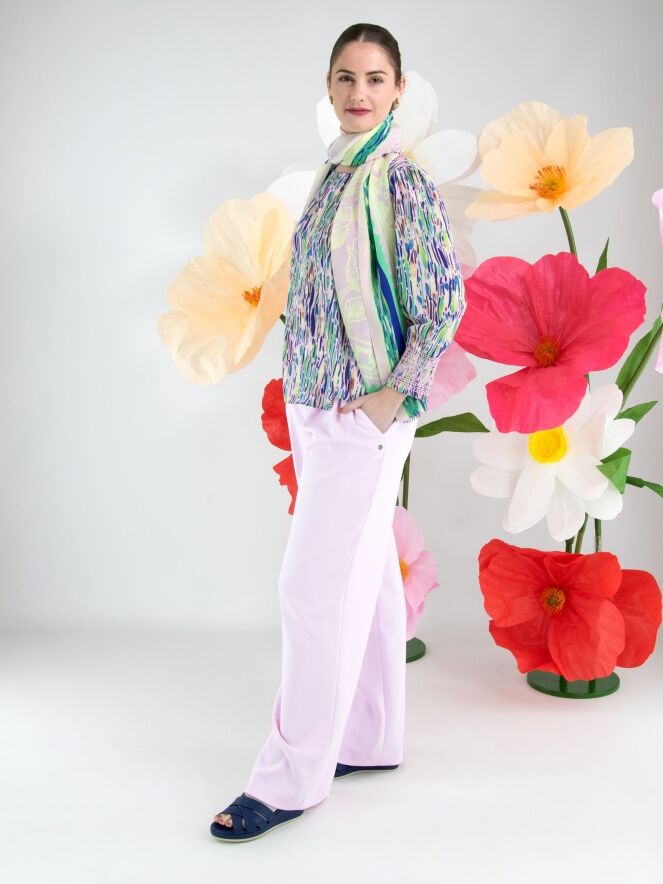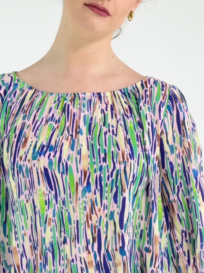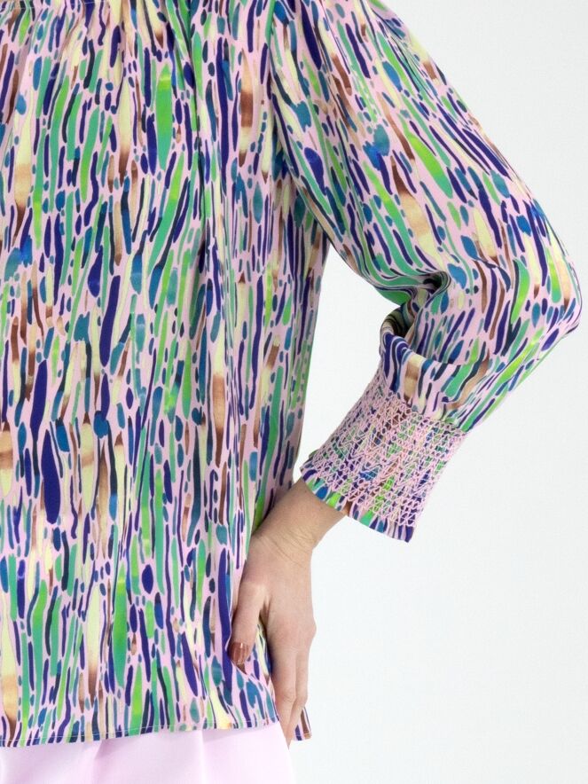 Un tee-shirt de Marc Cain avec un imprimé confetti dans plusieurs nuances de vert, de bleu et de brun sur un fond rose pastel. Le tissu est légèrement plissé le long de l’encolure ronde. Les extrémités des manches mi-longues sont dotées de larges poignets avec des finitions smockées élastiques aux motifs variés. Ce tee-shirt peut être lavé à 30 degrés.